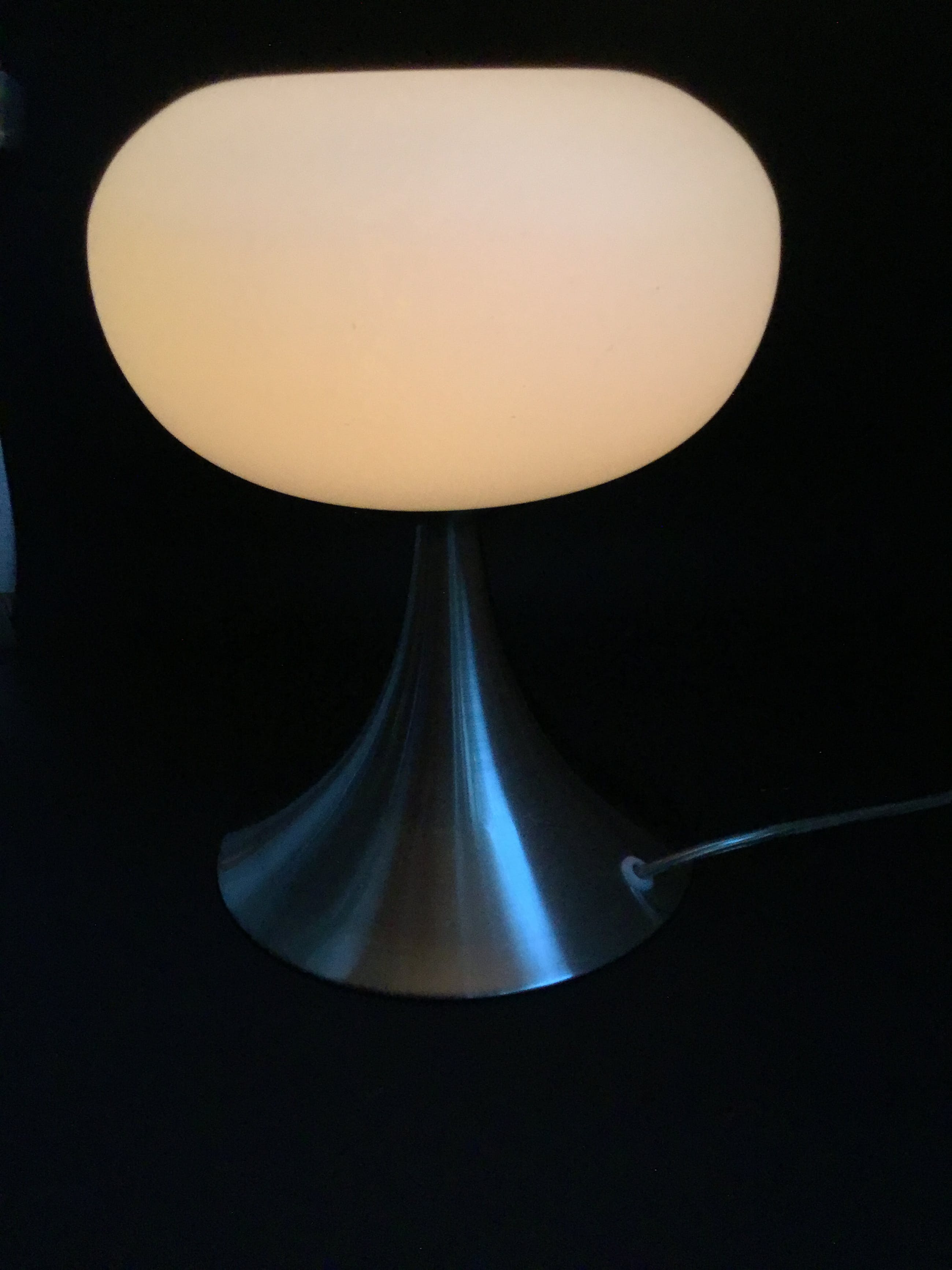 Space-age mushroom lamp. De lamp heeft een touch-bediening, waarmee de loop in drie standen in te stellen is. De lamp functioneert goed. De diameter van de voet is 19cm, de glazen kap heeft een diameter van 24 cm.