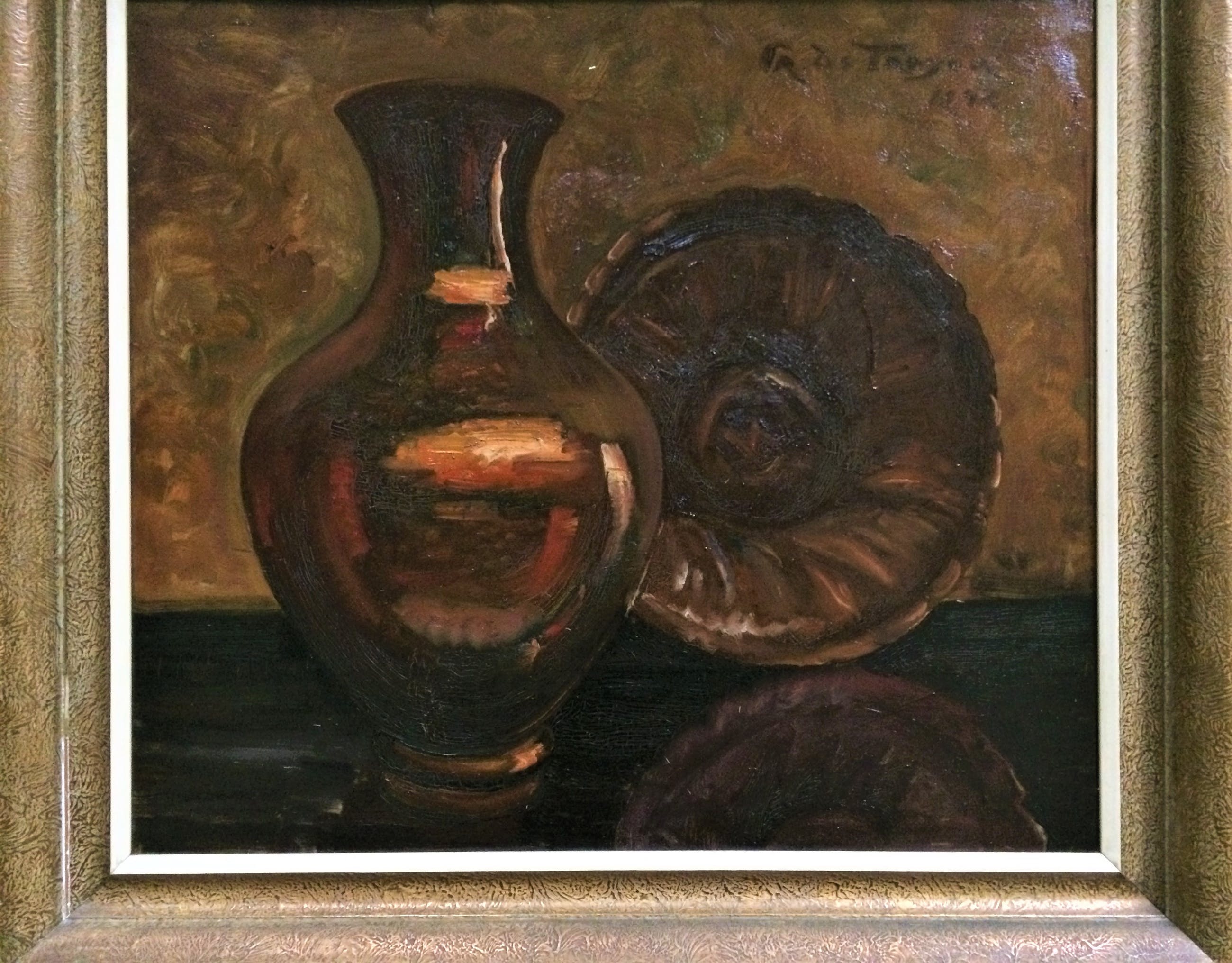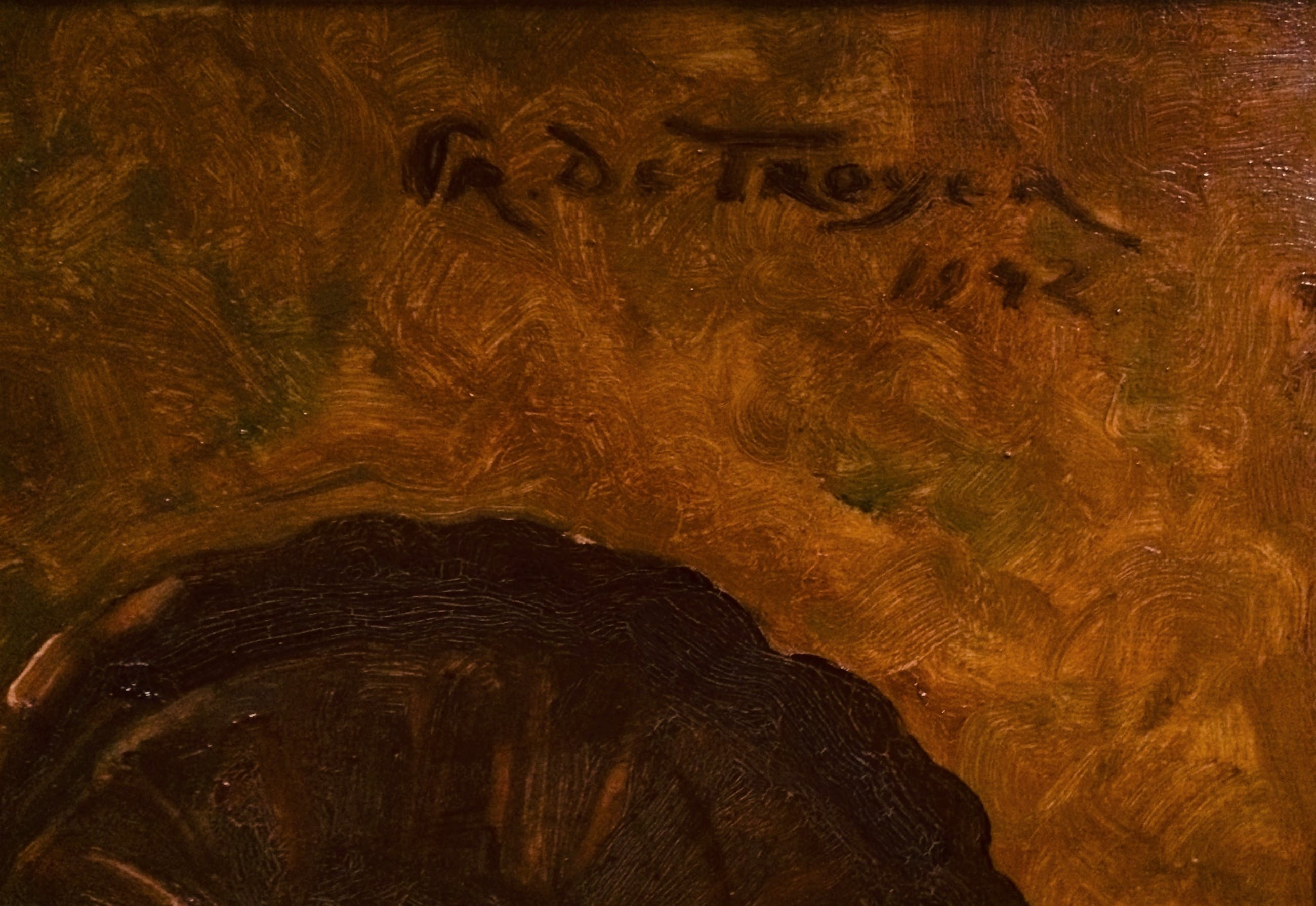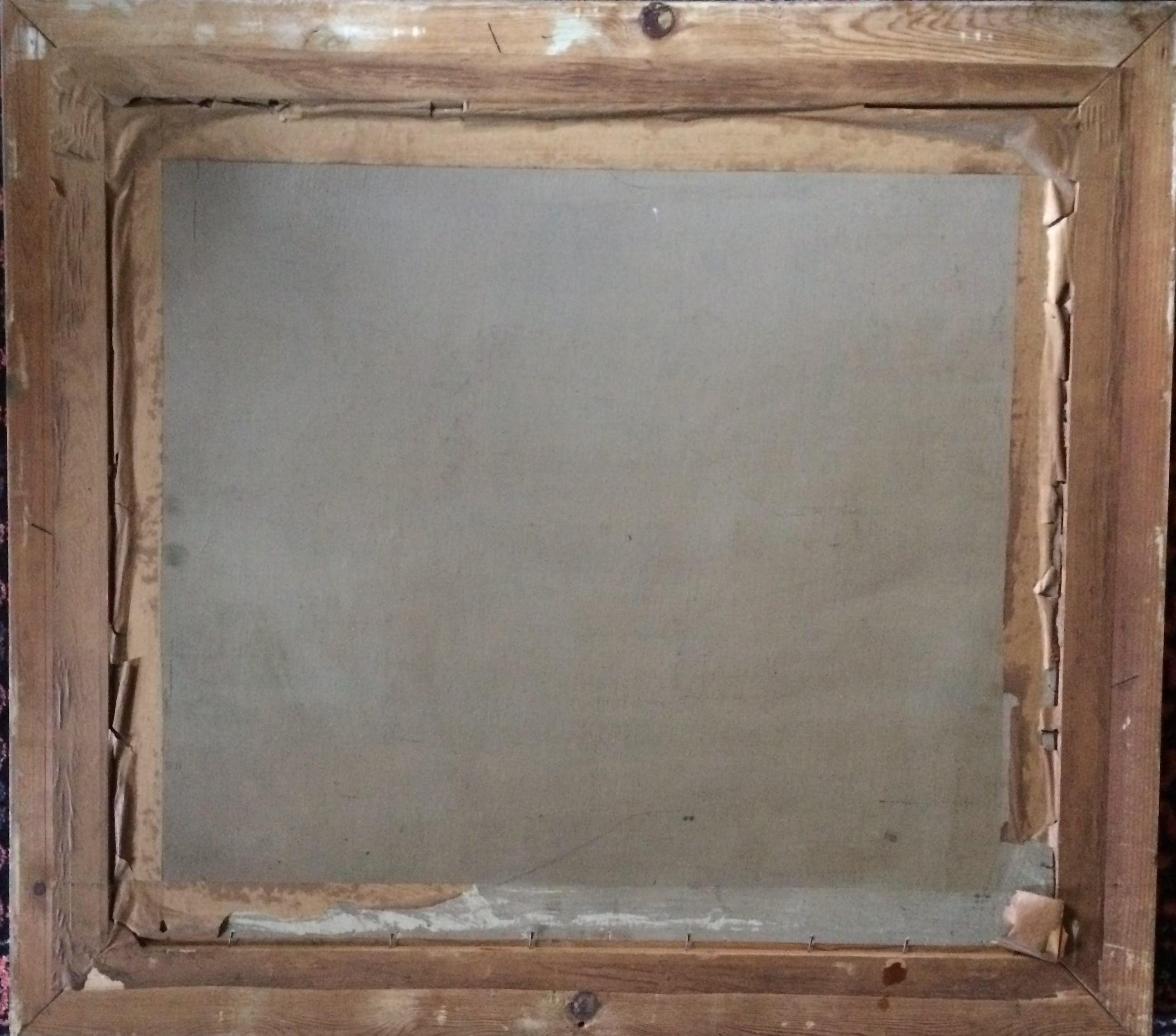 aangeboden olieverf op paneel ouderdomssporen algemeen zie duidelijke foto's ingekaderd. gesigneerd bovenaan met datum. geen herstellingen. afmetingen paneel 75 cm x 68 cm met kader 90 cm x 83 cm