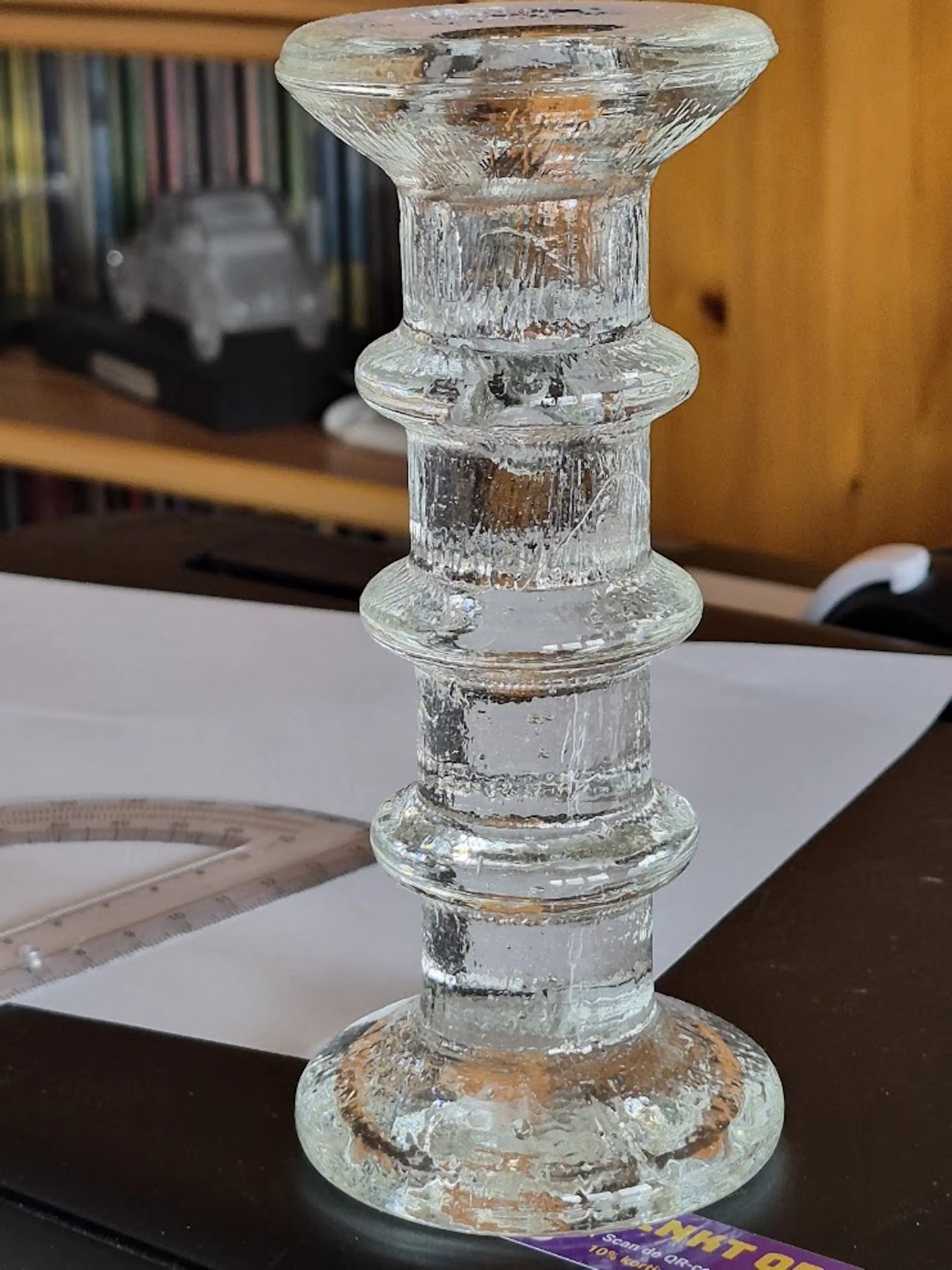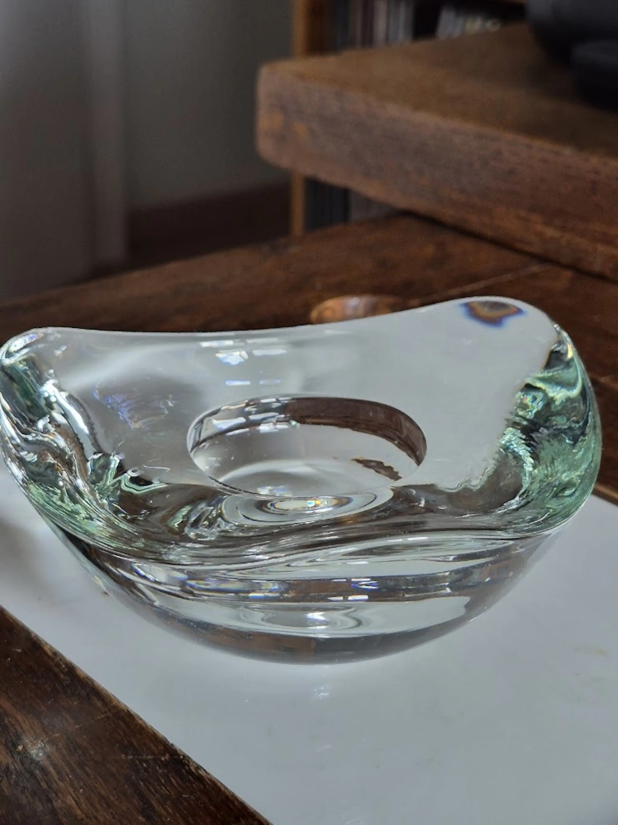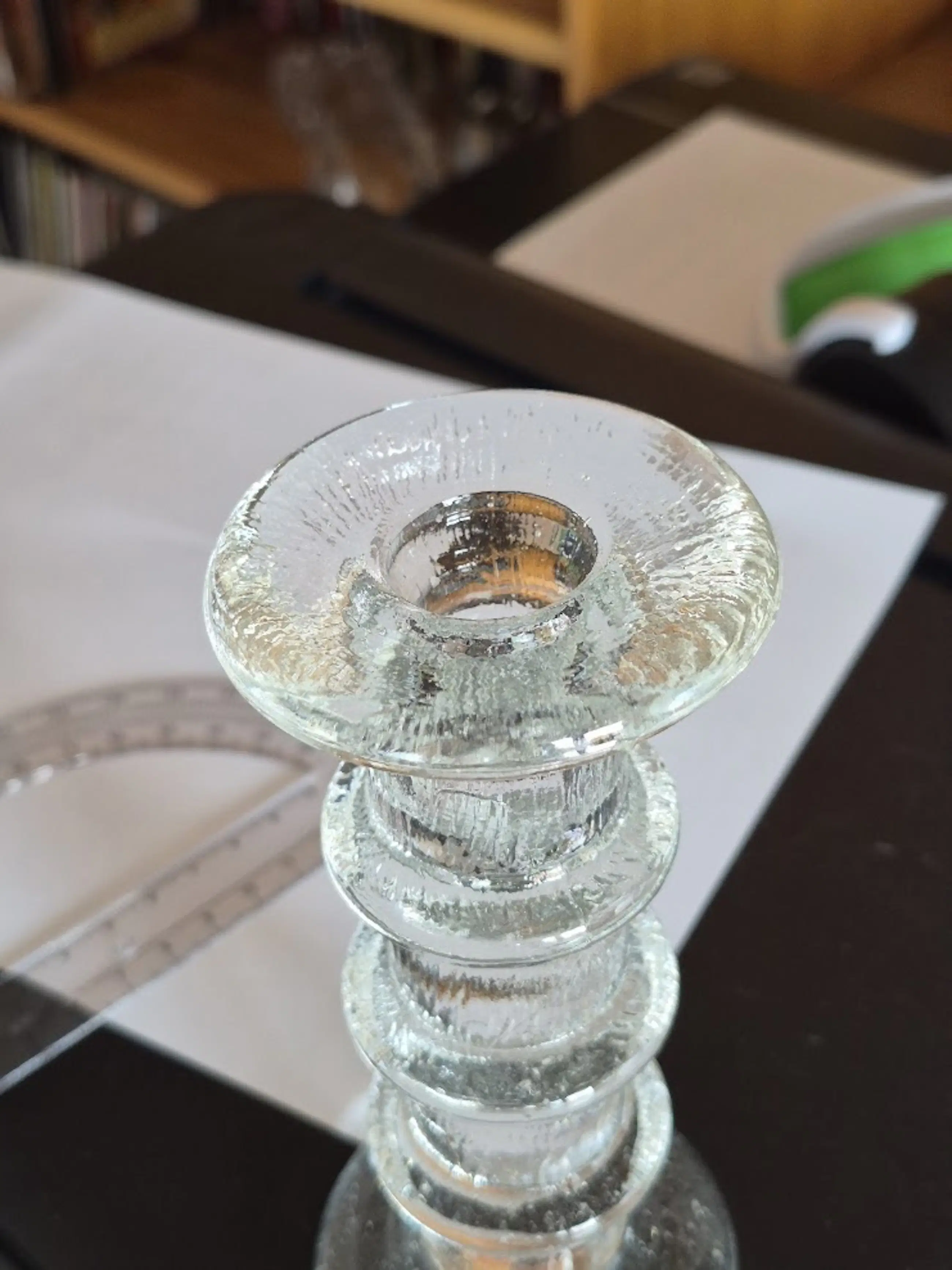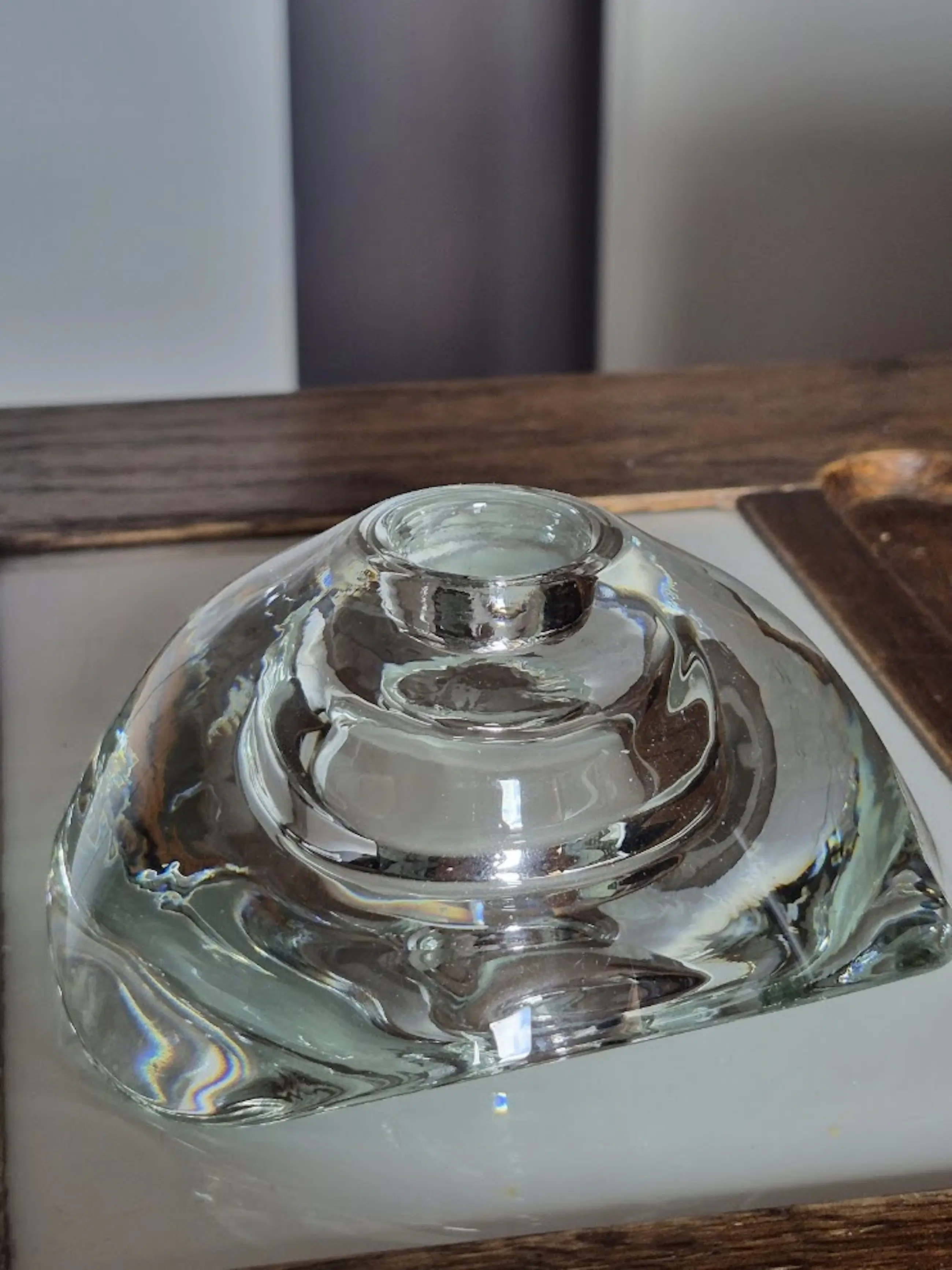 leuke kandelaar van de Zweedse glasfabriek Pukeberg; Dit is een ontwerp van Staffan Gellerstedt. Hierbij een kleine kandelaar van 9 cm hoog in scandinavische stijl. Is ongemerkt en een kandelaar en theelichthouder in een. Dus aan twee kanten te gebruiken. Is ongemerkt en vermoedelijk ook Skandinavisch. Is 5.5 cm hoog en 12 cm breed