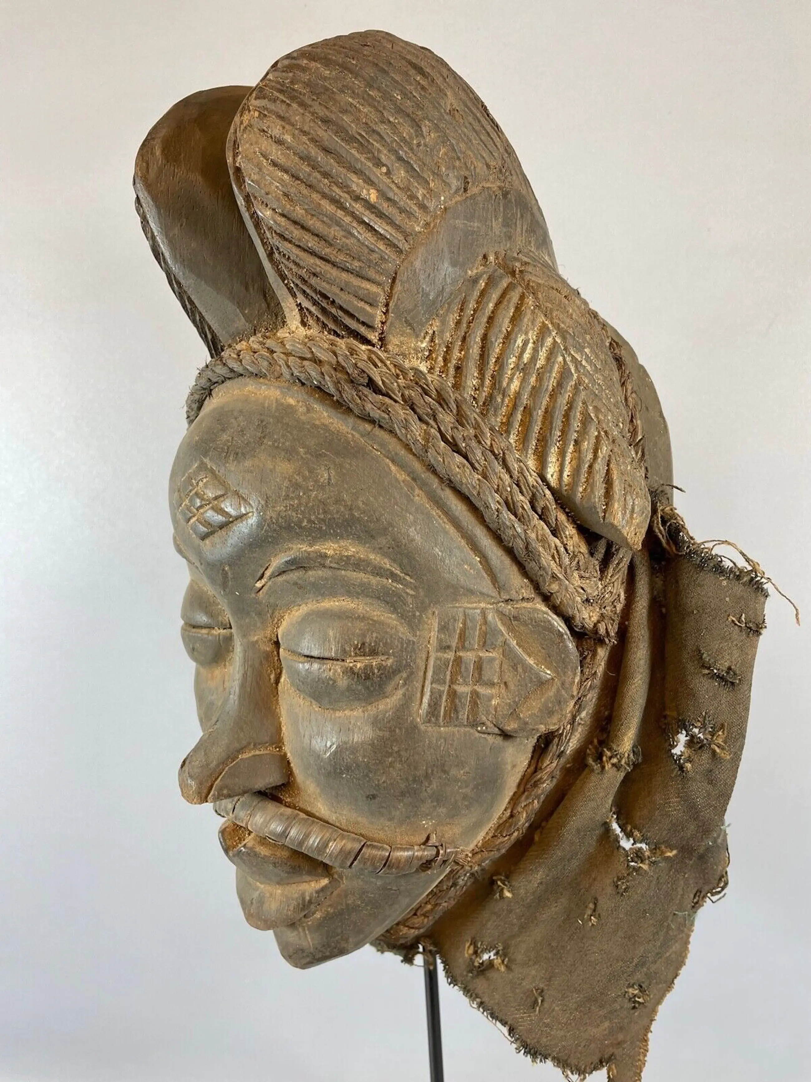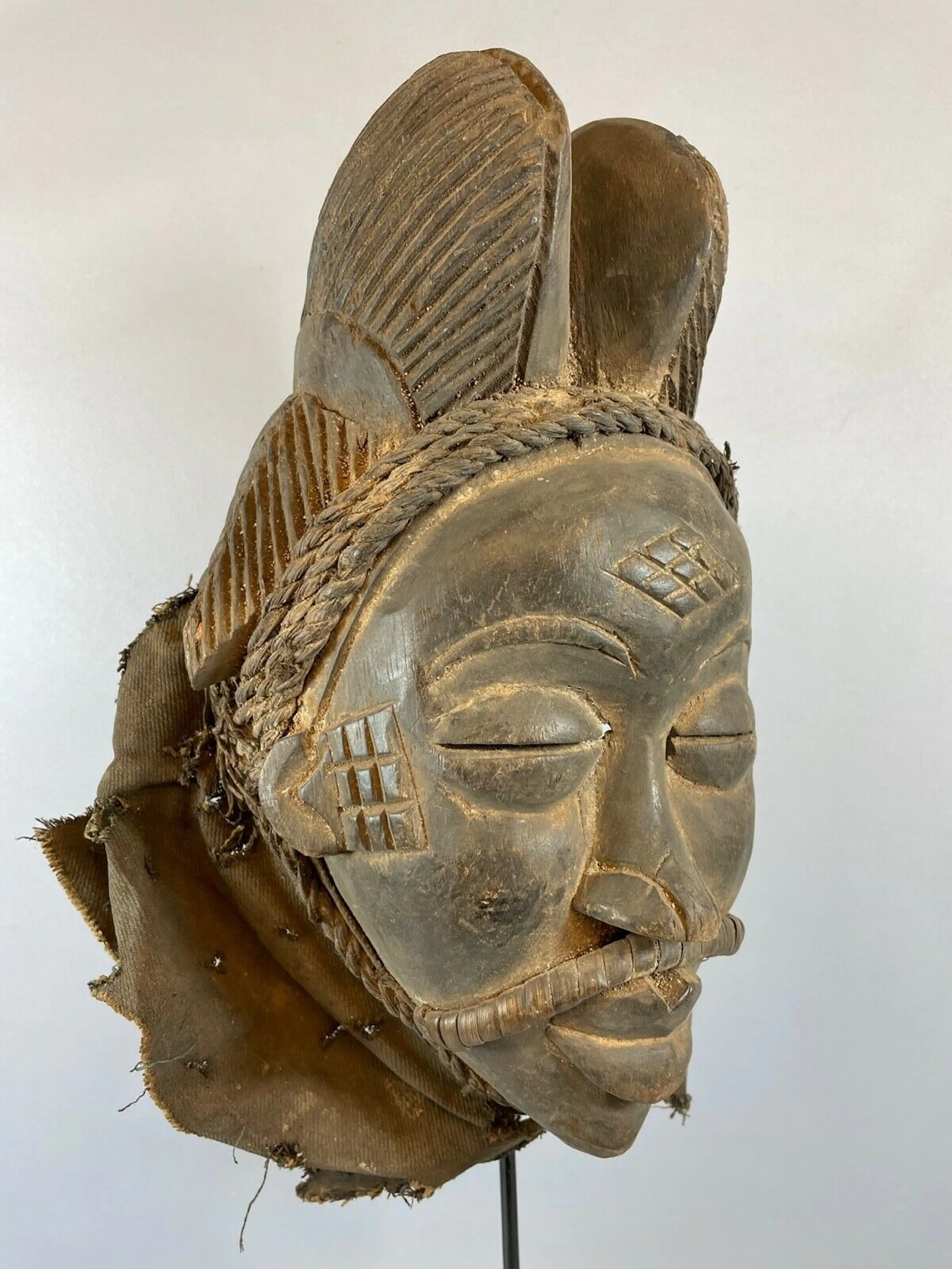 The Punu reside on the left bank of the Upper Ngoume River (Gabon) and belong to the group of tribes known as Shira which were originally part of the Luango kingdom of Angola. With the Eshira, the Lumbo, the Vili, the Galoa, and the Vungu people, the Punu migrated northwards during the 18th century and settled in the area where they continue to inhabit to this day. They live in independent villages divided into clans and families, and social cohesion is ensured by a society known as moukouji. Its primary role is to regulate community life with regards to social and judicial matters, and mainly it applies itself to the neutralization of evil forces. To this end, officiates of moukoudji utilize a cult kit that includes statuettes, human relics and masks.
