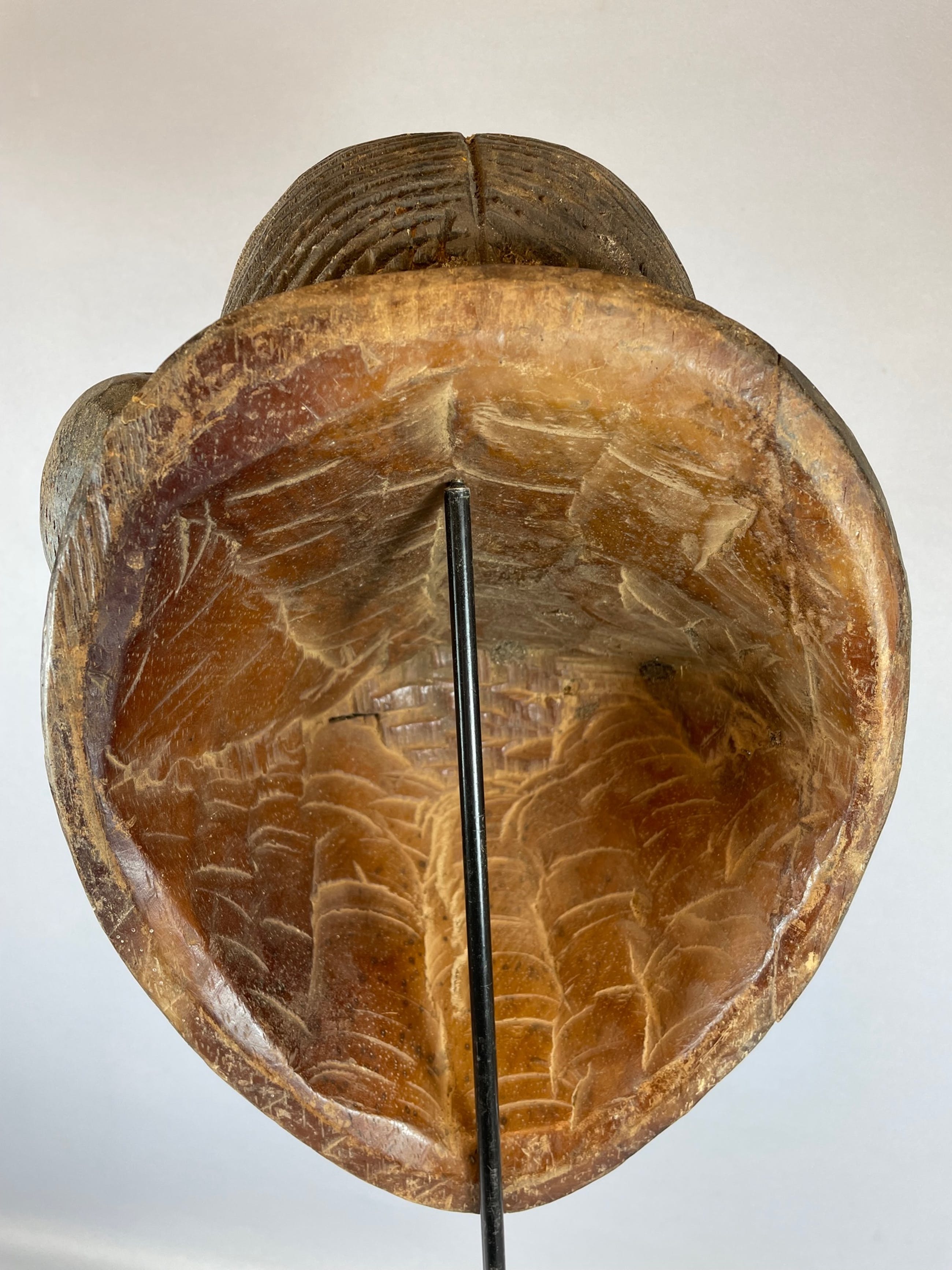 | African Punu-Lumbo mask, Nigeria. Hand carved from a single piece of wood. Height: 29 cm. Taxatiewaarde: 200 -250 euro. The professional standard is not included in the auction. You can order it there for 29.85 euros. A Punu-Lumbo mask is a tribal mask native to the Ogooué River basin in Gabon, especially in the south in Ngounié Province. The masks are extremely valuable to collectors of African art, and have been sold at Sotheby's for well over $400,000. The earliest known example, collected in 1867, is part of the Pitt Rivers Museum collection at the University of Oxford. Several other museums, such as the National Museum of African Art in Washington, D.C. are in possession of one. They have been featured in the African Negro Art show at the Museum of Modern Art in New York City (1935), and at the Museum voor Volkenkunde, in Rotterdam (1953). The masks were popular among European collectors during the 1920s and 1930s. Male dancers are known to wear the Okuyi while dancing. The white-faced masks are also used by other Gabon and Zaire rainforest people, such as the Kotas and Mpongwe, The Ashira also share in the white-faced mask tradition, which includes soft facial characteristics. The masks have been linked to the Mukui society and to female ancestor celebration dances, a funerary spirit association. A variation of the Punu-Lumbo mask is produced by the Tsangui in the northern Democratic Republic of the Congo. Compared stylistically to Japanese art, the masks are typically oval in shape, with narrowed eyes, arched eyebrows and small ears. The male masks (ikwar) tend to be brown and black pigment over kaolin and viewed as ugly and are shown at night whilst the masks for females (mukudj) tend to be lighter and considered prettier by the locals and are shown in the day. The Okuyi (or mokuyi) white-faced masks commonly contain nine scale-like patterns on the forehead. This is said to be a "central eye" and also a flowering tree. The white color, usually derived from kaolin, represents clarity, light, and beauty | |||||||||||