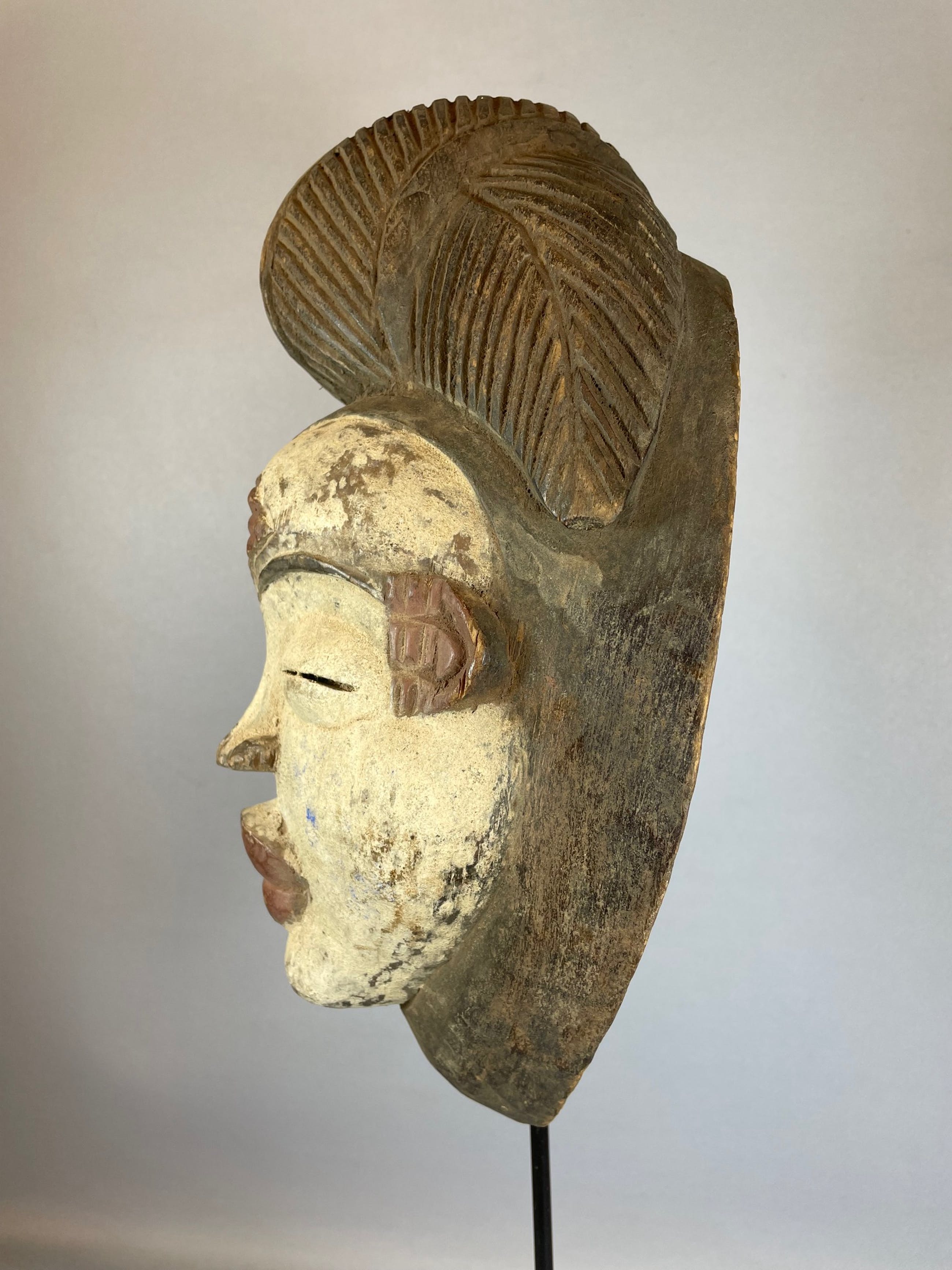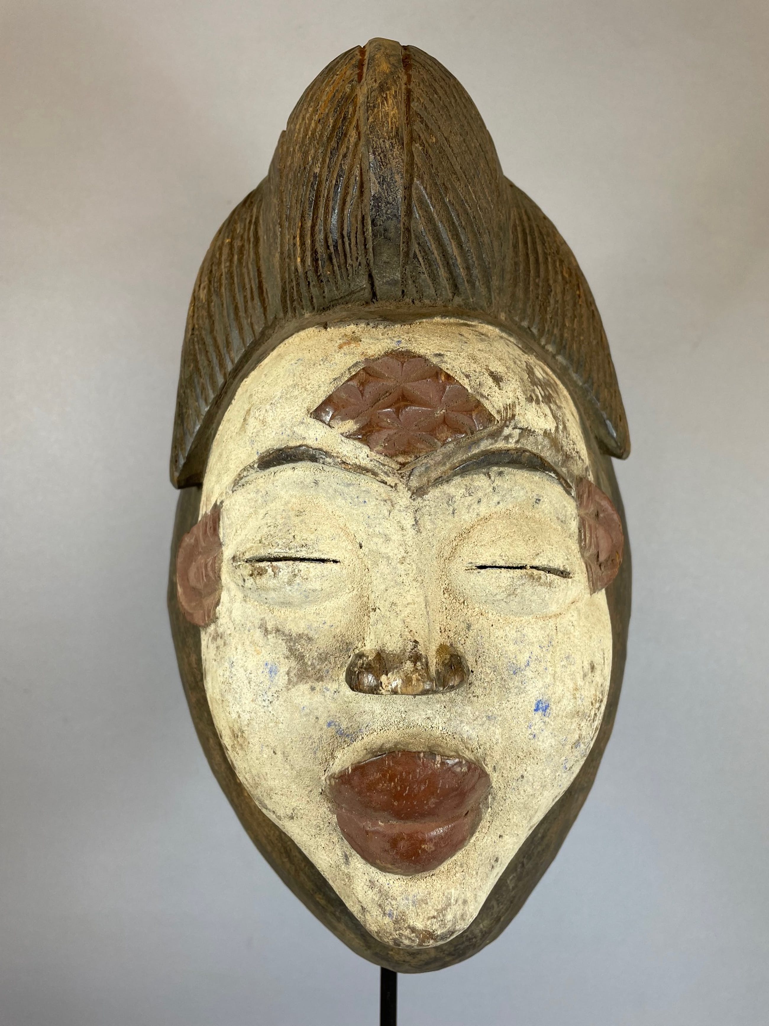 The Punu reside on the left bank of the Upper Ngoume River (Gabon) and belong to the group of tribes known as Shira which were originally part of the Luango kingdom of Angola. With the Eshira, the Lumbo, the Vili, the Galoa, and the Vungu people, the Punu migrated northwards during the 18th century and settled in the area where they continue to inhabit to this day. They live in independent villages divided into clans and families, and social cohesion is ensured by a society known as moukouji. Its primary role is to regulate community life with regards to social and judicial matters, and mainly it applies itself to the neutralization of evil forces. To this end, officiates of moukoudji utilize a cult kit that includes statuettes, human relics and masks.| Conditie | |||||||||||