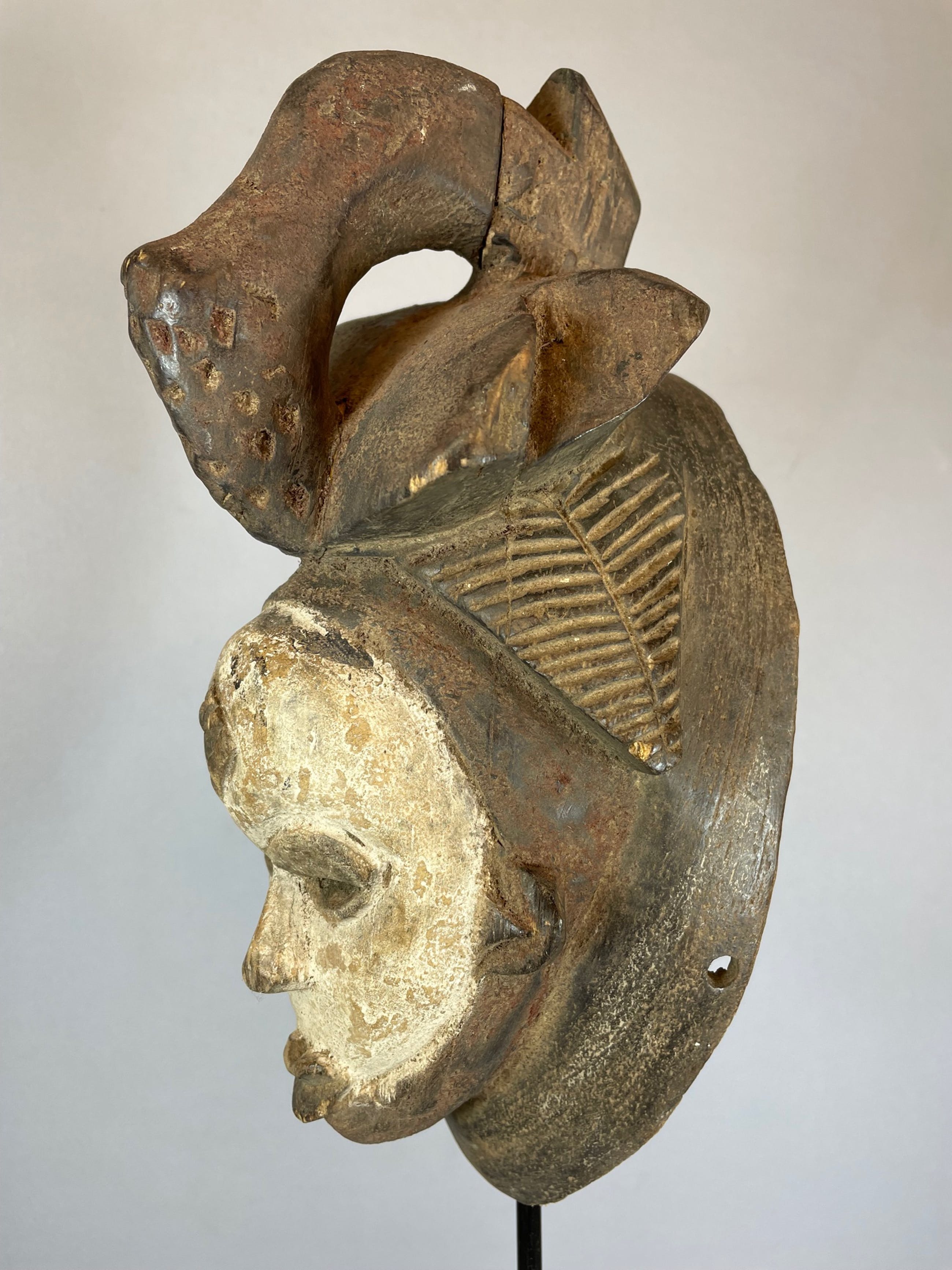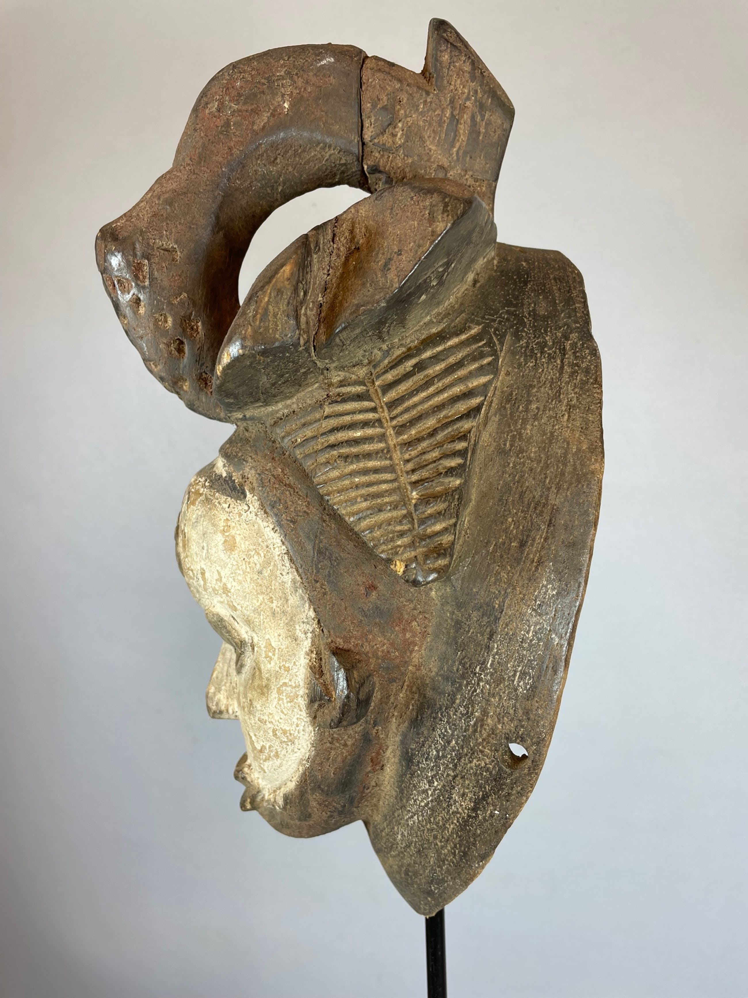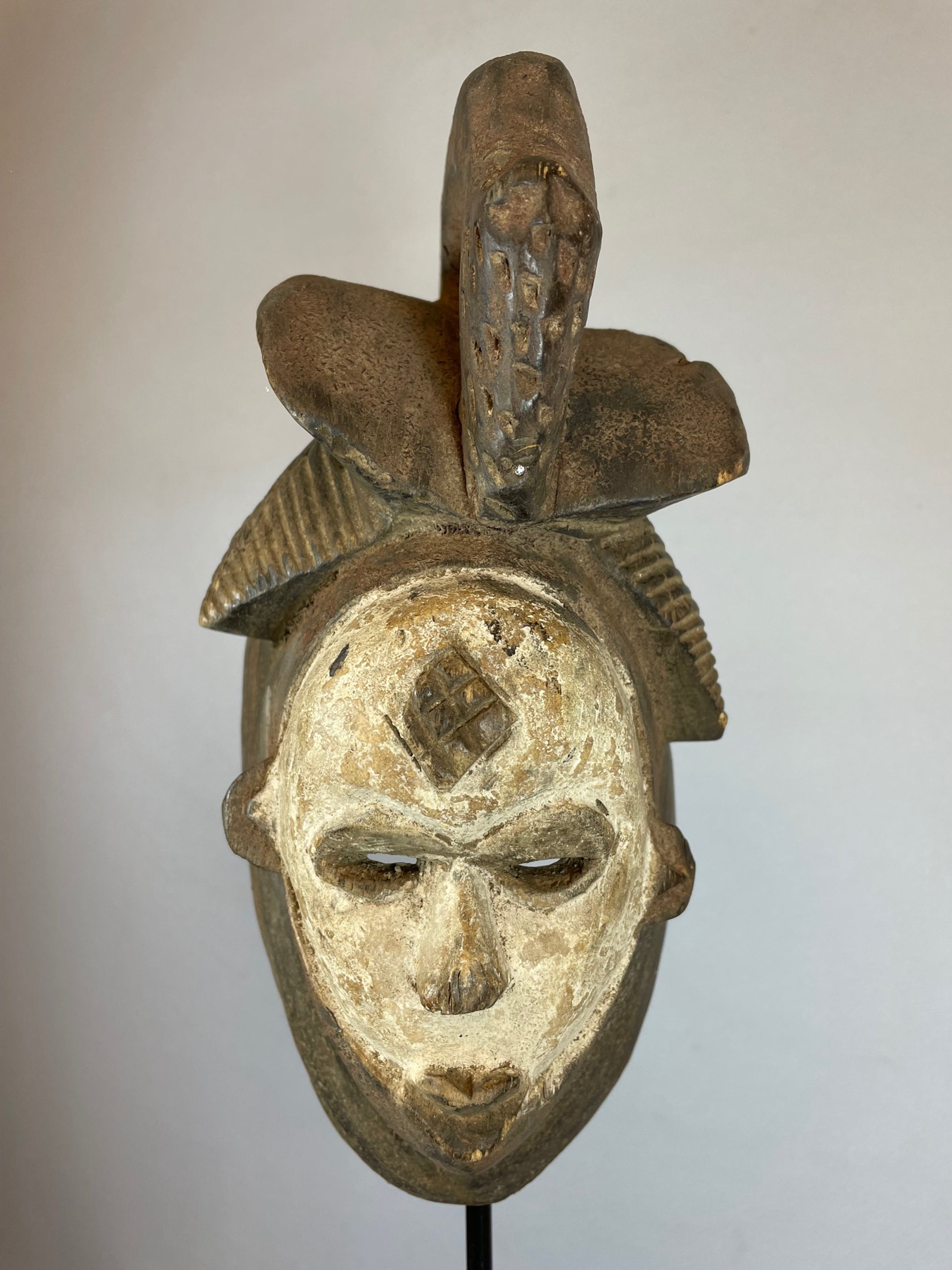 The Punu reside on the left bank of the Upper Ngoume River (Gabon) and belong to the group of tribes known as Shira which were originally part of the Luango kingdom of Angola. With the Eshira, the Lumbo, the Vili, the Galoa, and the Vungu people, the Punu migrated northwards during the 18th century and settled in the area where they continue to inhabit to this day. They live in independent villages divided into clans and families, and social cohesion is ensured by a society known as moukouji. Its primary role is to regulate community life with regards to social and judicial matters, and mainly it applies itself to the neutralization of evil forces. To this end, officiates of moukoudji utilize a cult kit that includes statuettes, human relics and masks.| Conditie | |||||||||||