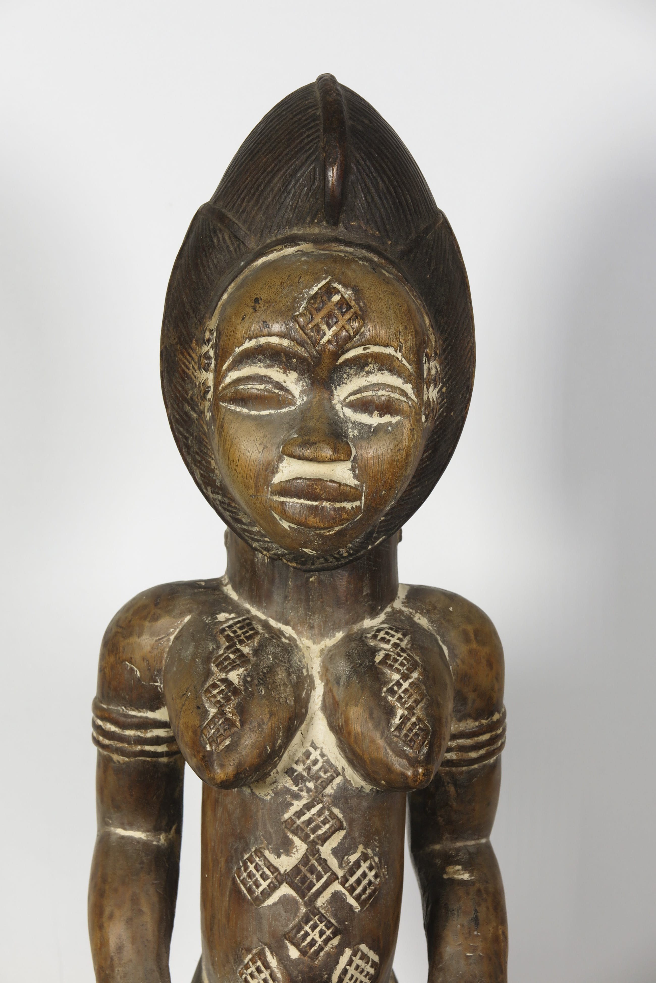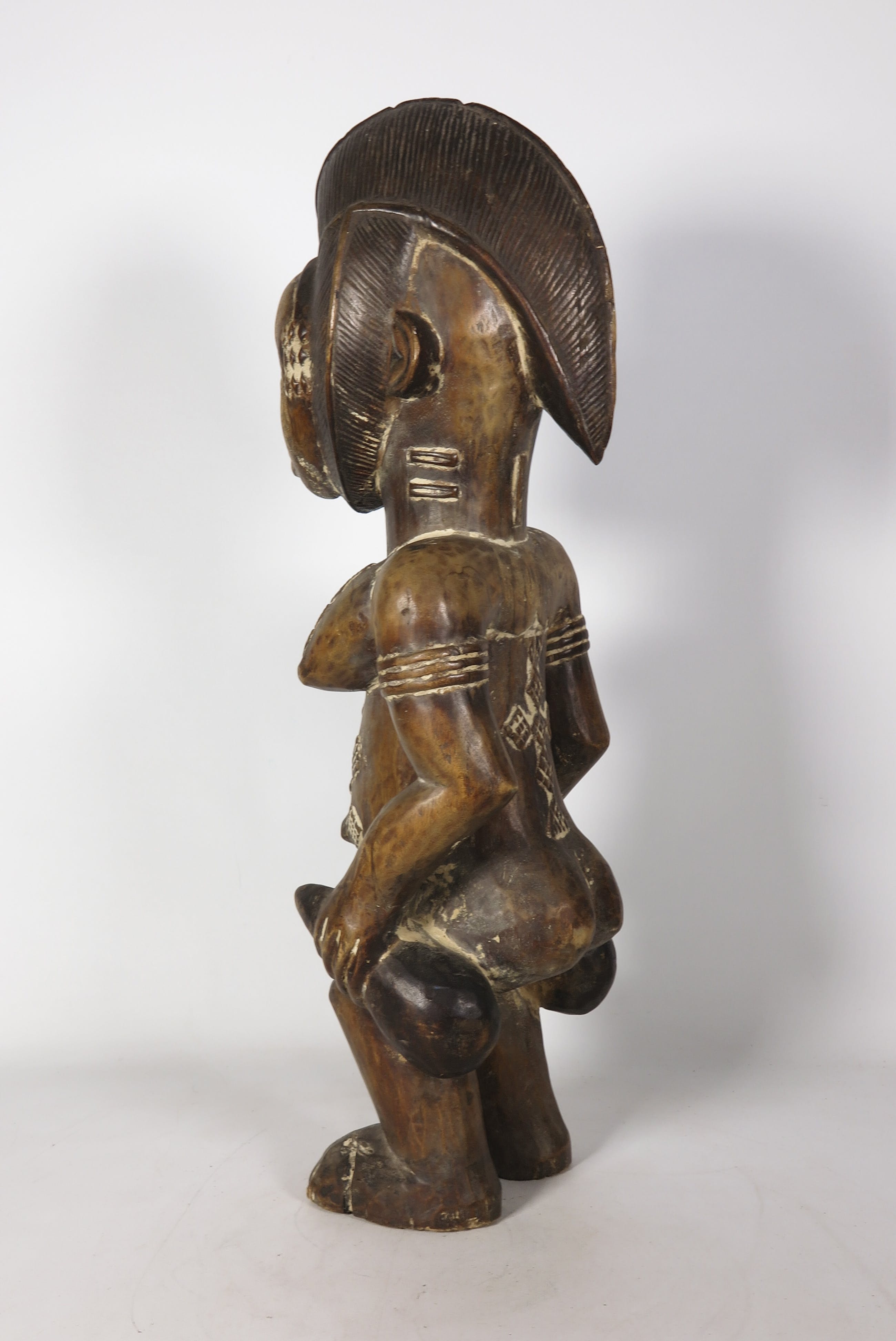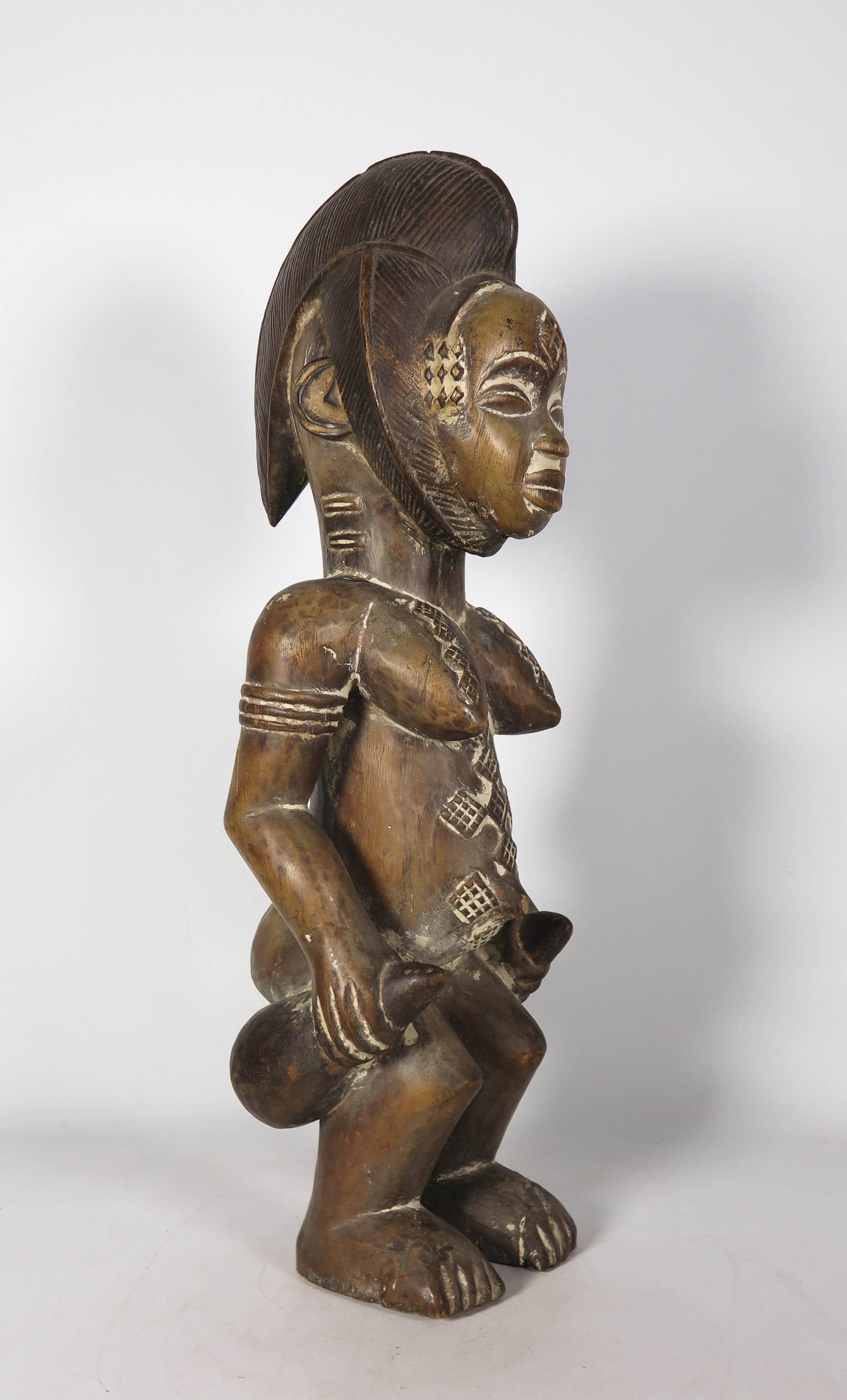 Houten gestoken Punu voorouderbeeld van staand vrouwenfiguur met tatoeages en twee kruiken in de hand