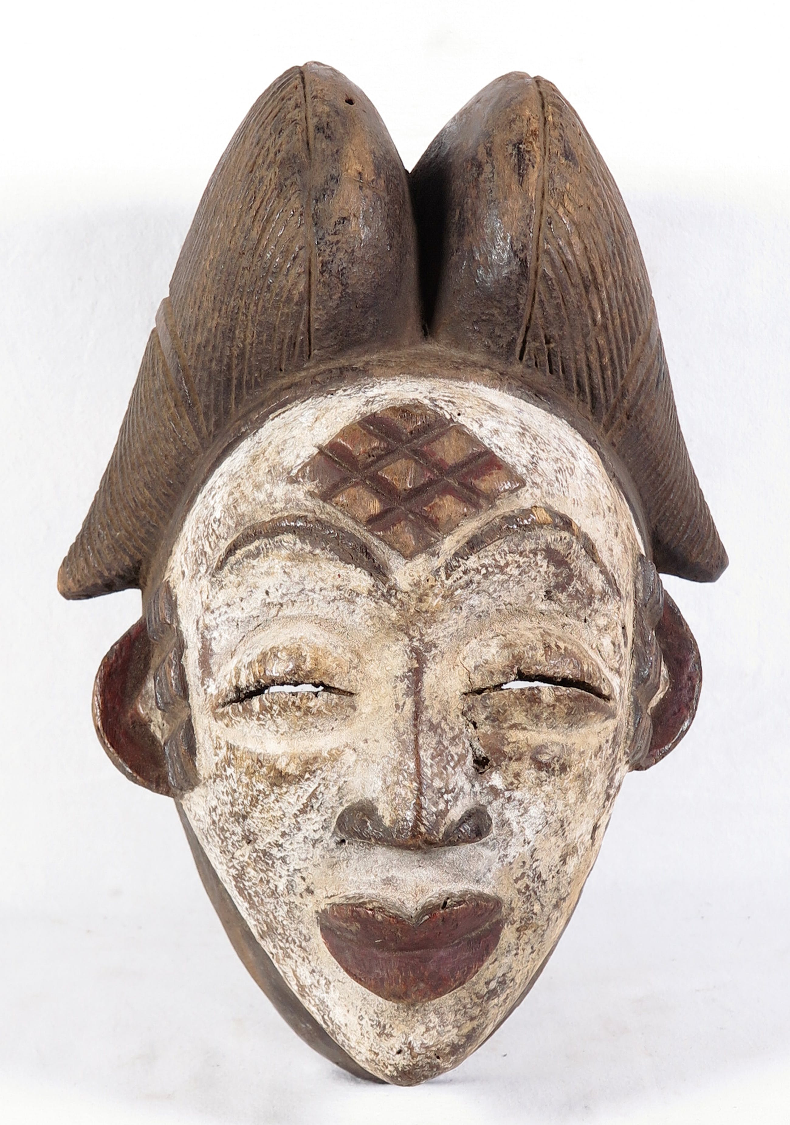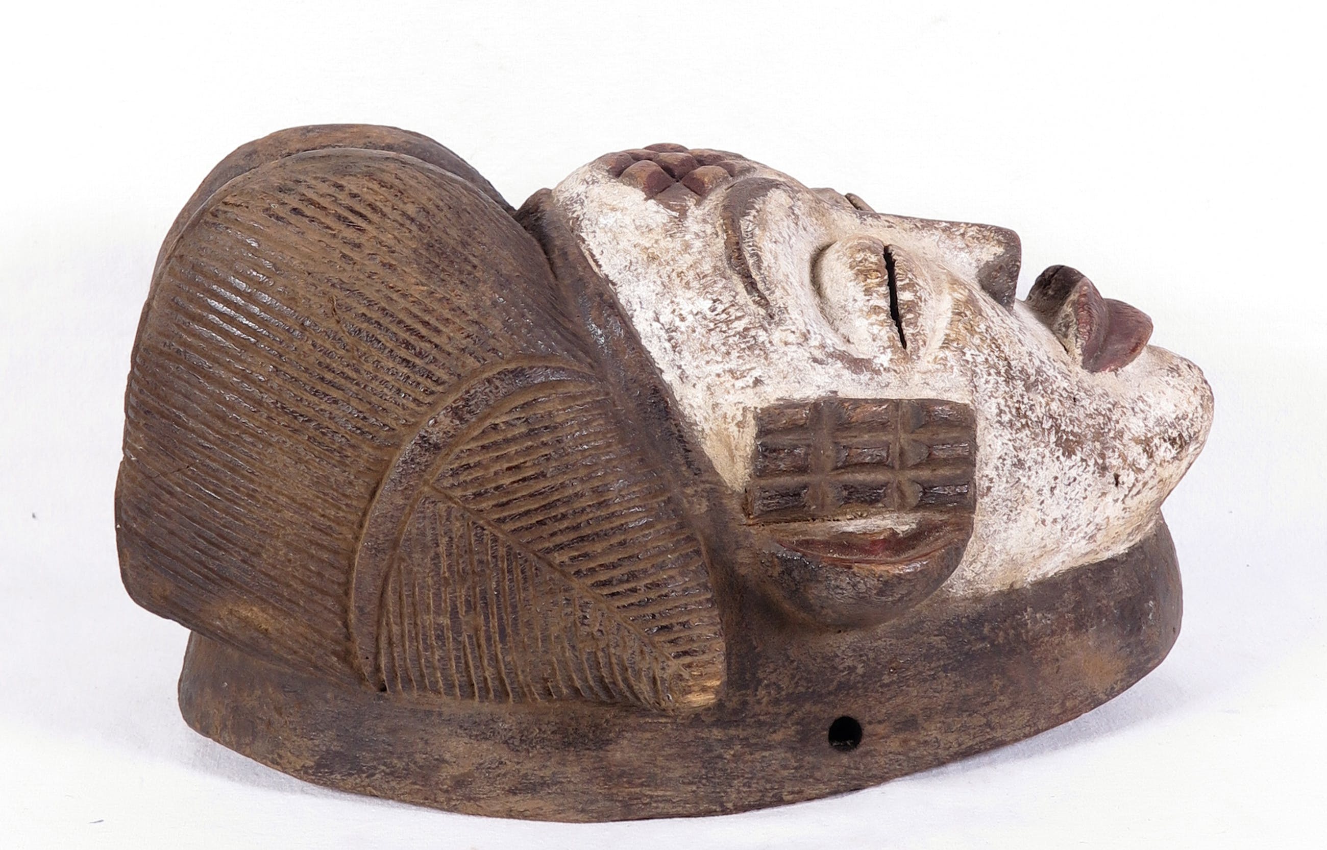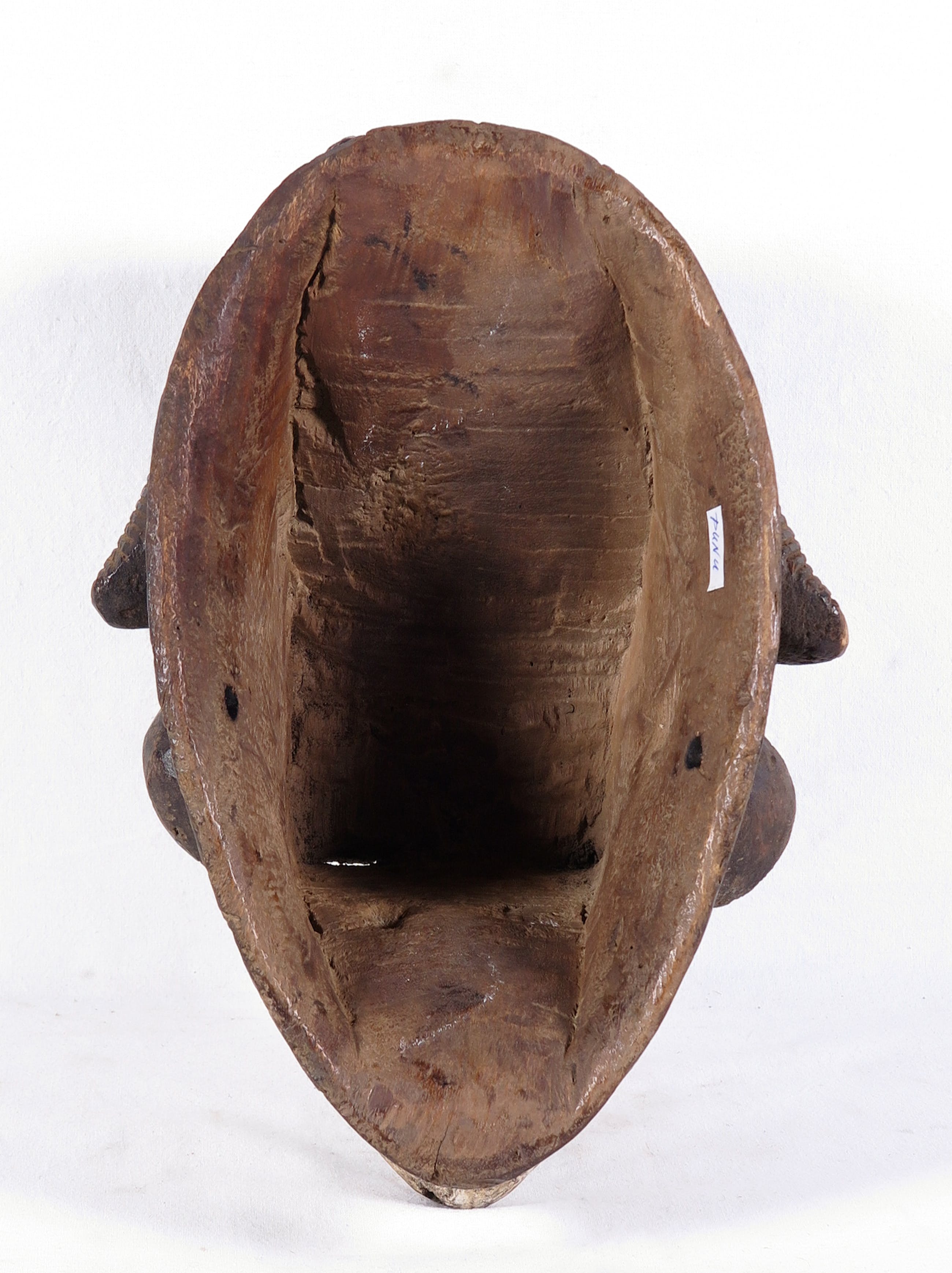 | Lichte gebruikssporen. Aantal scheurtjes in het hout bovenop het masker. | |||||||||||
