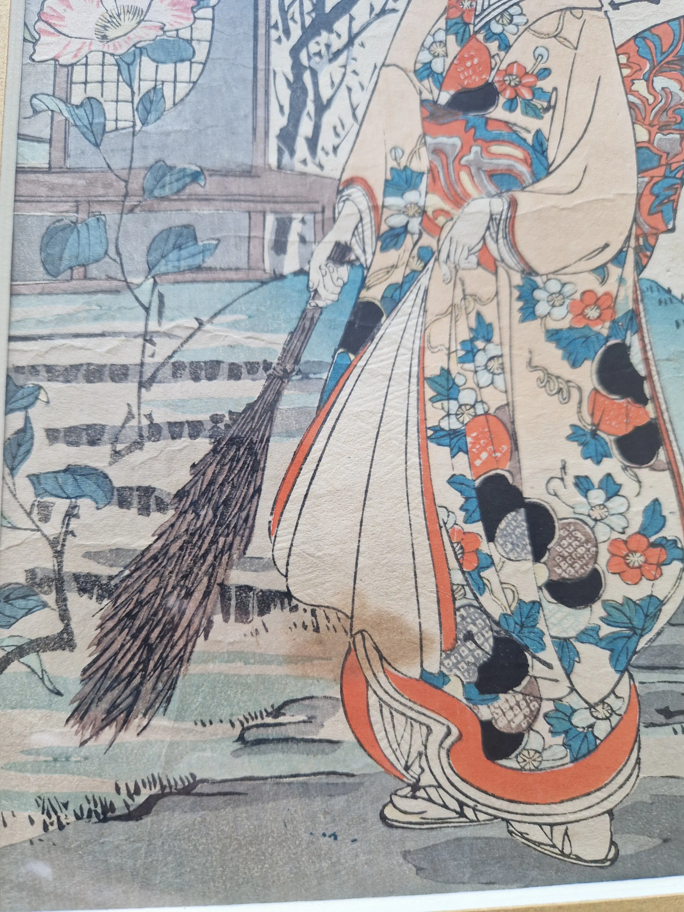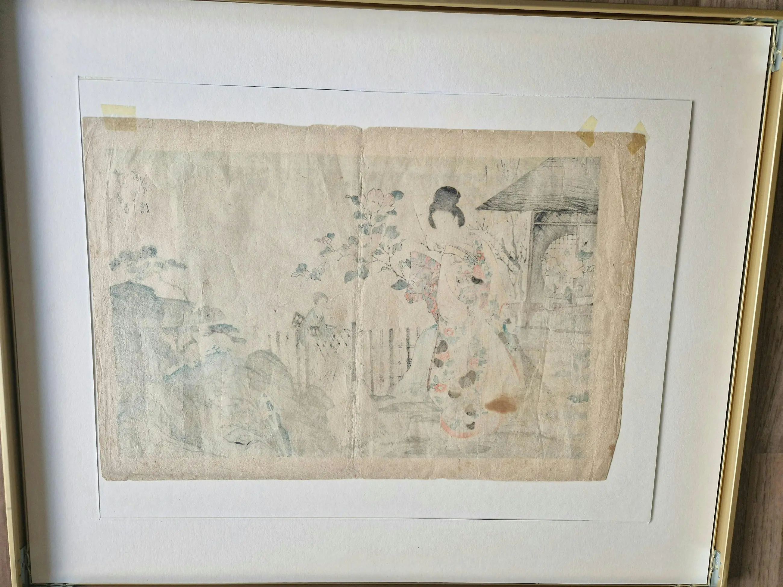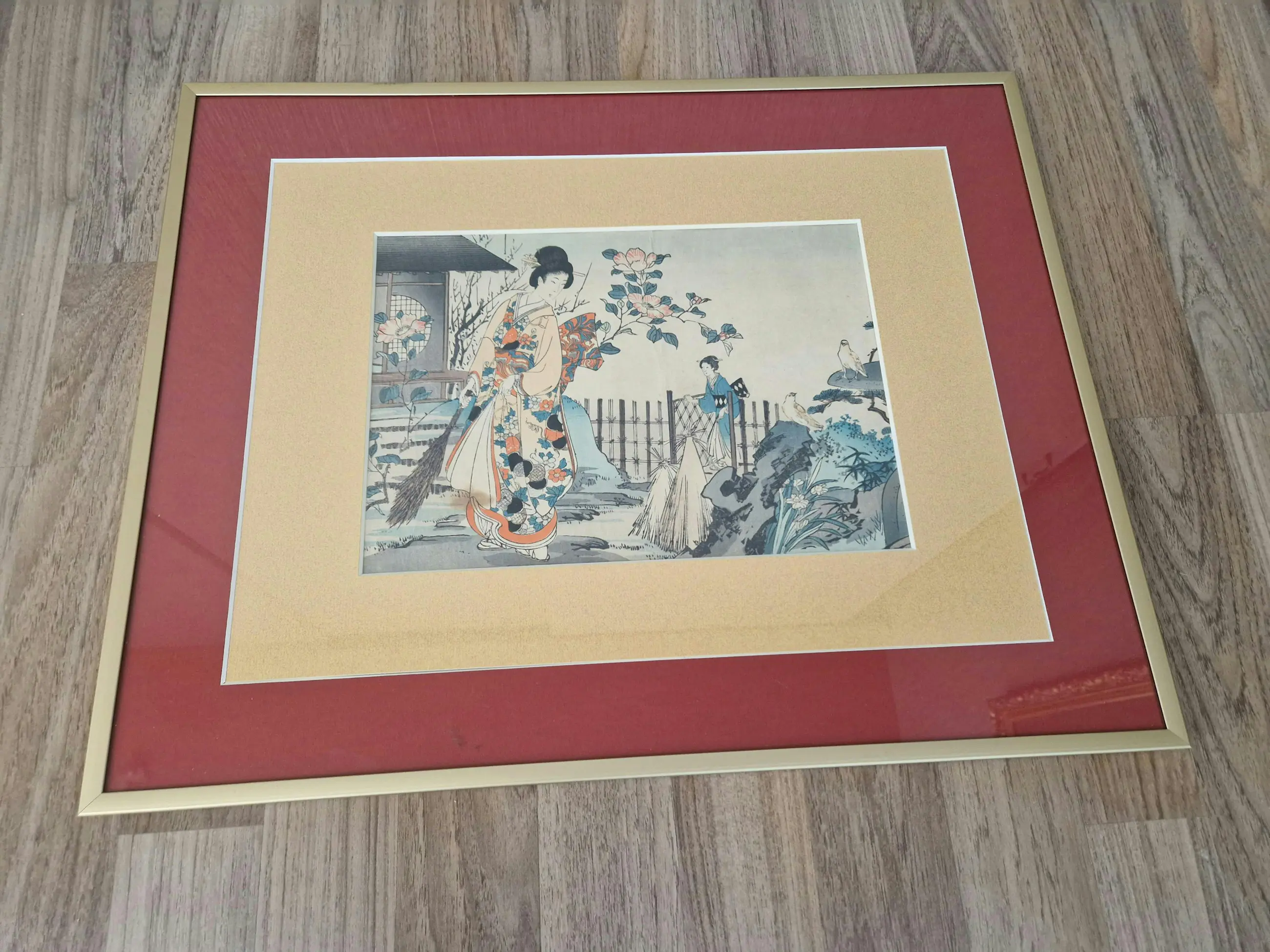 Officiële titel onbekend, Japanse dames in de tuin. Ingelijst goudkleurige wissellijst, kleine beschadiging, vlek op glas, en vlekje in papier zie foto's Mooi kleurrijk werk.