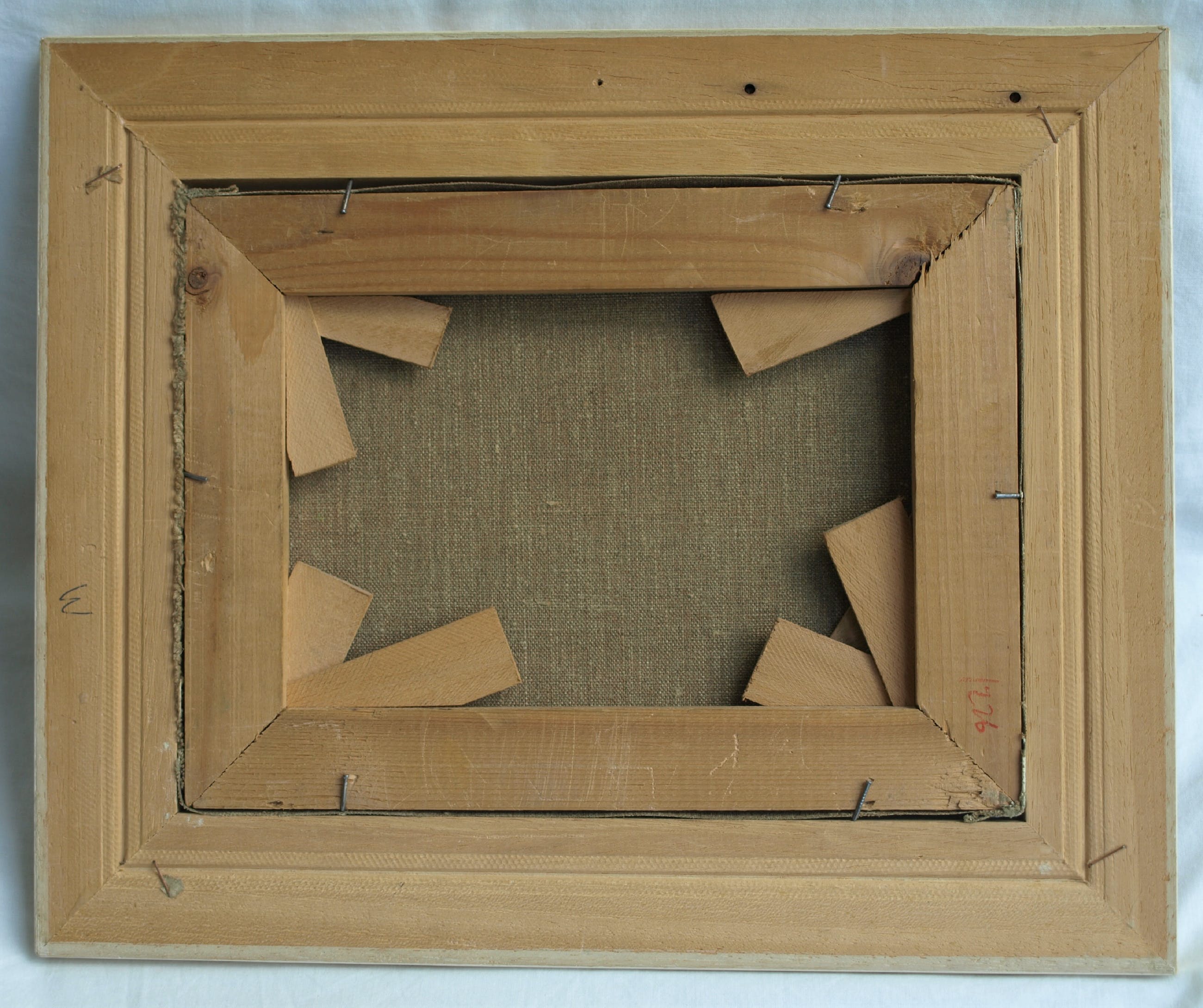-Olieverf op doek, gespannen op een houten spieraam en ingelijst in een houten lijst met een linnen rand.