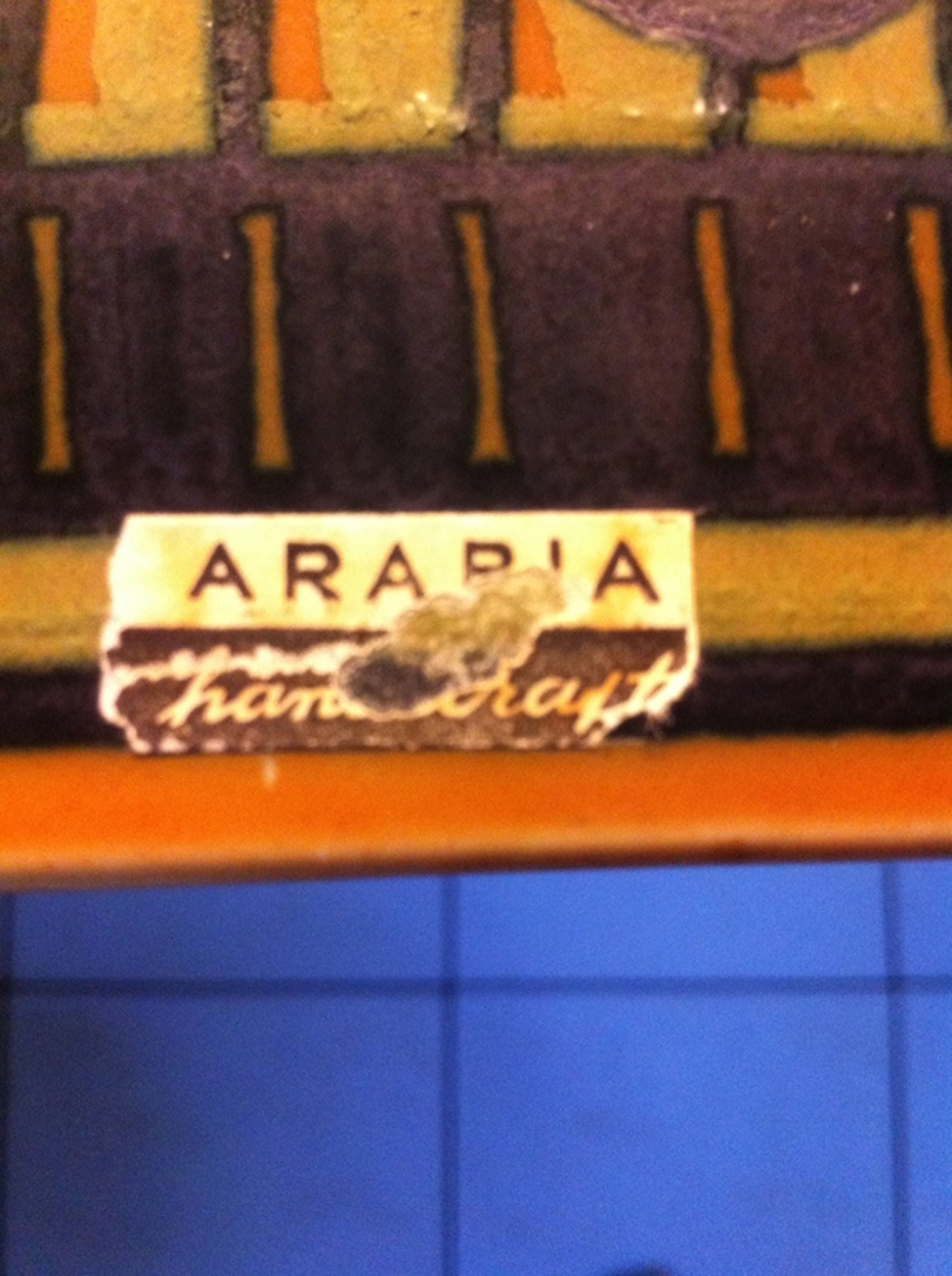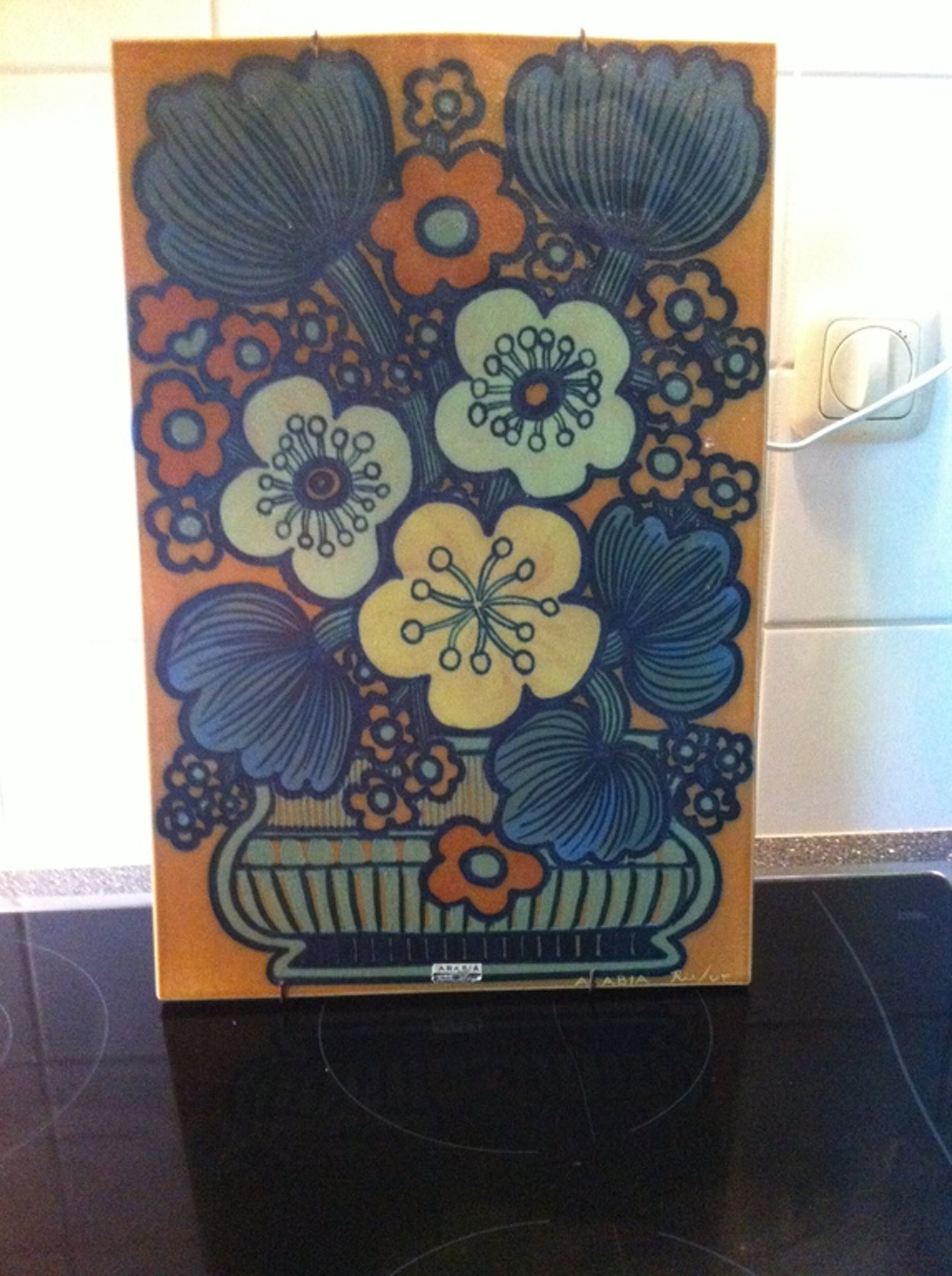 Dit is een uiterst zeldzame grote tegel (formaat:29,5 cm x 45cm) ontworpen door de belangrijkste ontwerpster voor ARABIA Finland gedurende de jaren zestig, Raija Uosikkinen. Ik heb op het internet ooit 2 andere kleuren gezien. Op het ogenblik is er een blauwe versie te koop voor meer dan 500 uk pond op Ebay.