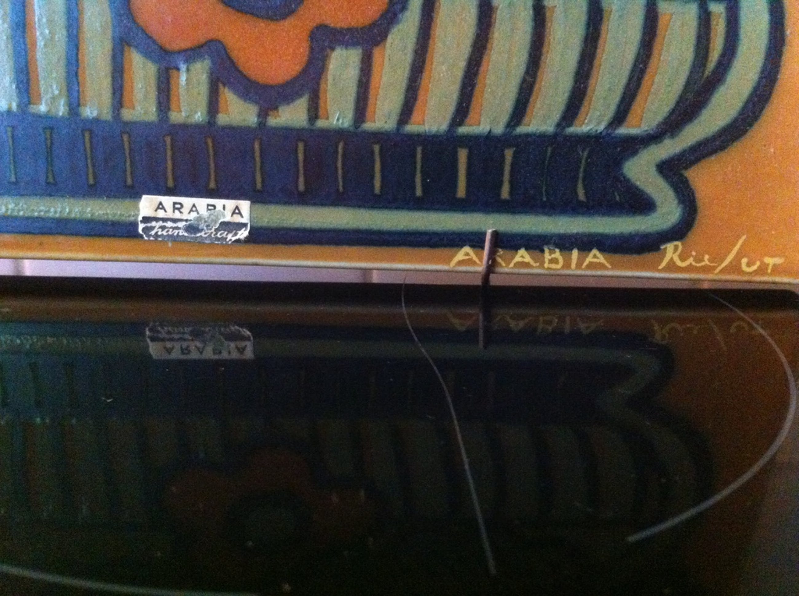 Gesigneerd ARABIA Ru/UT waabij Ru staat voor Raija Uosikkinen. Ook midvoor nog een sticker! met handcrafted erop!