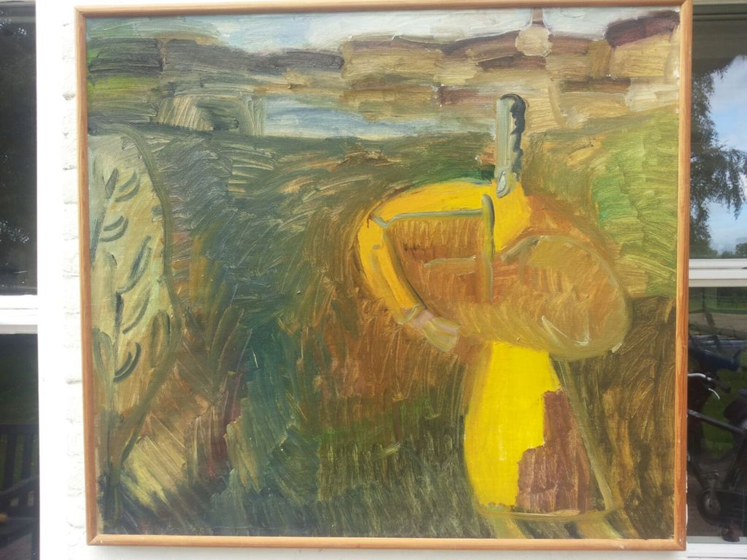 De afbeelding van een boer op het veld is mooi abstract en in heldere kleuren weergegeven. De afmetingen zijn 90x100. Het werk verkeert in een prima staat.