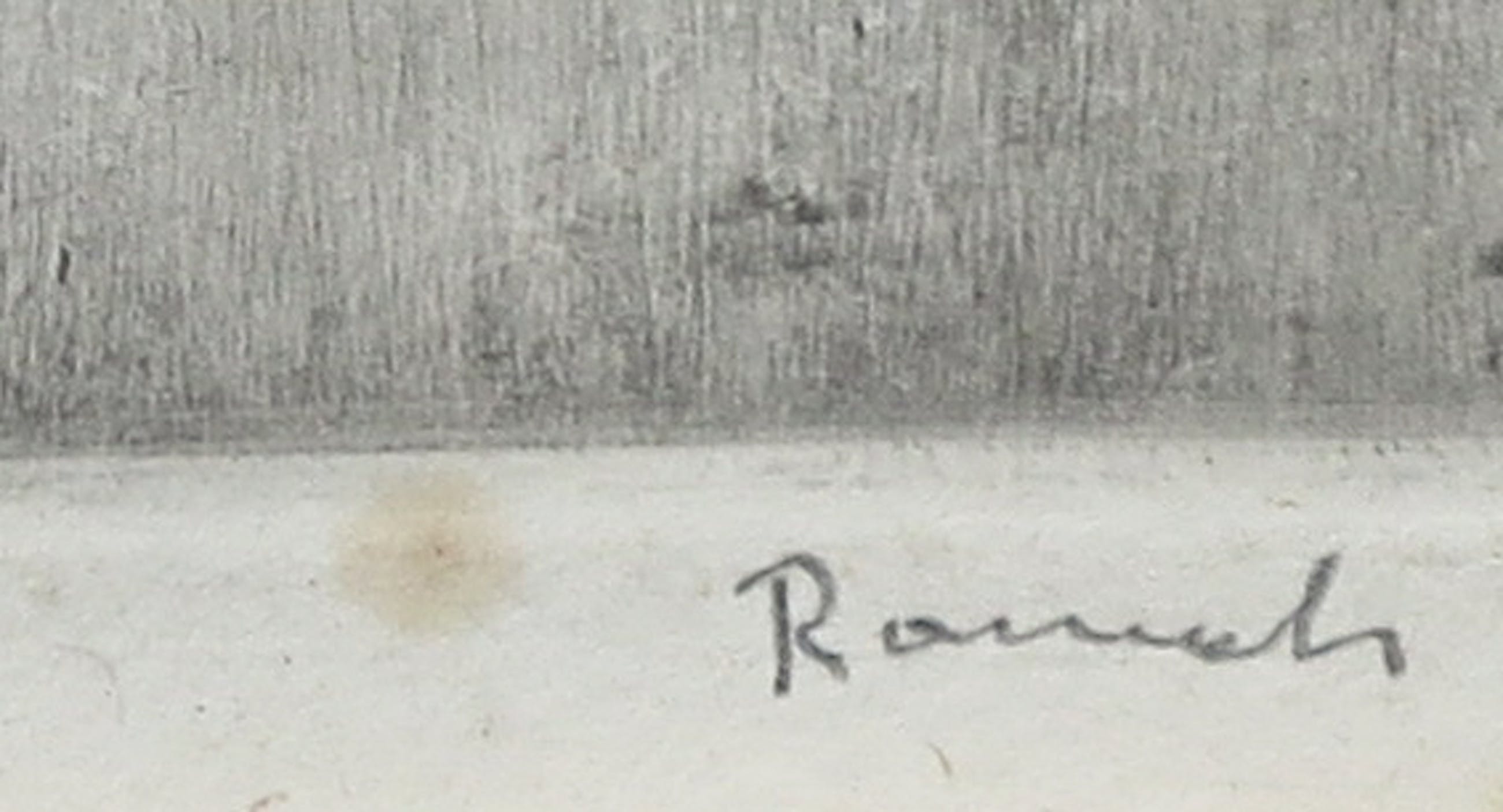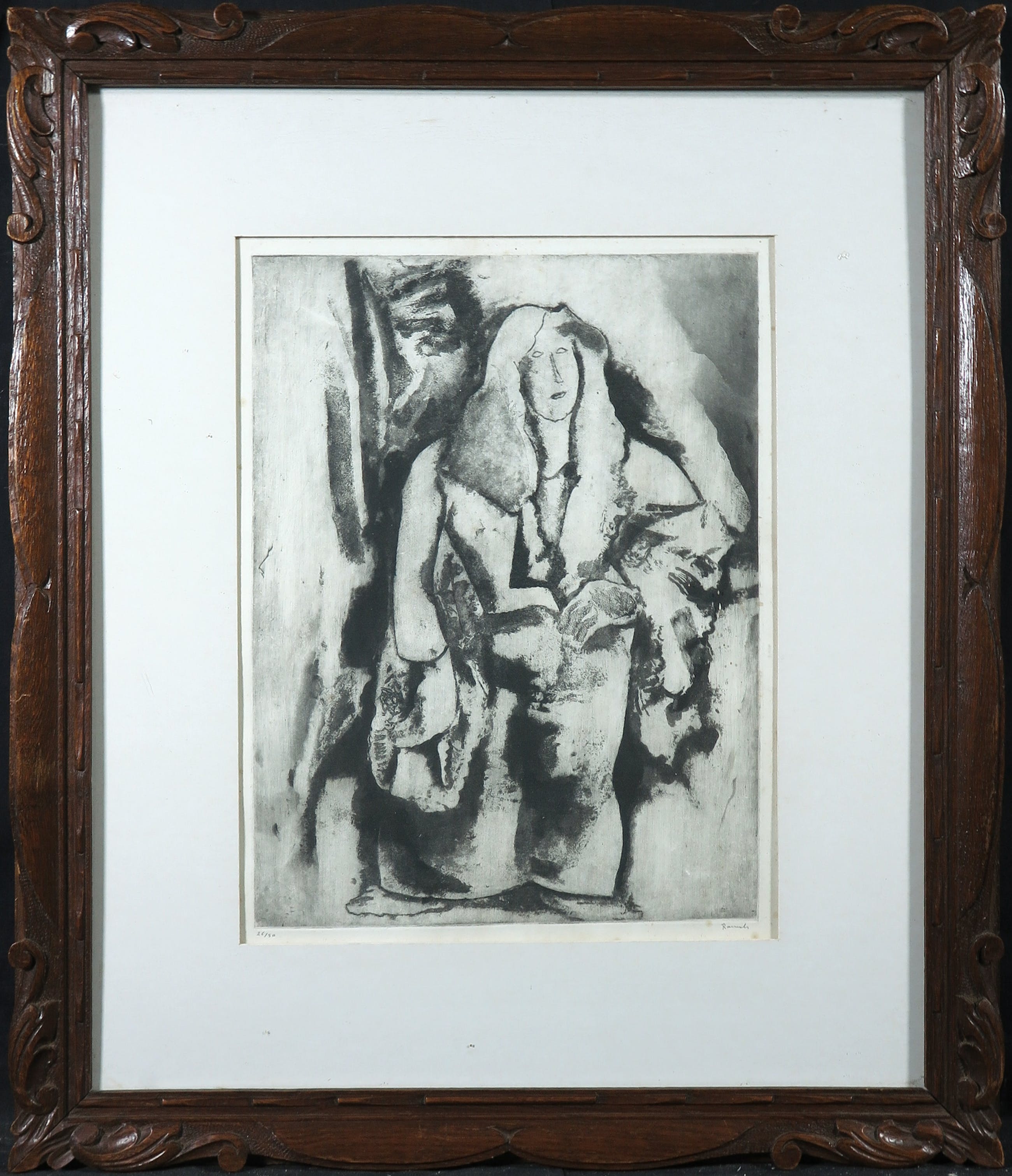 | An sich in goede staat gezien leeftijd, maar wel met foxing in de marge. Passe-partout is verouderd en aan vervanging toe. Rechtsboven zit een soort blutsje in het glas. Inlijsting is aan de achterzijde een beetje losjes. De achterplaat moet opnieuw bevestigd worden. | |