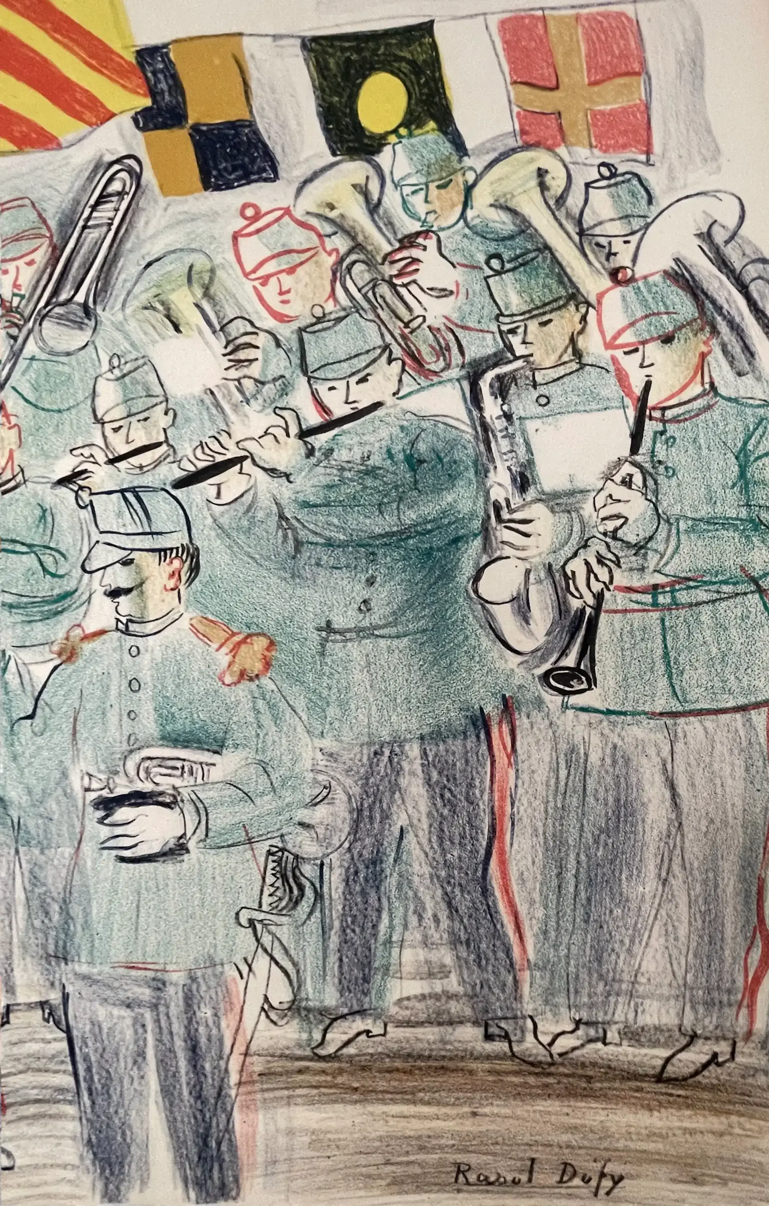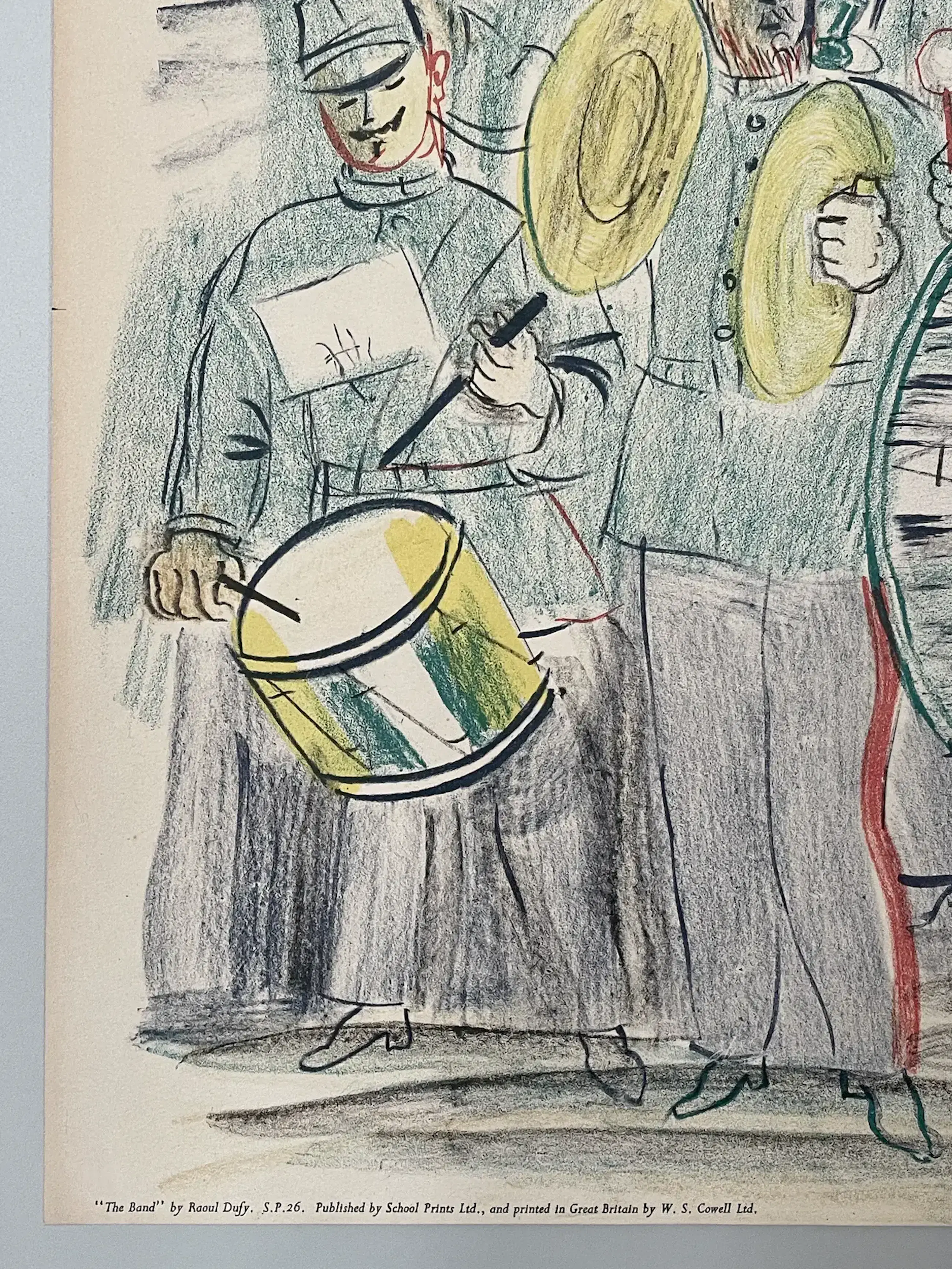 Raoul Dufy: La Fanfare / The Band. Originele kleurenlithografie op groot formaat, 1949, voor Brenda Rawnsley's "School Prints"-editie. Gedrukt door WSCowell Ltd., Londen. Gesigneerd in de plaat rechtsonder. Formaat 48,5 x 76 cm.