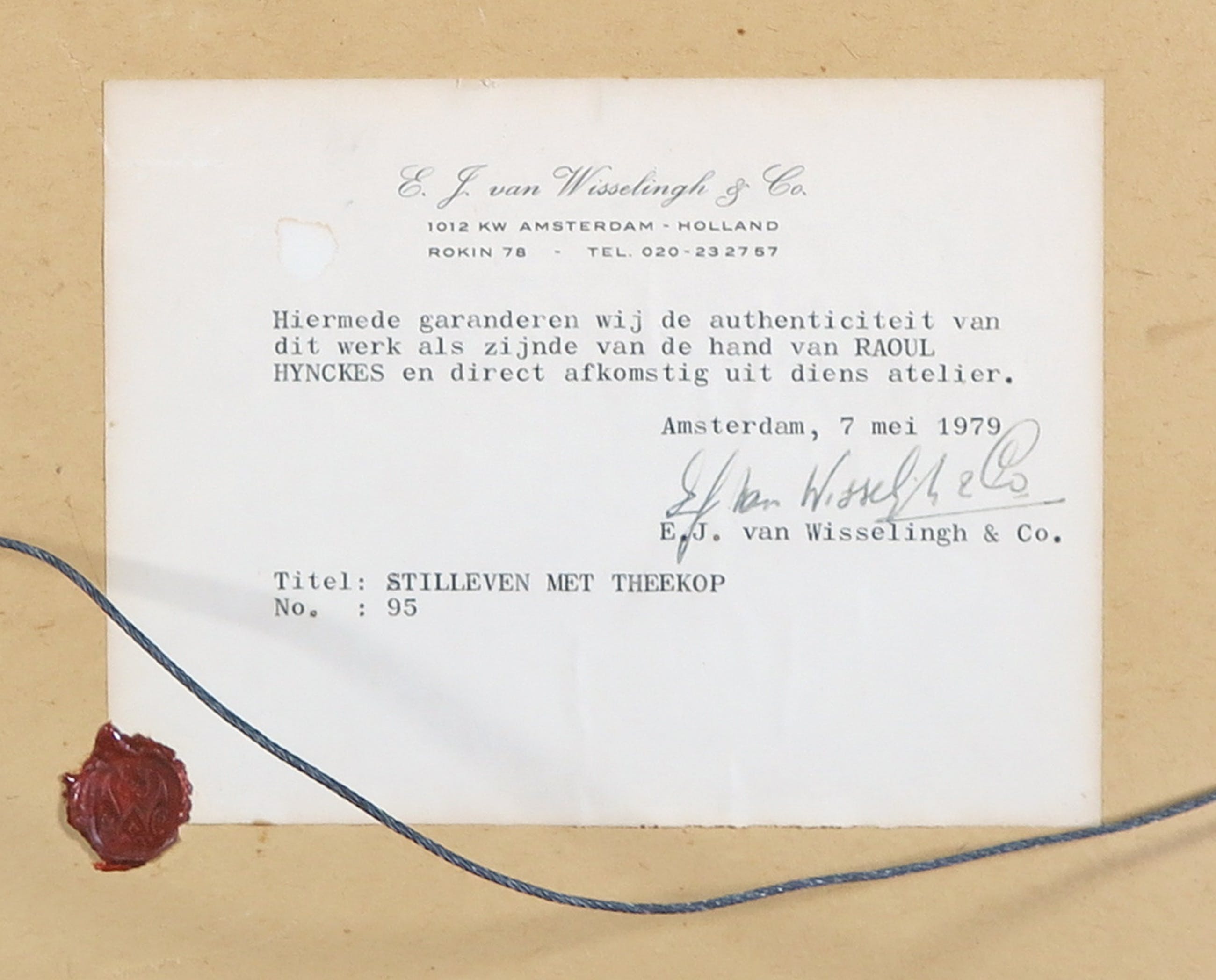 Sfeervol stilleven door Belgische kunstenaar Raoul Hynckes. Verso voorzien van certificaat van echtheid, uitgegeven door E.J. van Wisselingh & Co in 1979.