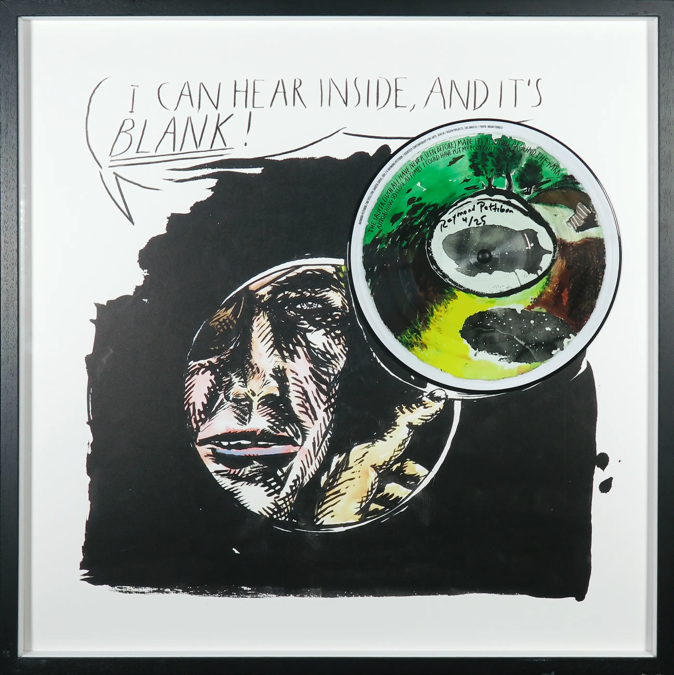 Zeefdruk op museumkarton met LP, getiteld 'I can hear inside and it's blank!'. Het werk is op de LP met de hand gesigneerd en genummerd.