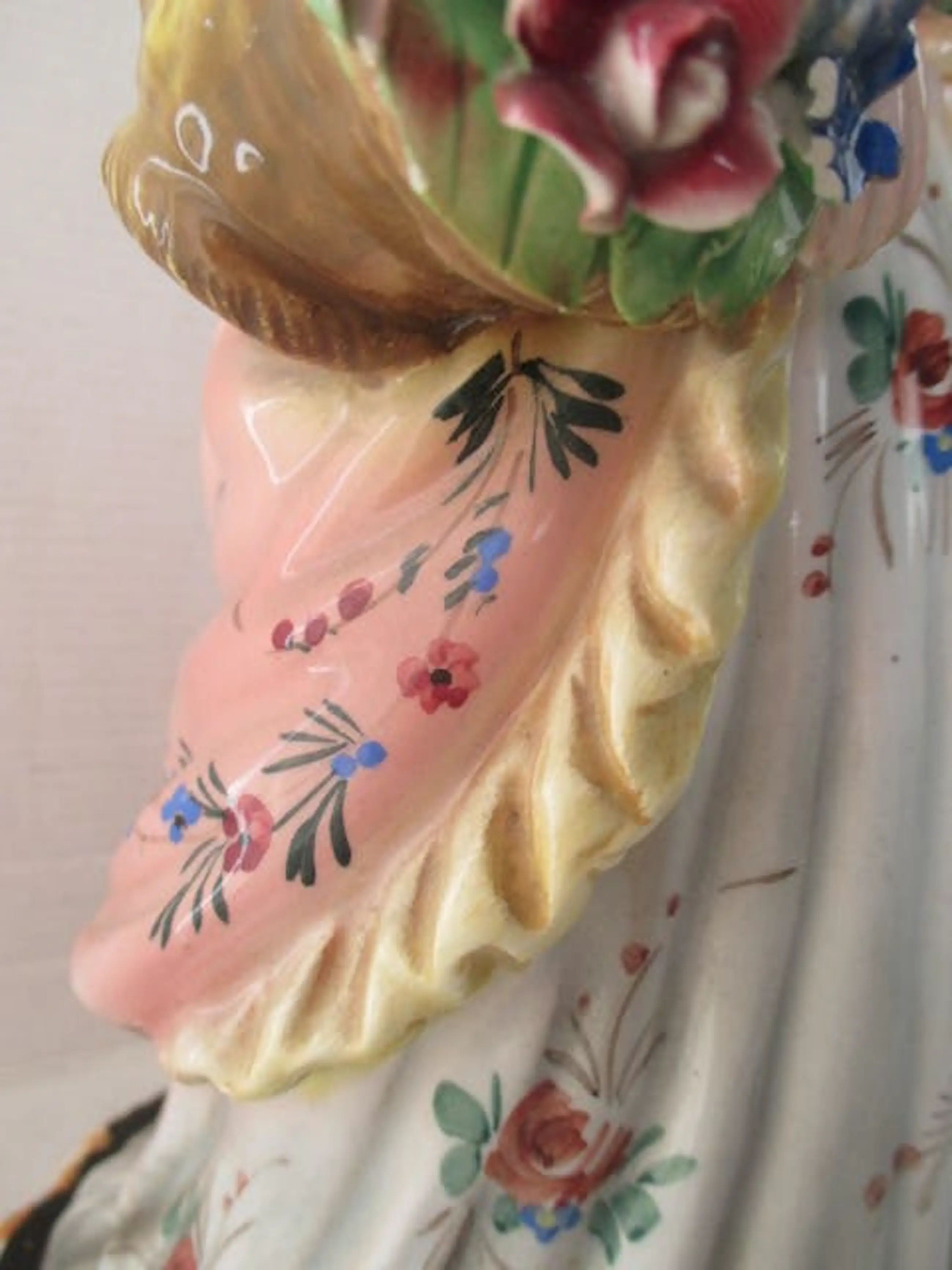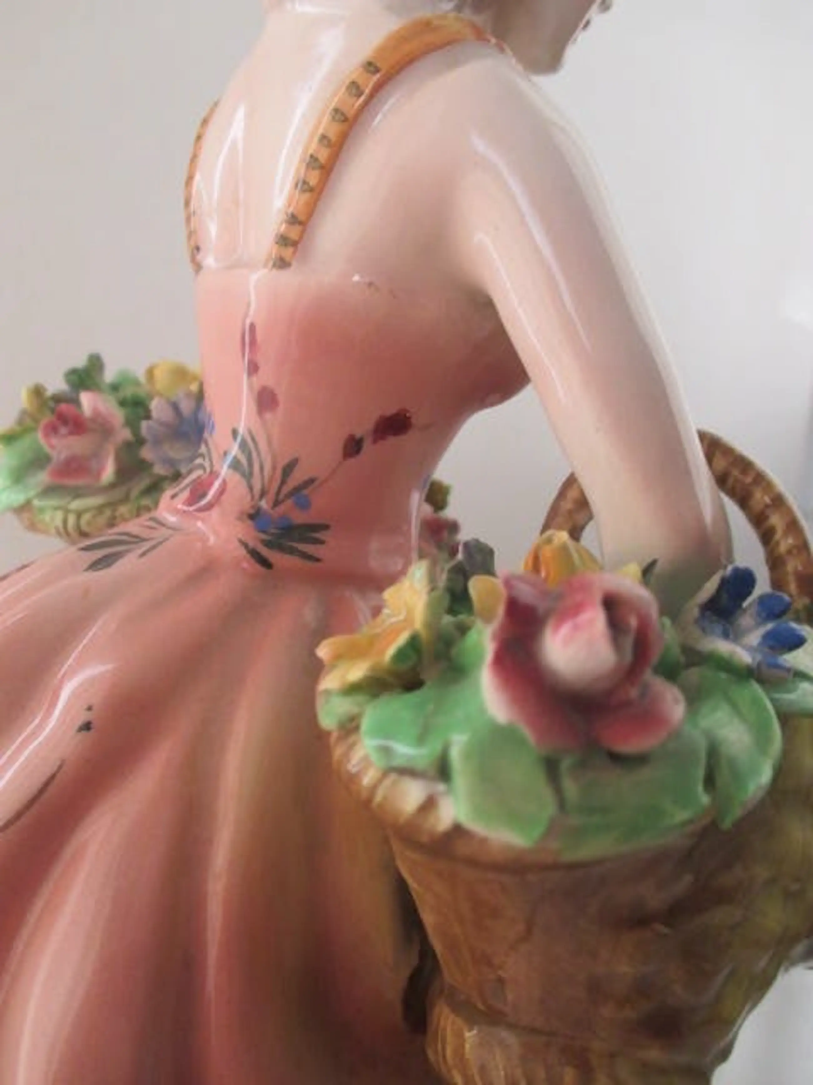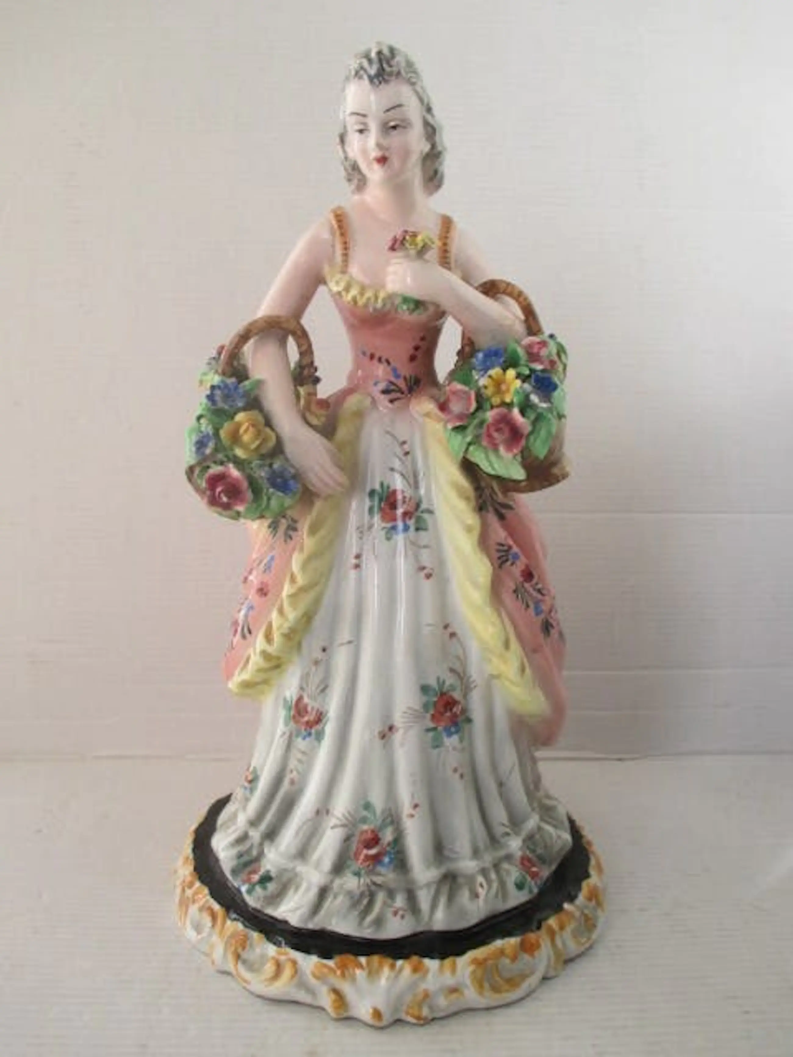 Vintage vrouwen figuurtje in Viktoriaanse kleding met twee bloemen maandjes. Handgeschilderd en gemerkt. Er zijn micro chipjes op een paar bloementjes. Maar dat is normaal voor zo oud beeldje die heel fijn is afgewerkt (zie op de foto's). Afmetingen: H 30 cm, diameter 16 cm. Geen verzending buiten EU.