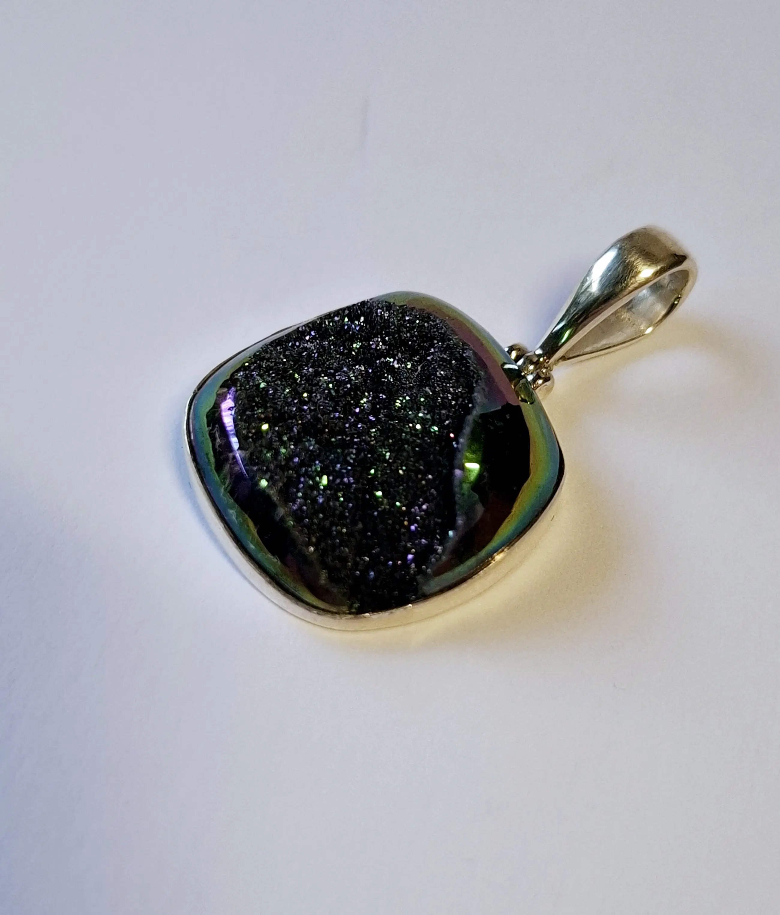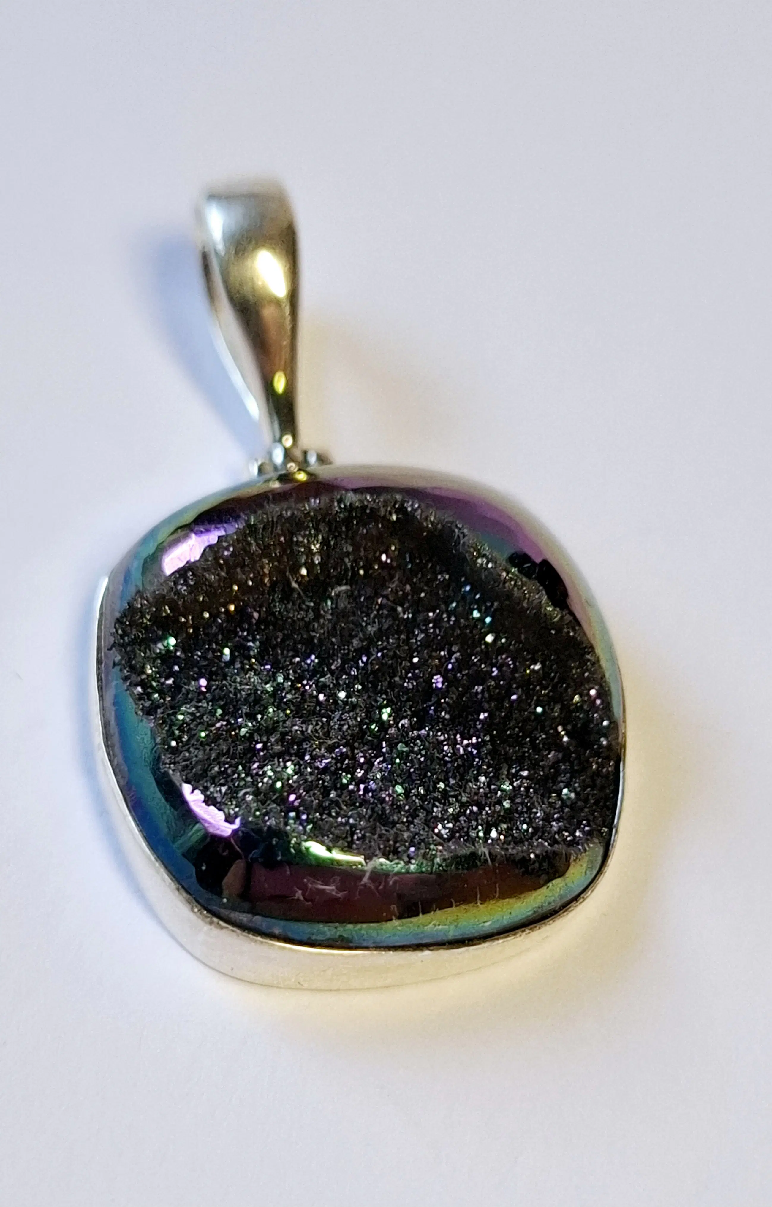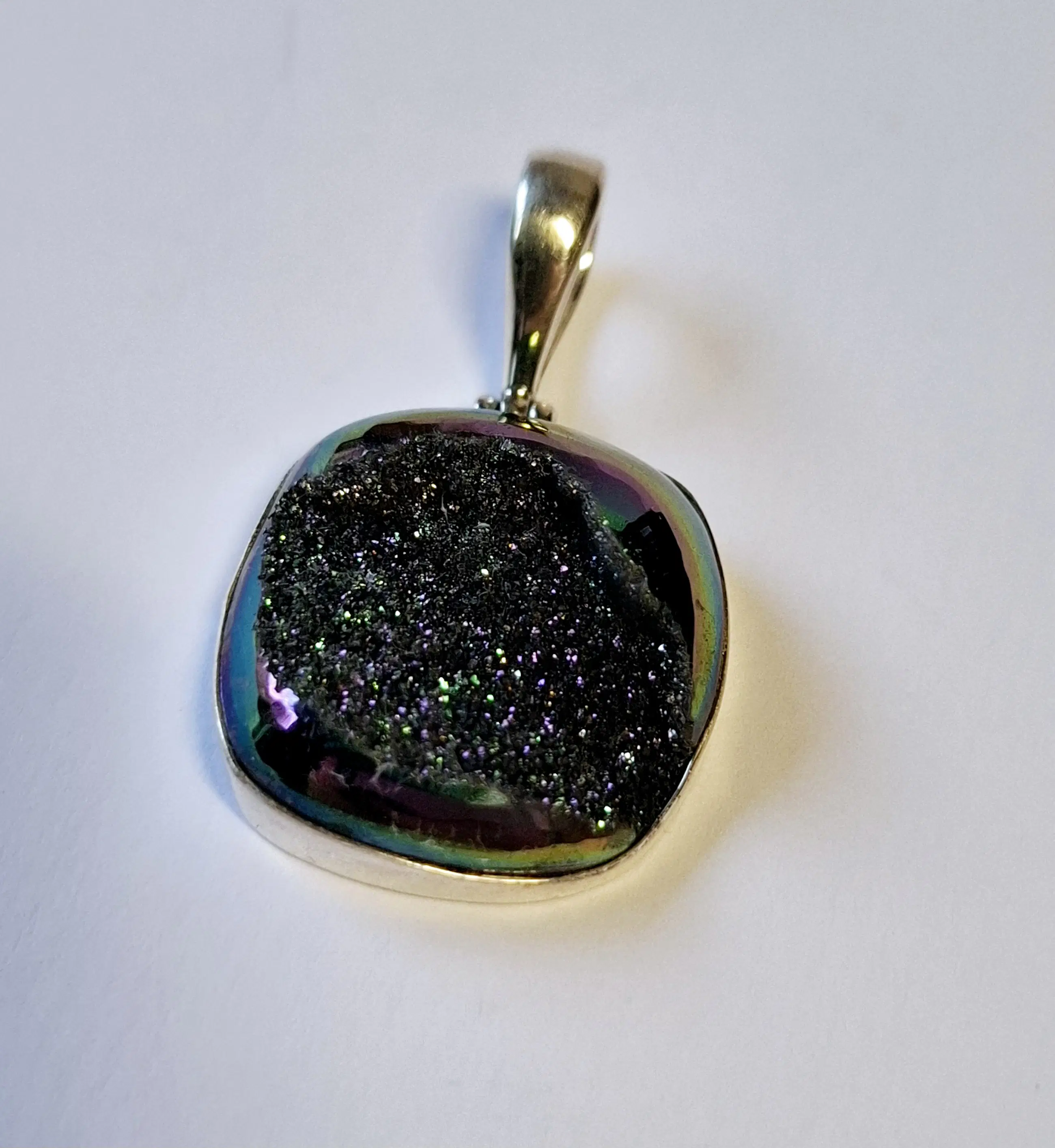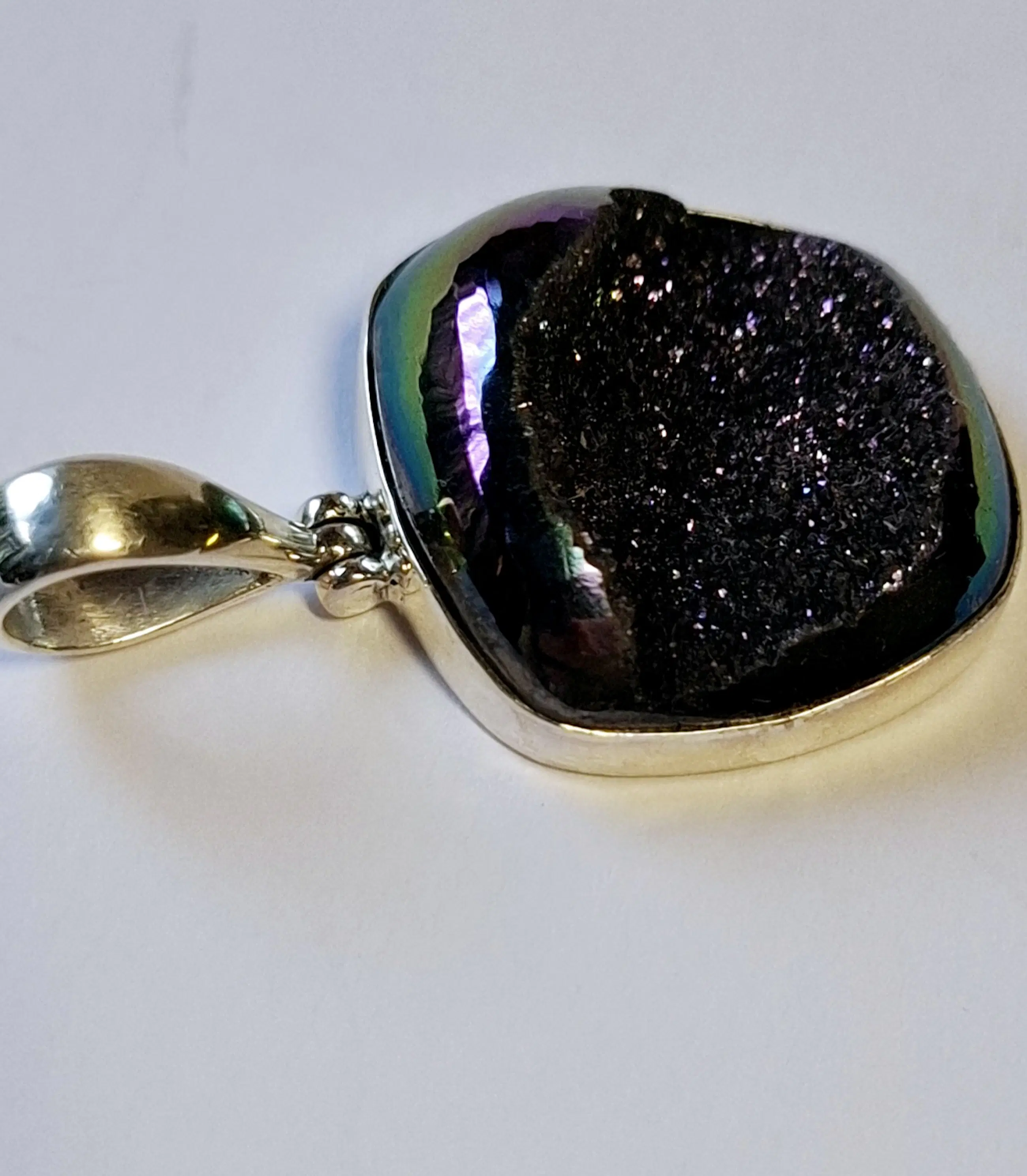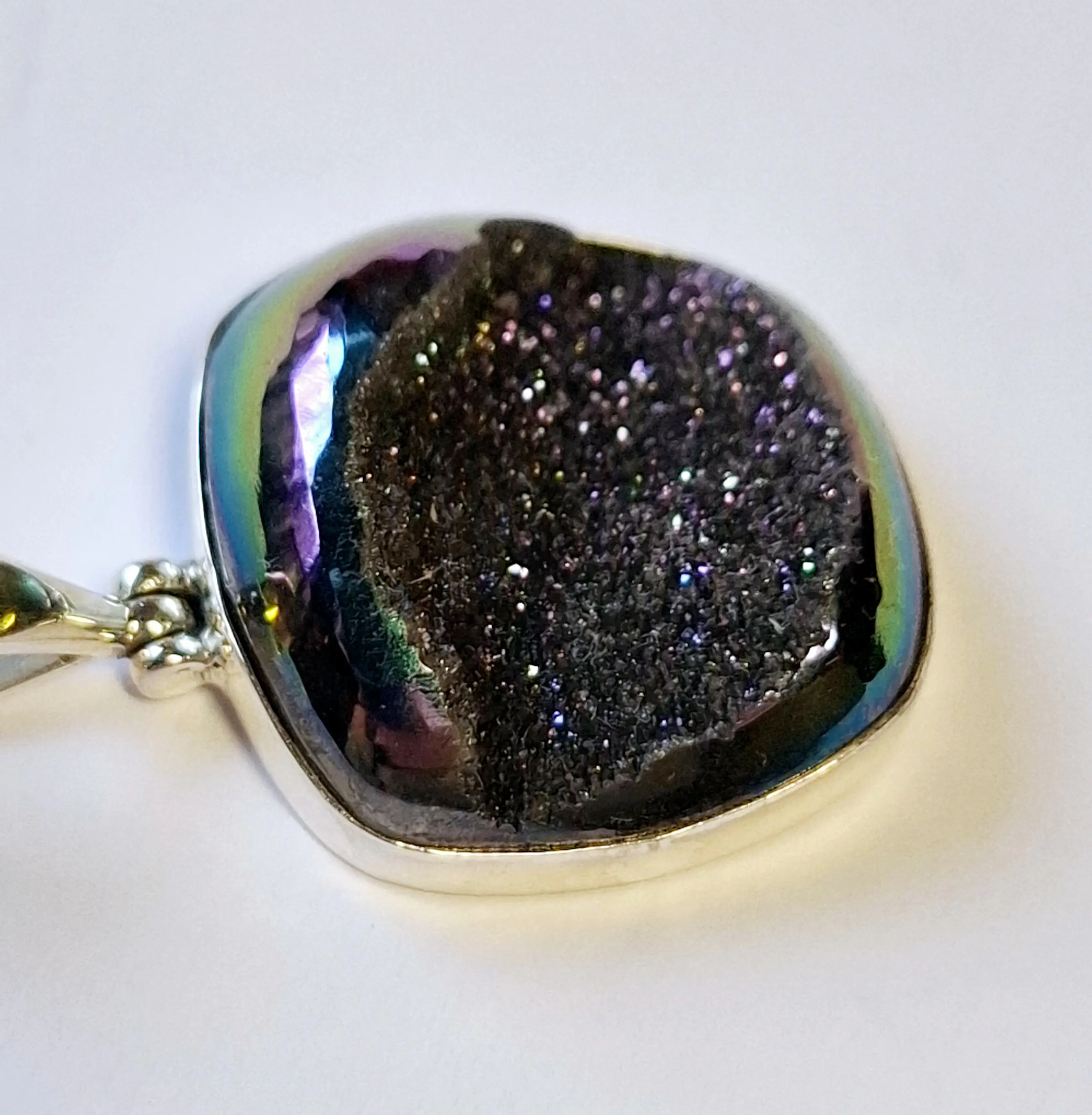 Nieuw , Regenboogniobium titanium druzy-hanger, Natuurlijke mooie vierkante druzy-steen, Masief sterlingzilveren Hart borgtocht hanger . Volledige lengte is 3,5 cm x 2 cm In het echt is het veel mooier . Gemaakt in 2001 . Nog nooit gedragen komt uit een prive Collectie van klant. Altijd in een vitrine bak gelegen . Foto's maken deel uit van de beschrijving . Word goed verpakt en verzekerd verzonden met track en trace .