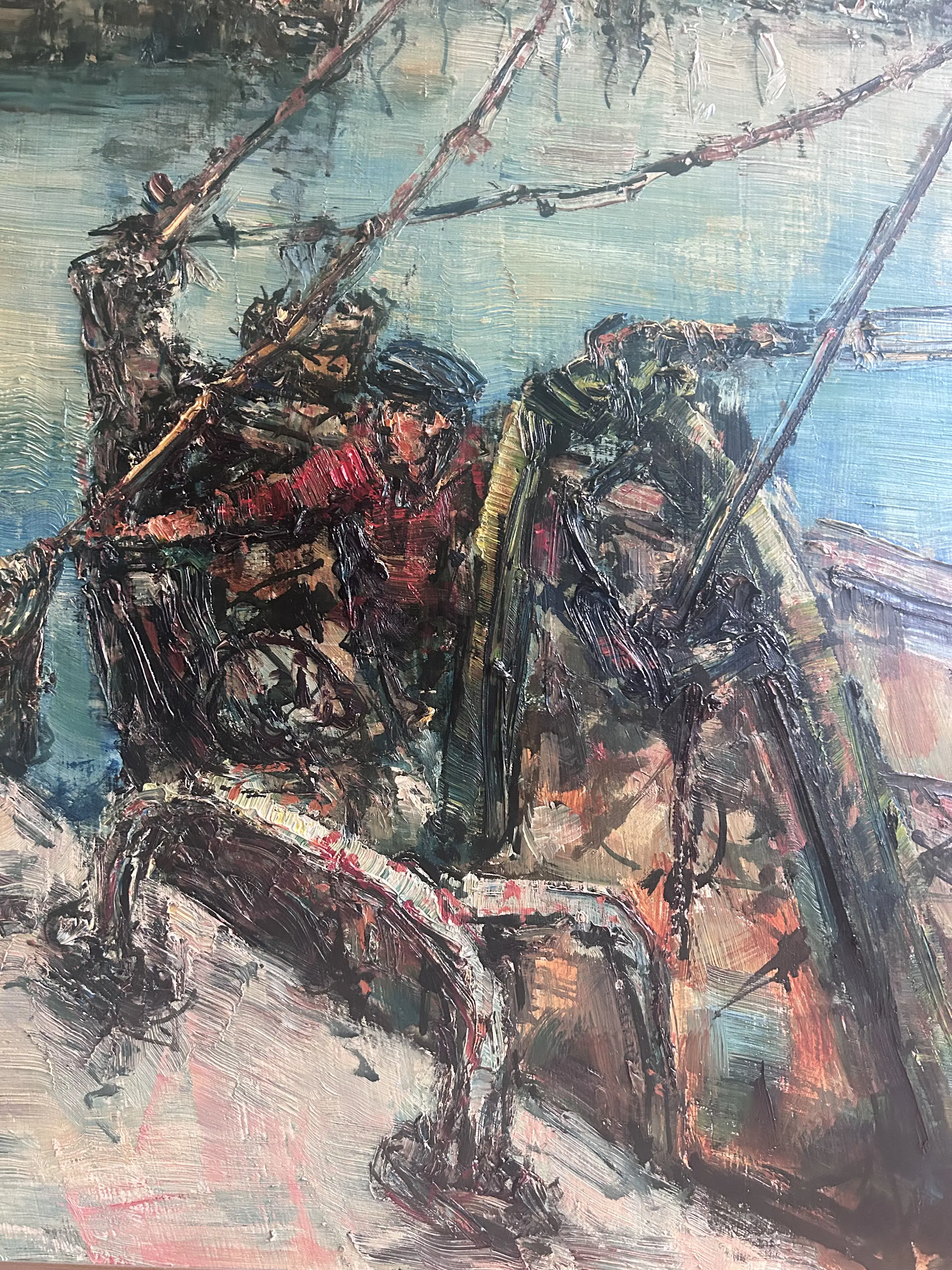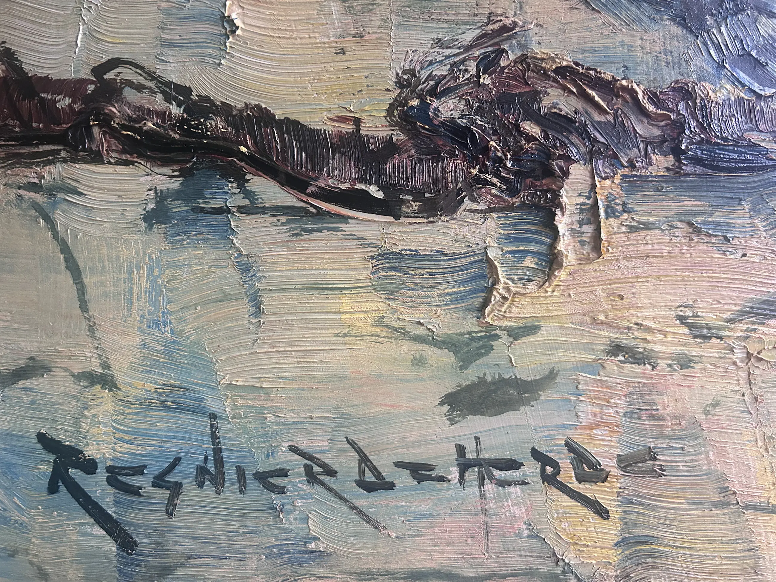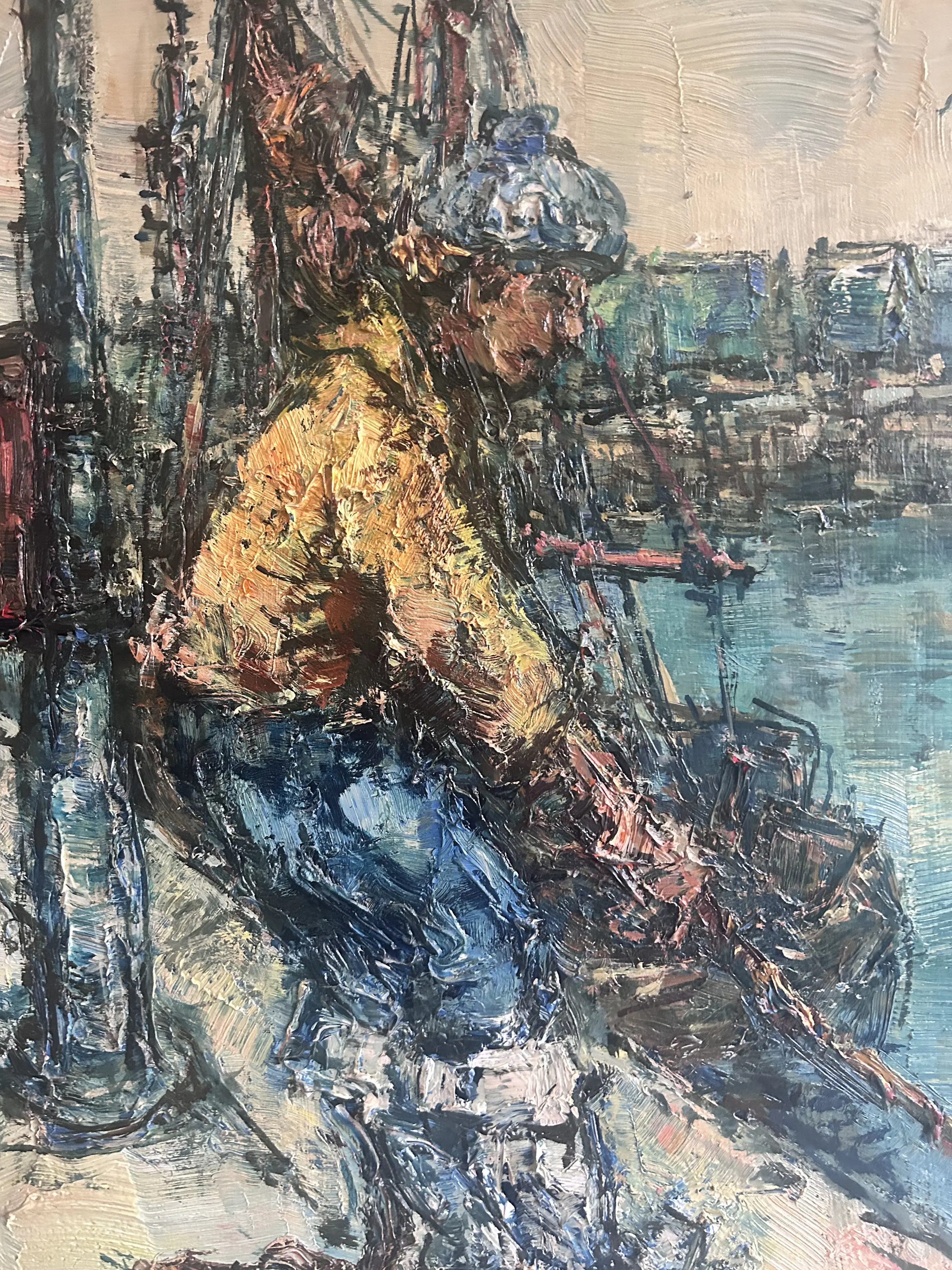 Een indrukwekkend en grootschalig olieverfschilderij van de Belgische kunstenaar Regnier de Herde (1914–2004). Dit werk, getiteld "Aan de visserskaai - Oostende", toont de kunstenaar op zijn best: een levendig, post-impressionistisch havengezicht met vissers aan het werk. Met zijn herkenbare pasteuze verfgebruik en oog voor maritieme sfeer heeft De Herde een tijdloos beeld van de Oostendse visserskaai gecreëerd. Vanwege de aanzienlijke afmetingen en de gewilde locatie (Oostende) is dit een topstuk voor liefhebbers van Belgische kunst.