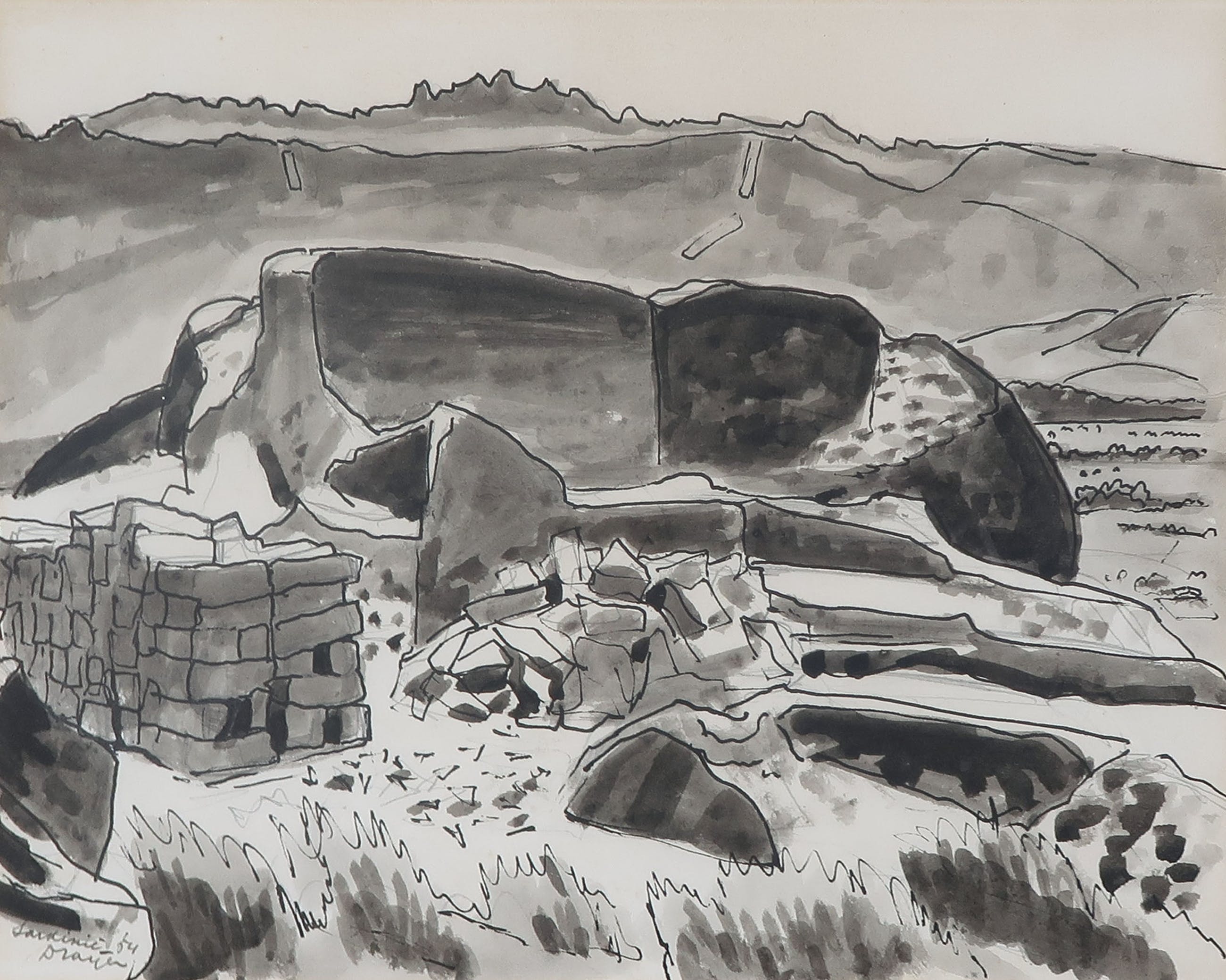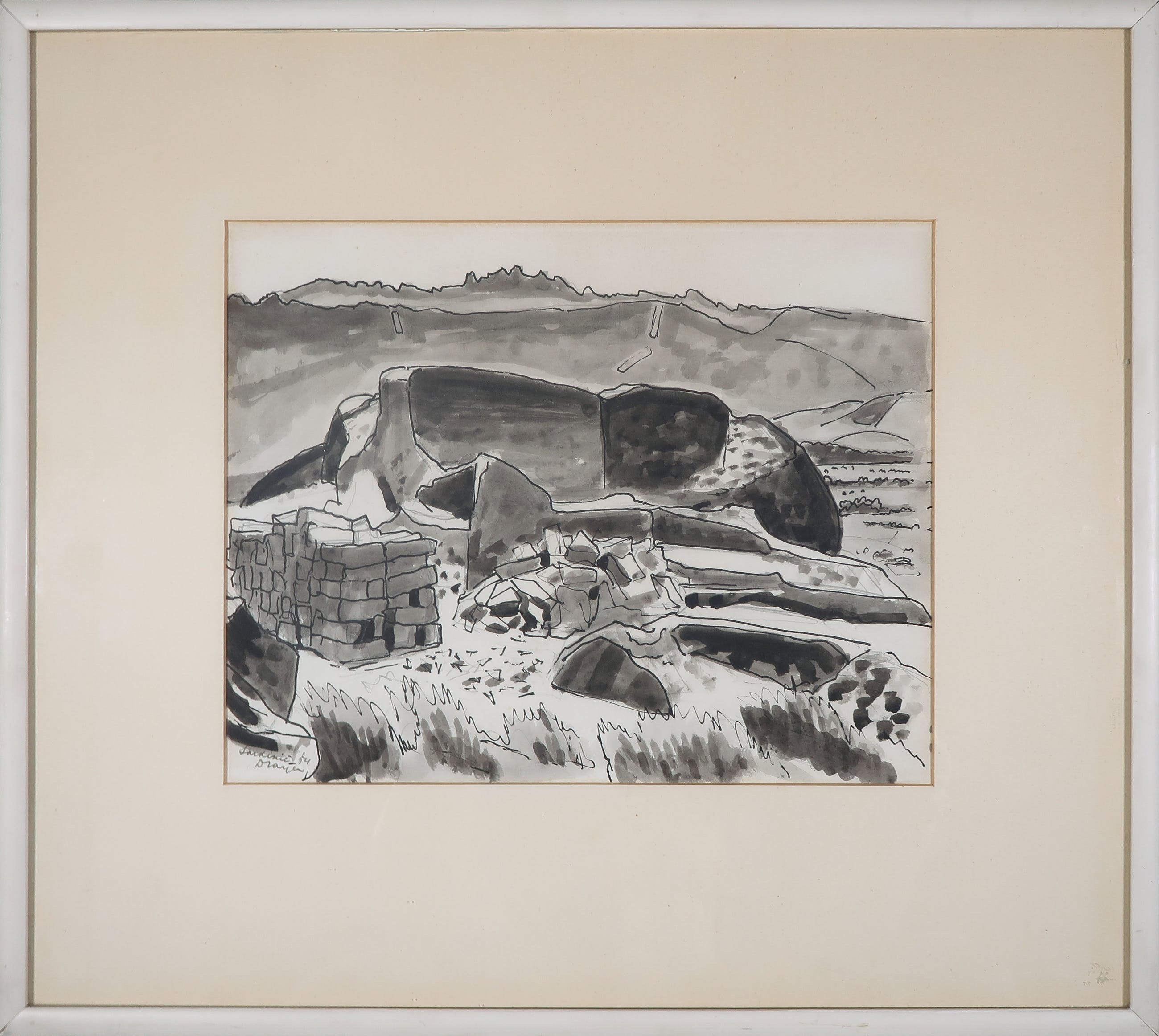 Penseeltekening in gewassen inkt van een steenhouwerij op Sardinië. Het werk is door de vorige eigenaar in 2005 aangekocht bij Glerum Auctioneers te Amsterdam. Het originele factuur en betaalbewijs worden meegeleverd.