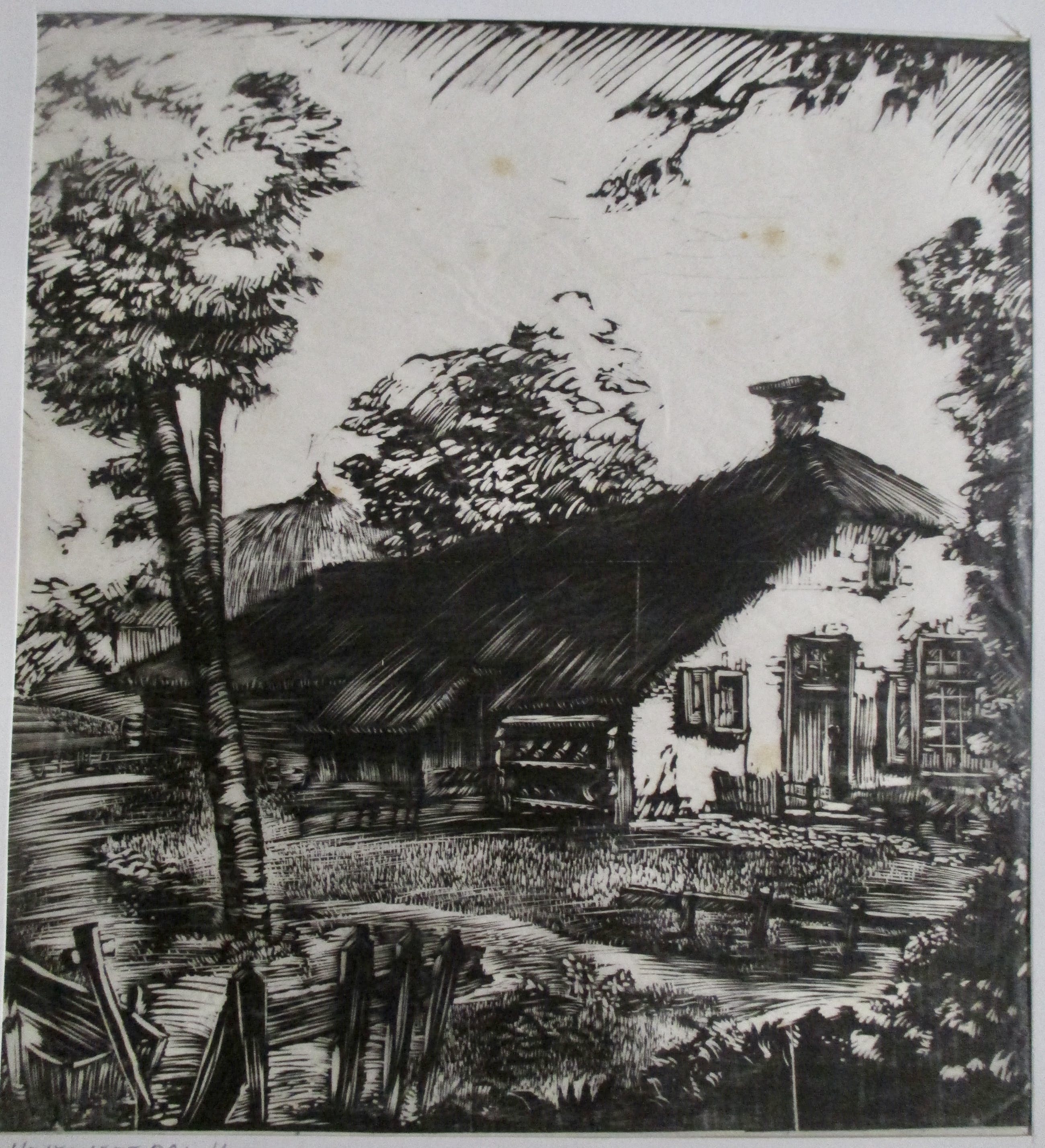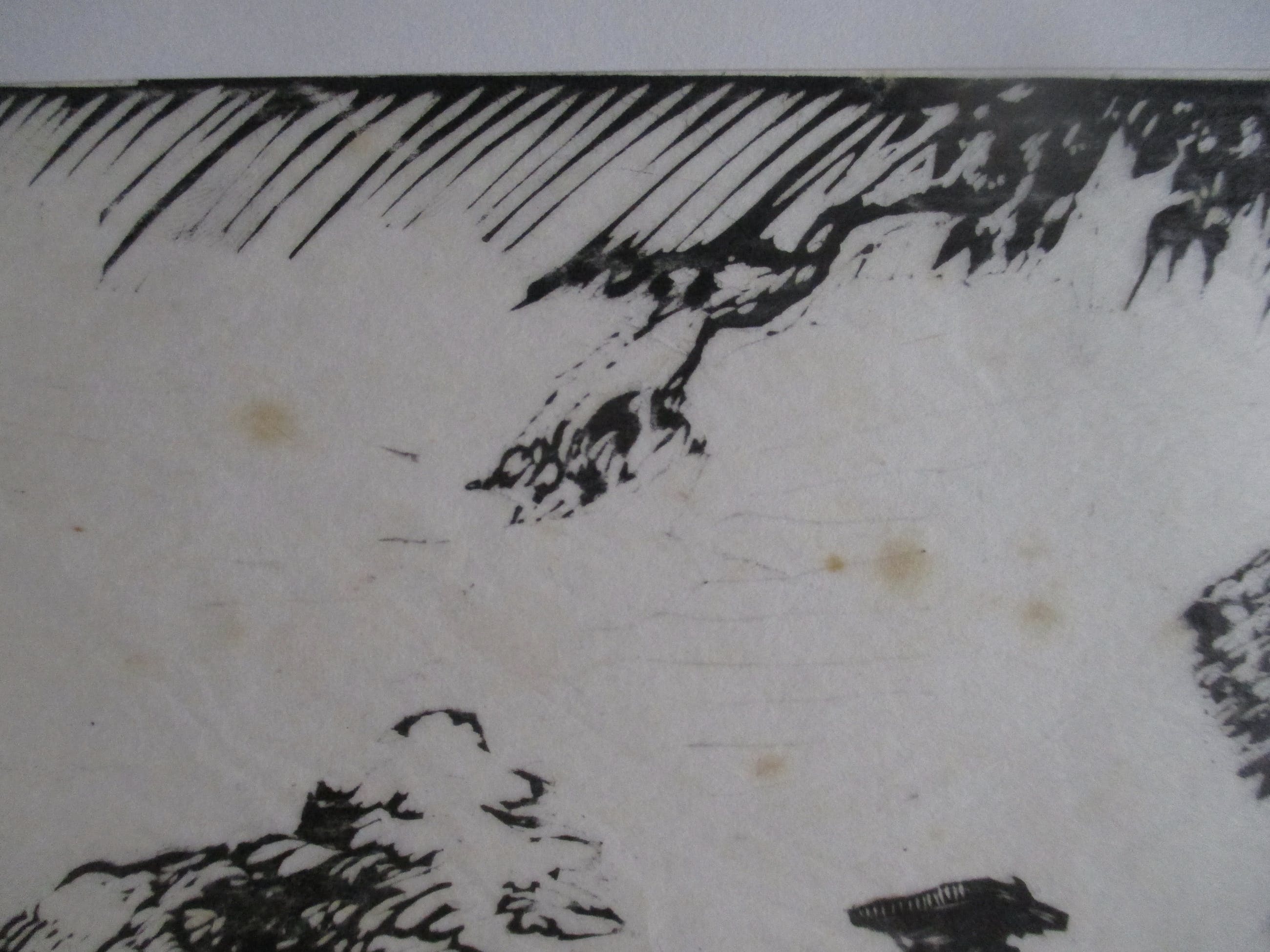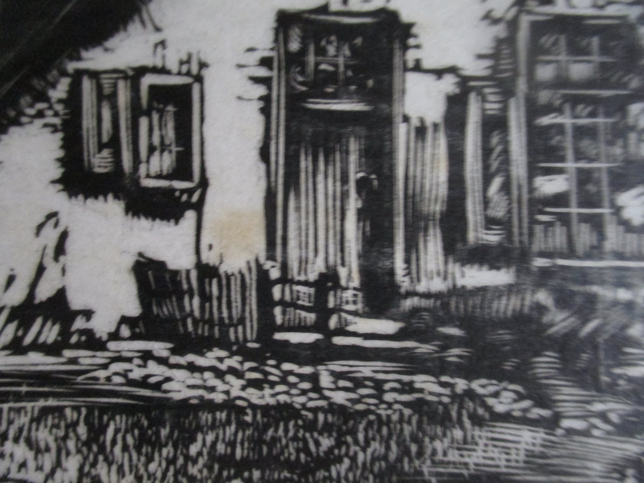 | er loopt een vertikale snede van ca 3 cm over het midden van het beeld, en ook een van 1 cm onderaan het beeld.het is niet storend omdat de snede zo scherp is. Enkele foxingplekjes in de lucht en naast de deur | |||
