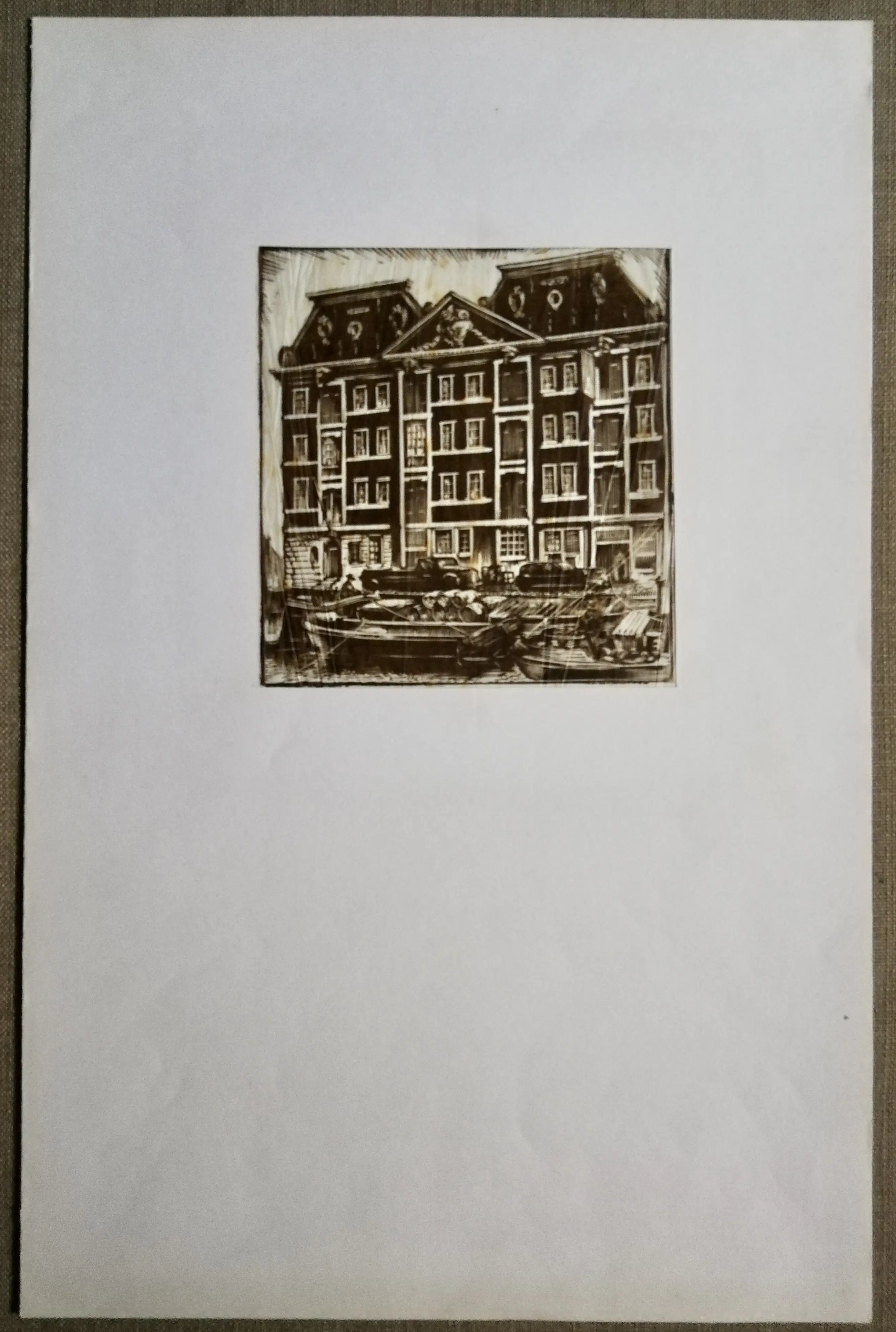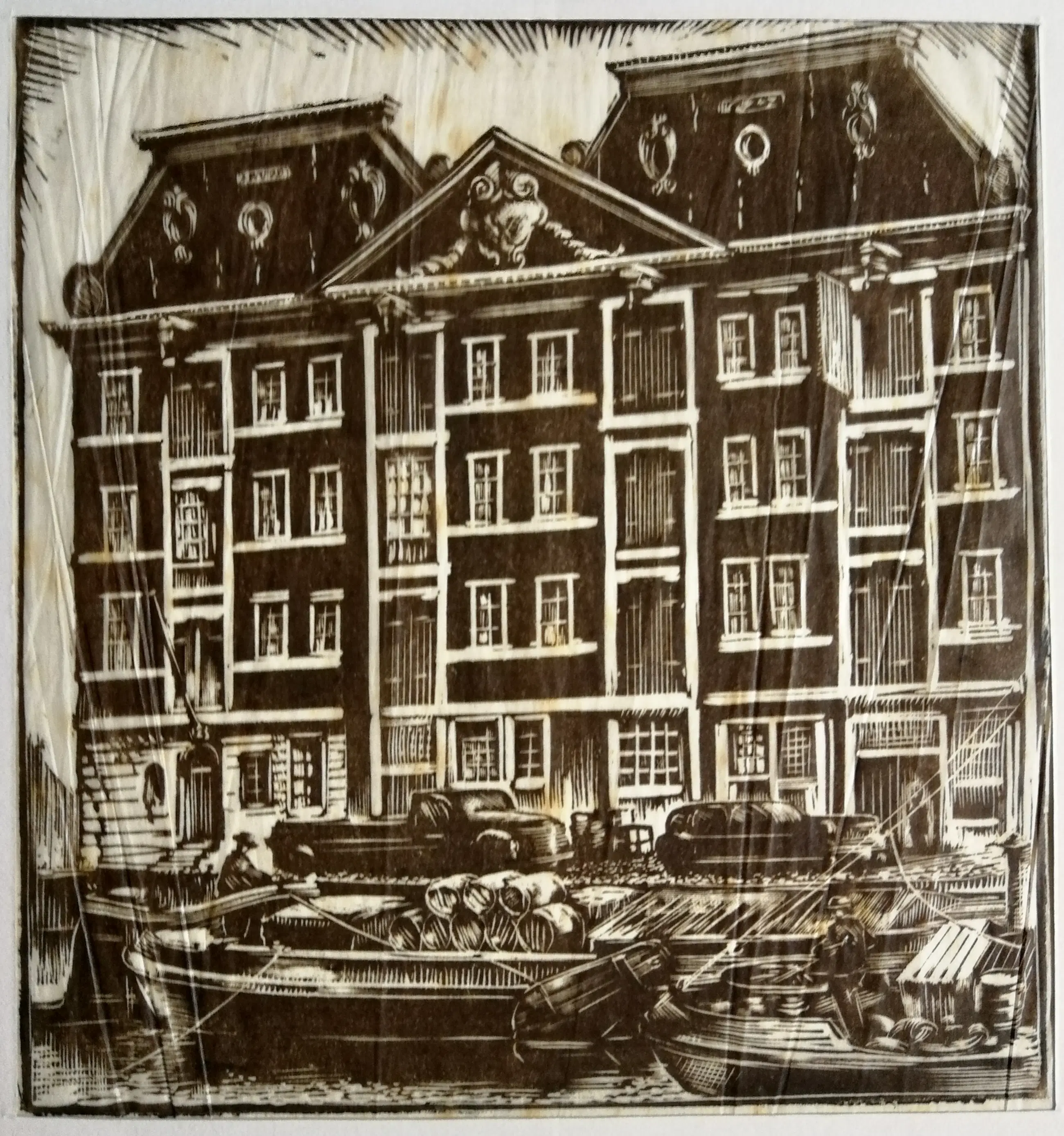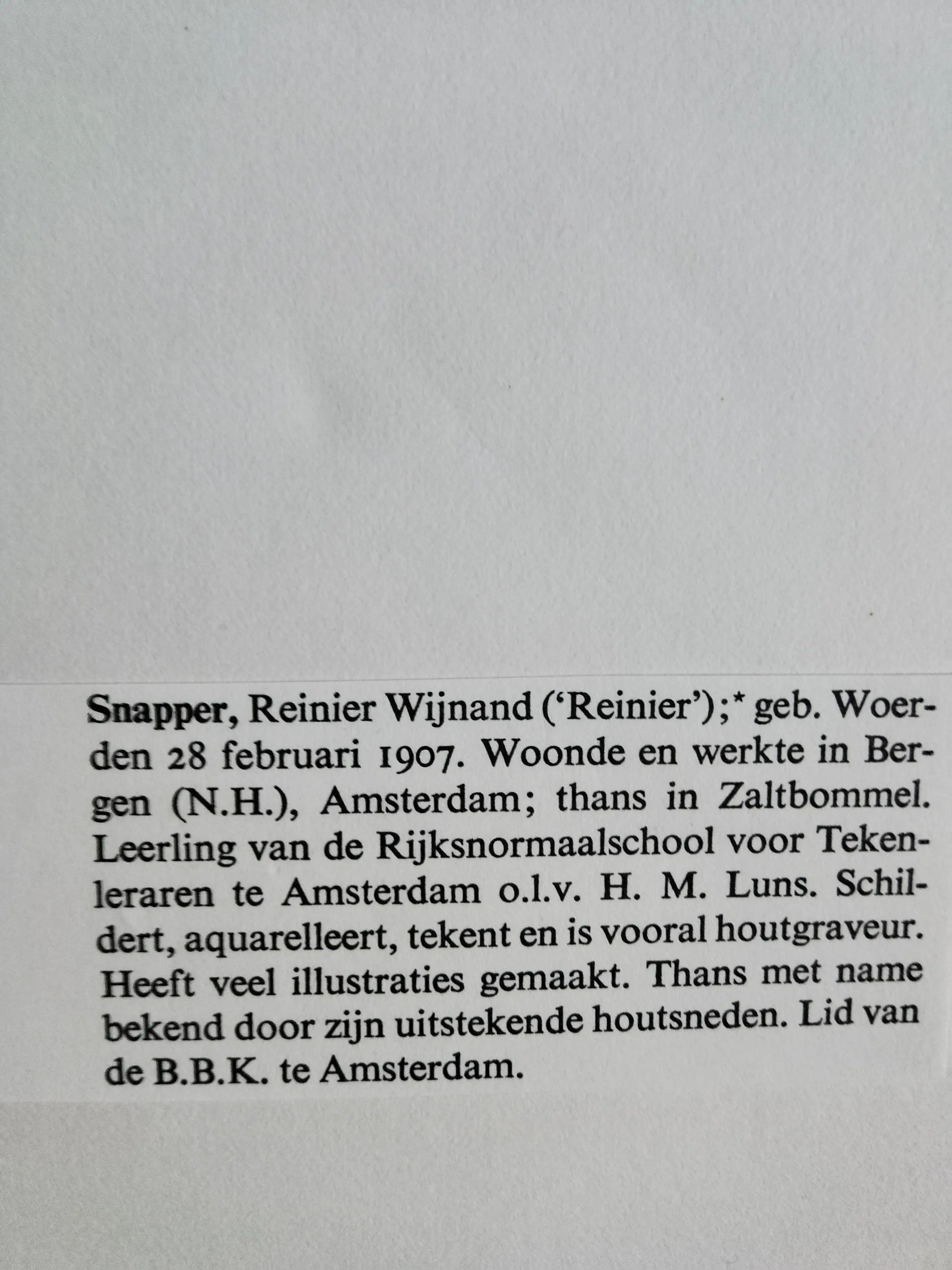 Twee houtsneden van Rein Snapper, beide geplakt in dun papieren passe-partout. De kleinere (huizen) is 17x16 cm. verzending tussen twee platen, 9,25