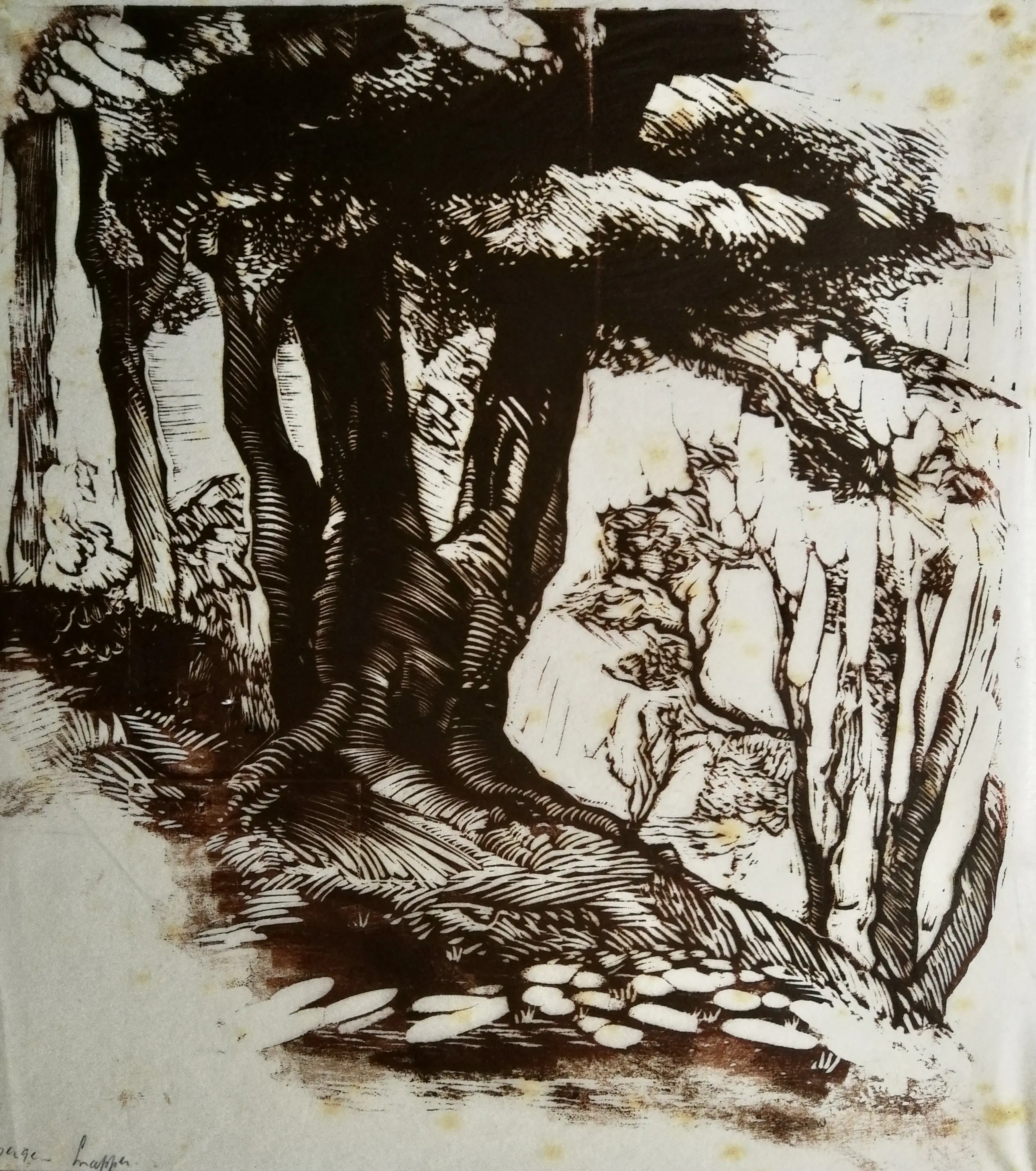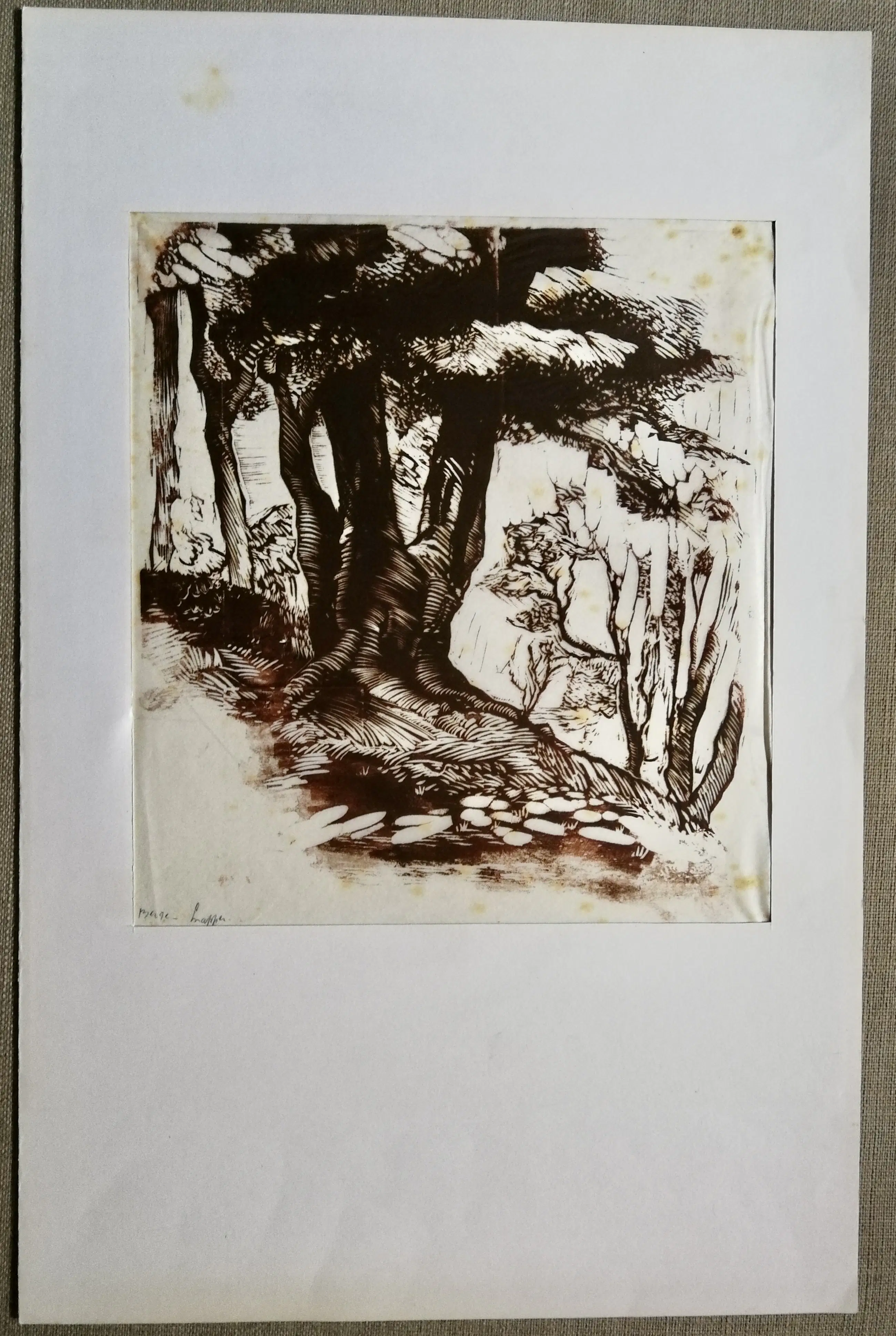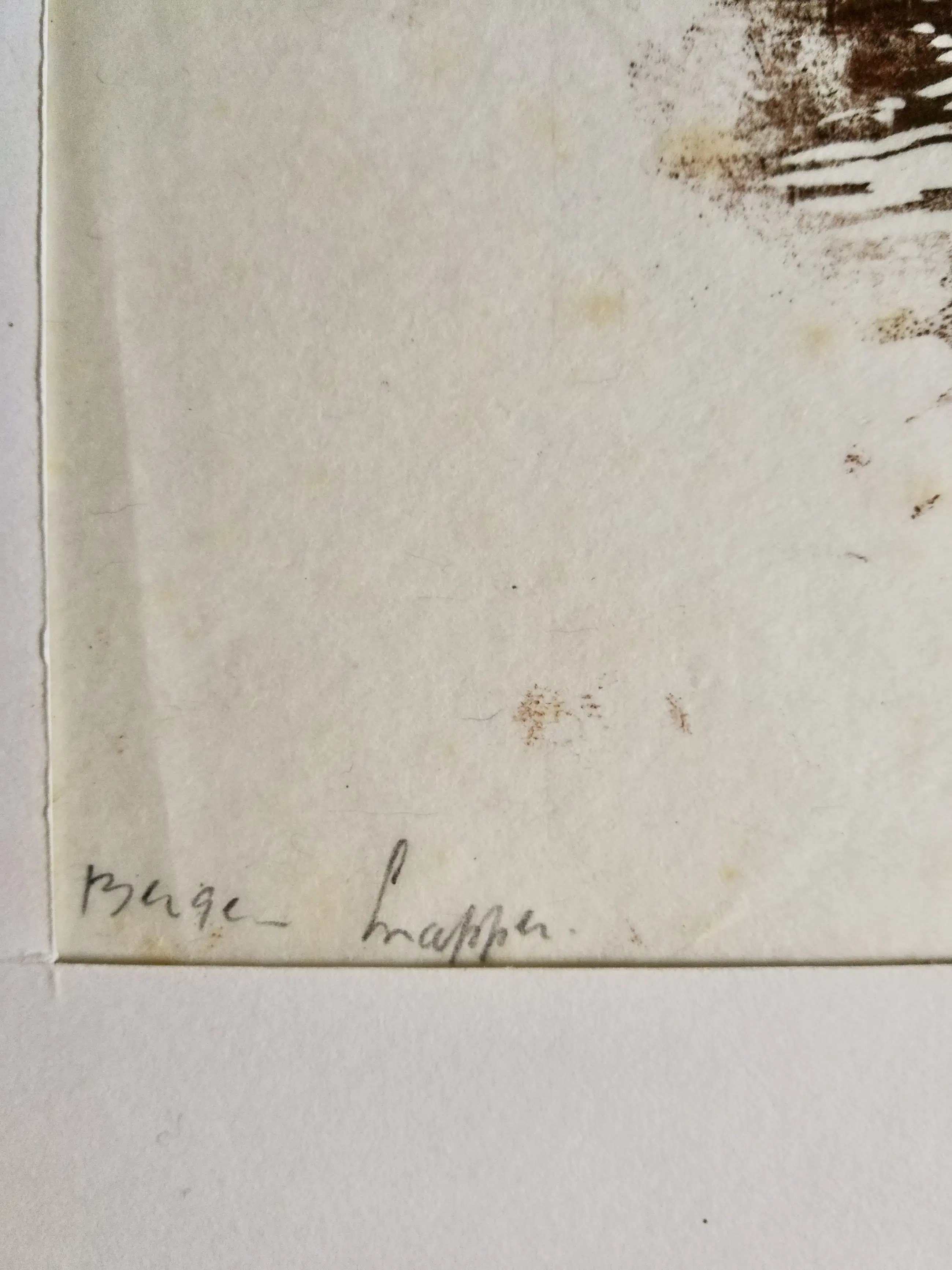 Twee houtsneden van Rein Snapper, beide geplakt in dun papieren passe-partout. De kleinere (huizen) is 17x16 cm. verzending tussen twee platen, 9,25