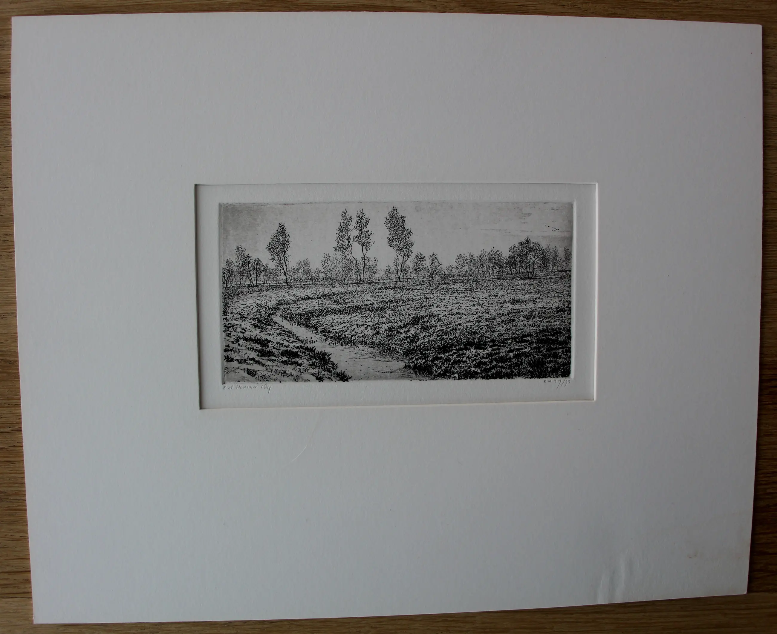 Ets van Reinder Homan. Titel: Landschap met een sloot. Jaar: 1989. Oplage: 39/75. Afmetingen incl passe-partout: H24 x b30cm. Afmetingen voorstelling: H7 x b13.5cm. Het werk is links onderaan, met potlood, gesigneerd door de kunstenaar. De authenticiteit van het aangeboden werk wordt volledig gegarandeerd. Een certificaat van echtheid kan, op aanvraag, worden gemaild.