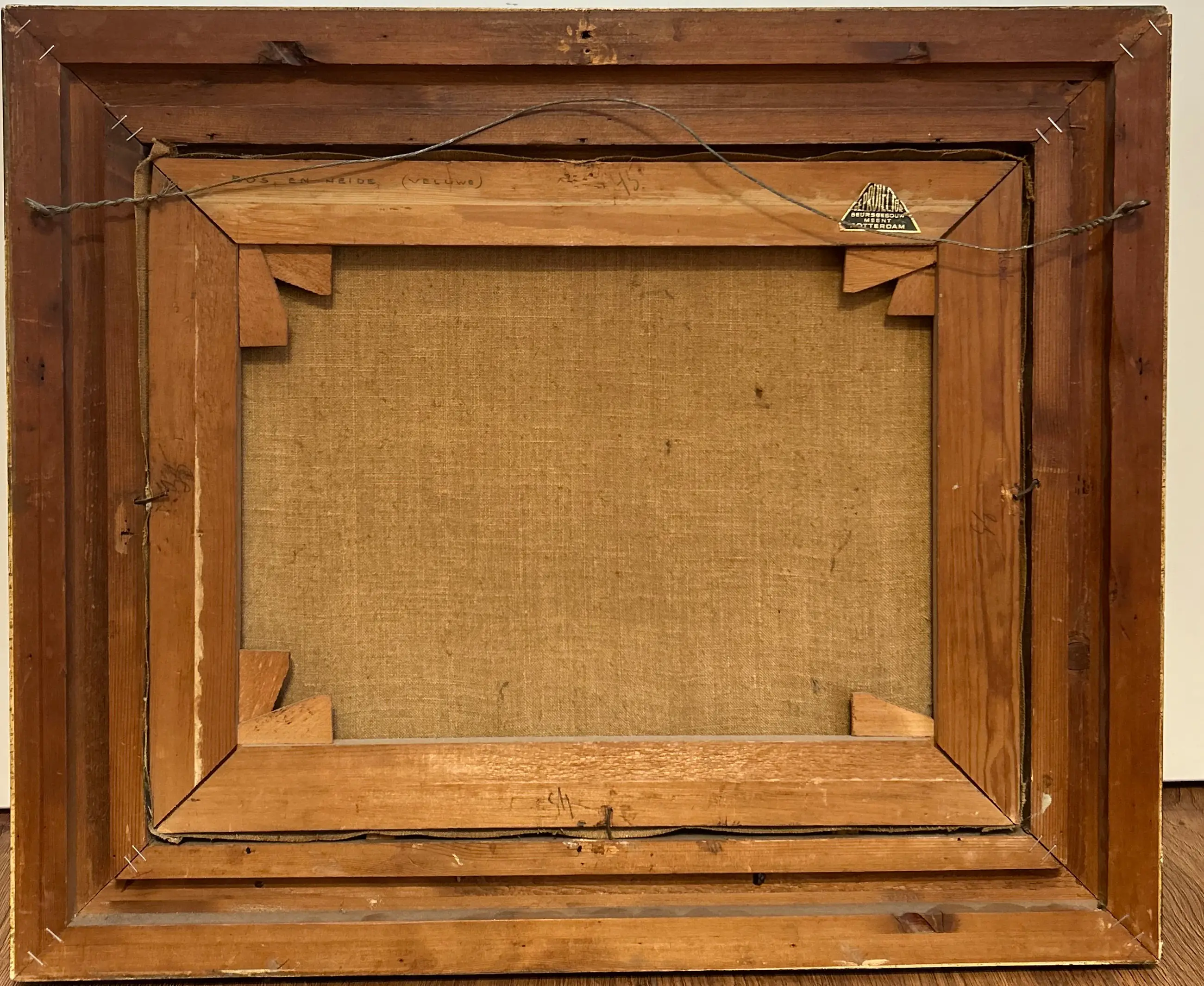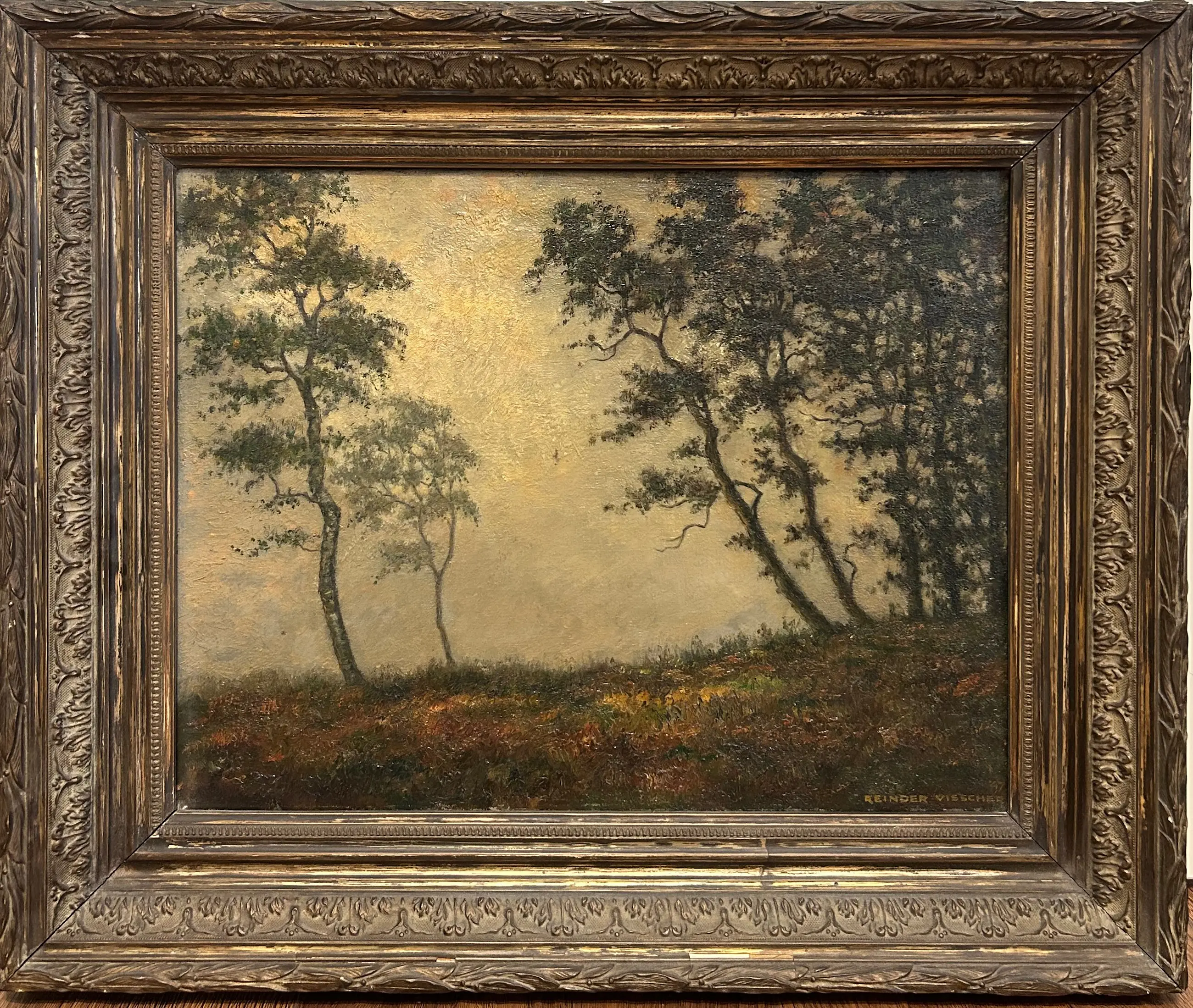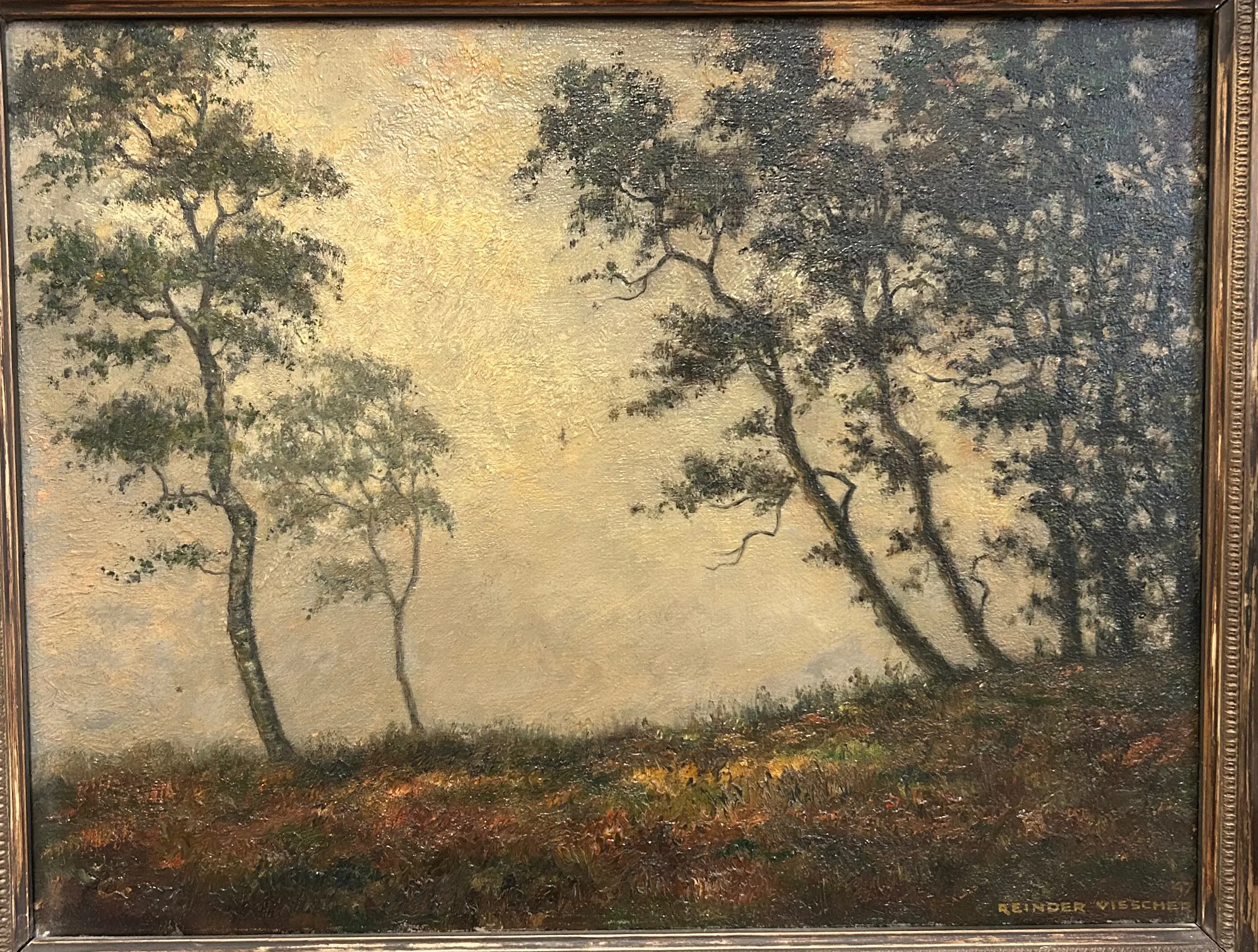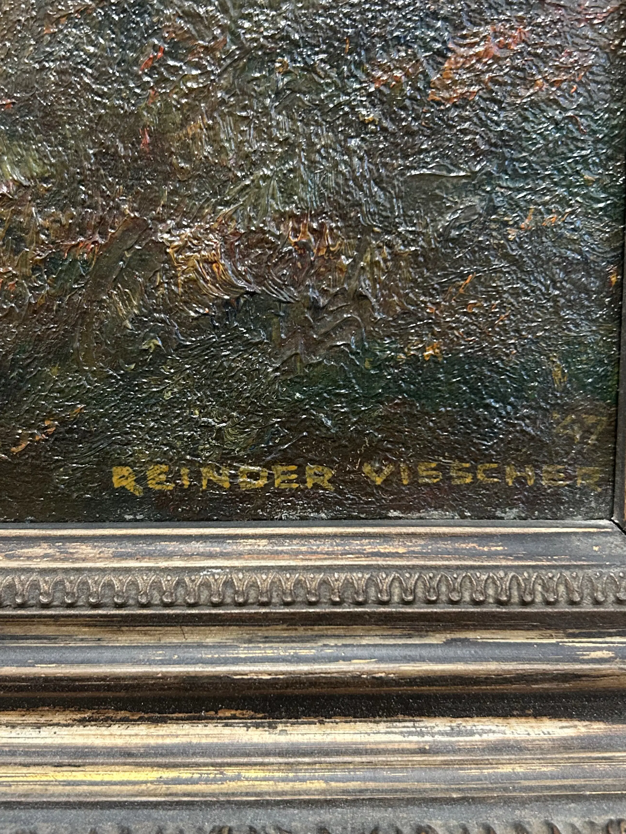 Schilderij van Reinder Visscher – Bos en heide (Veluwe) Mooi schilderij in de karakteristieke stijl van Reinder Visscher, met een voorstelling van bos en heide op de Veluwe. Het werk verkeert over het algemeen in goede staat. De lijst vertoont een kleine schade aan de zijkant. Zie foto’s voor verdere details en een volledige indruk van het kunstwerk.