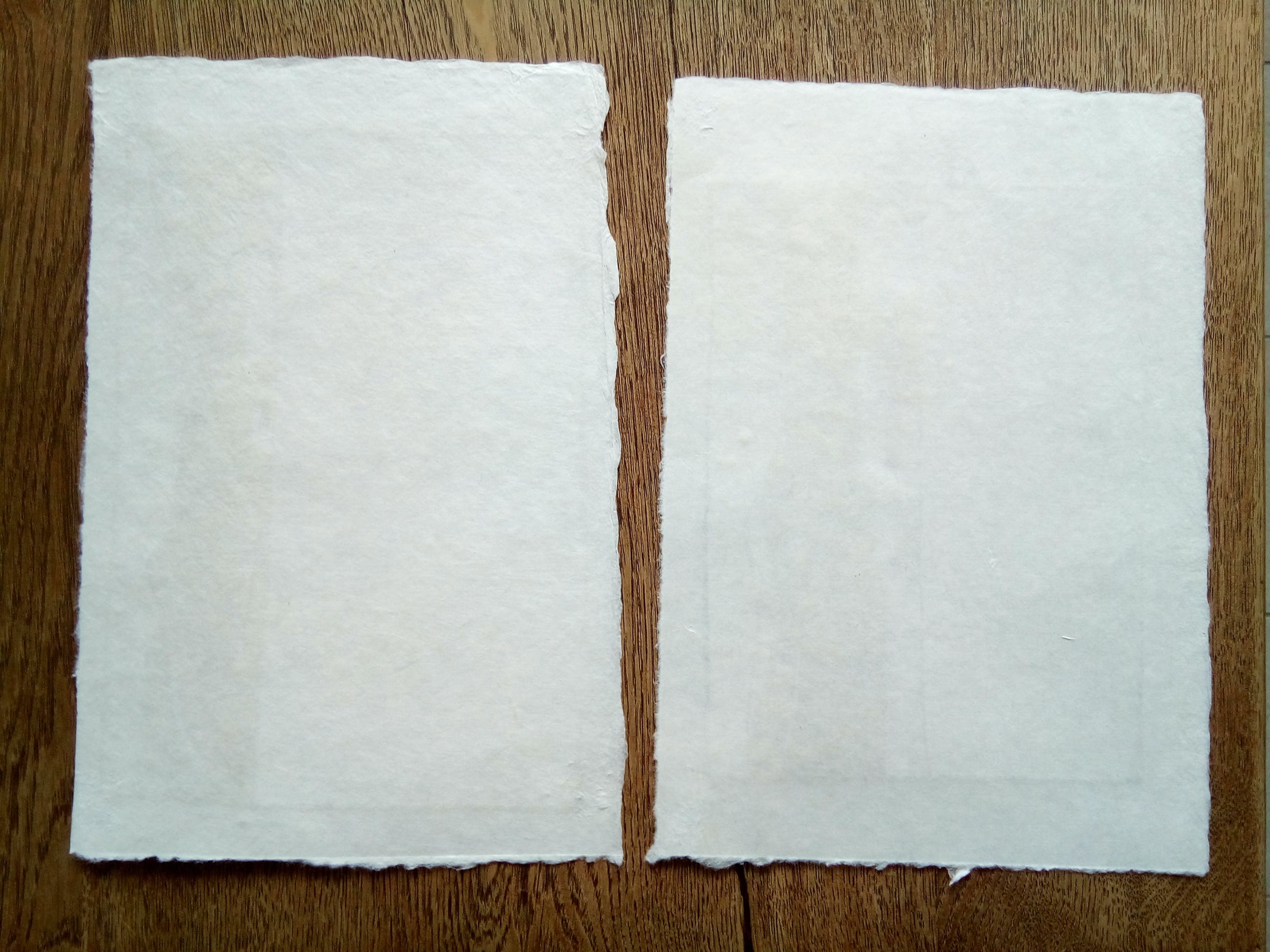 Die beiden Holzschnitte sind sehr gut erhalten, lediglich auf den Rückseiten befinden sich Spuren von Kleberesten (siehe Fotos)