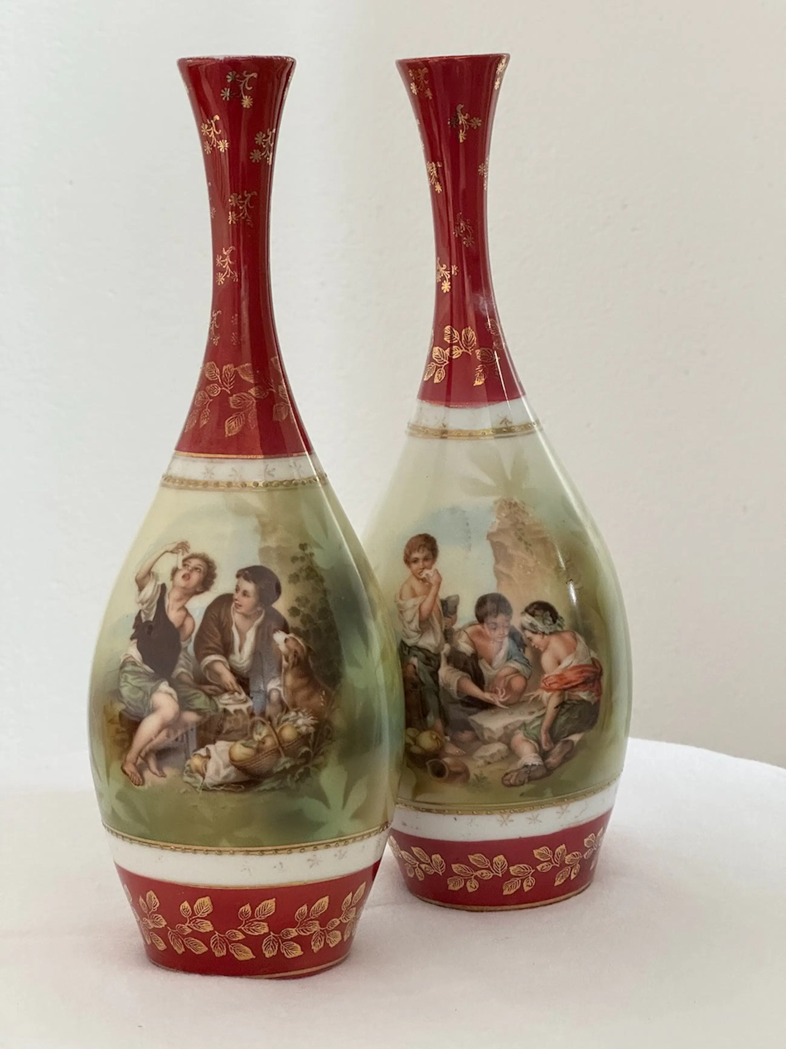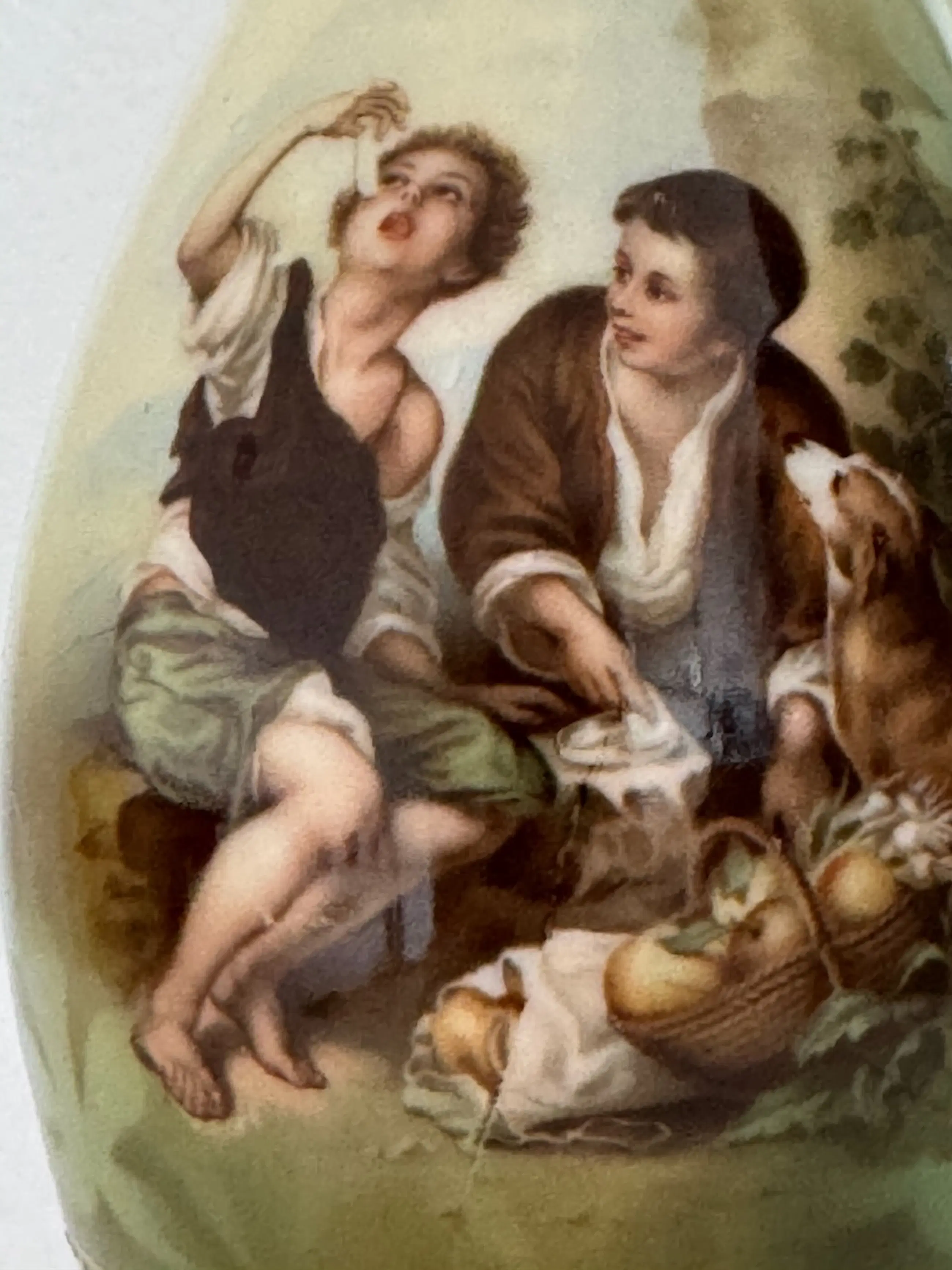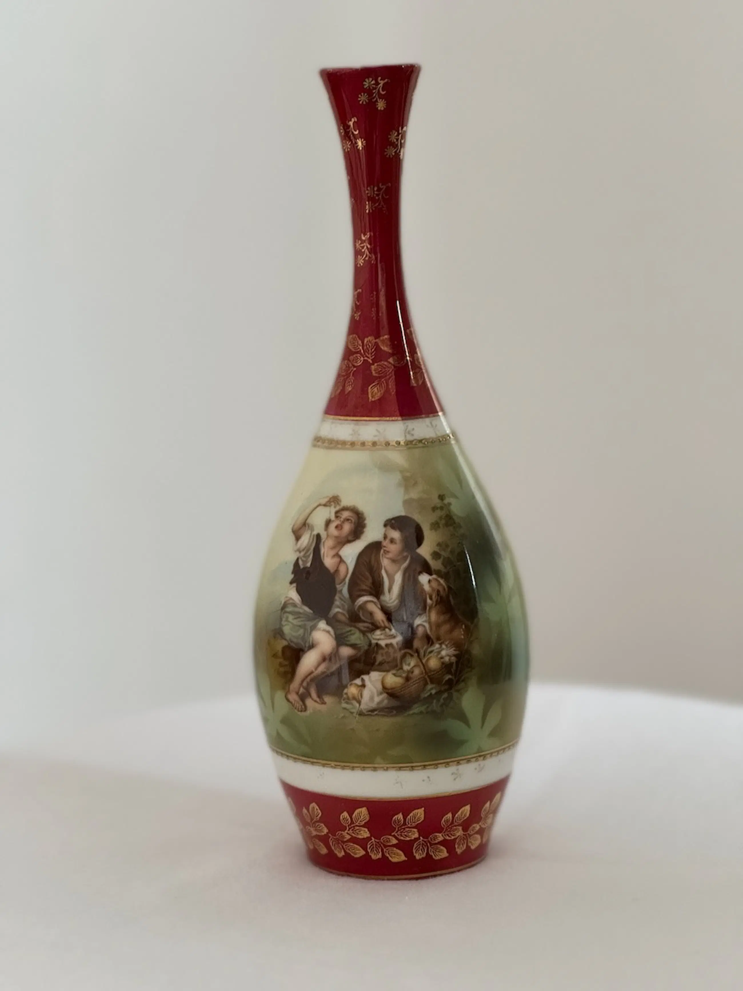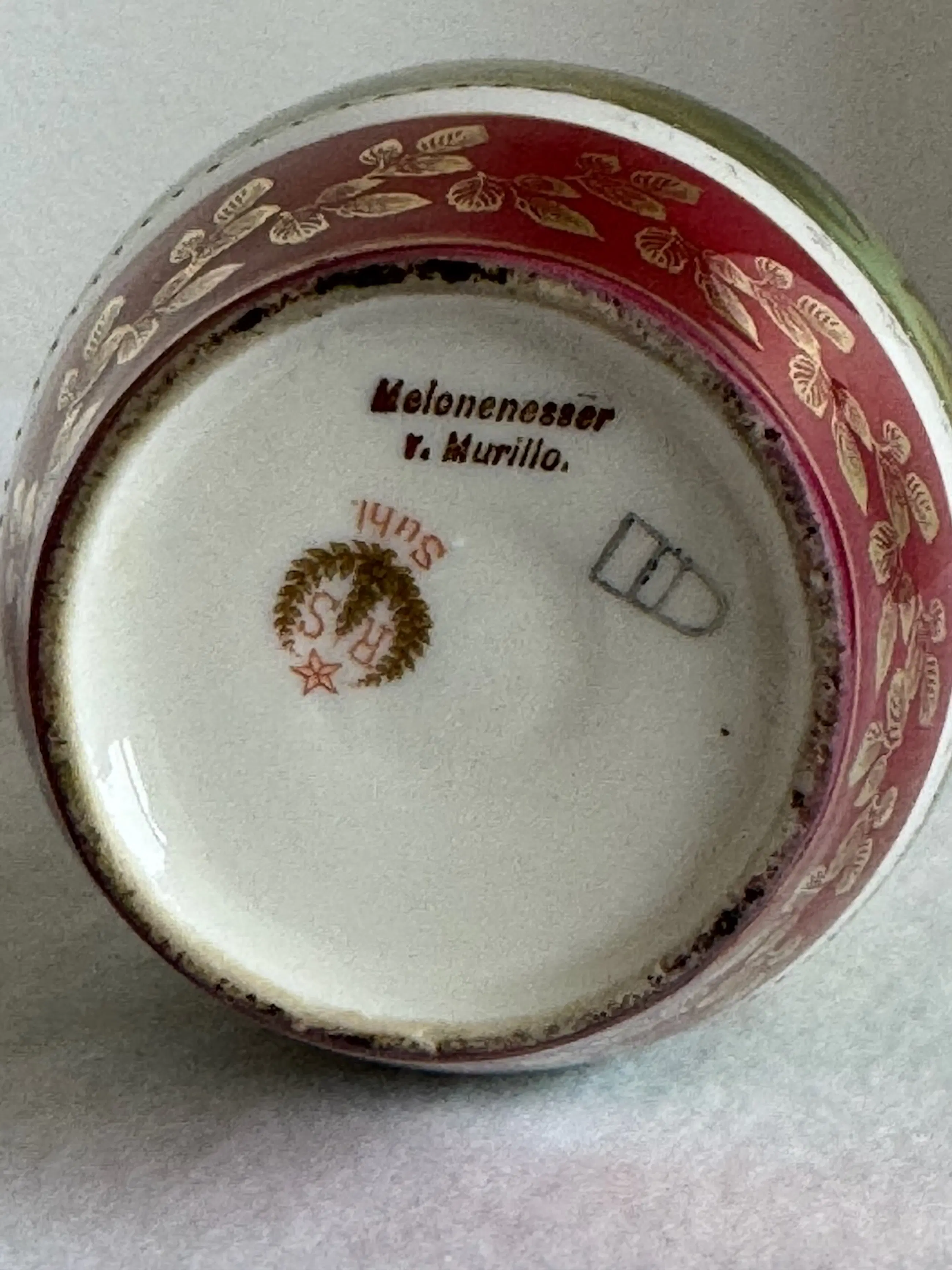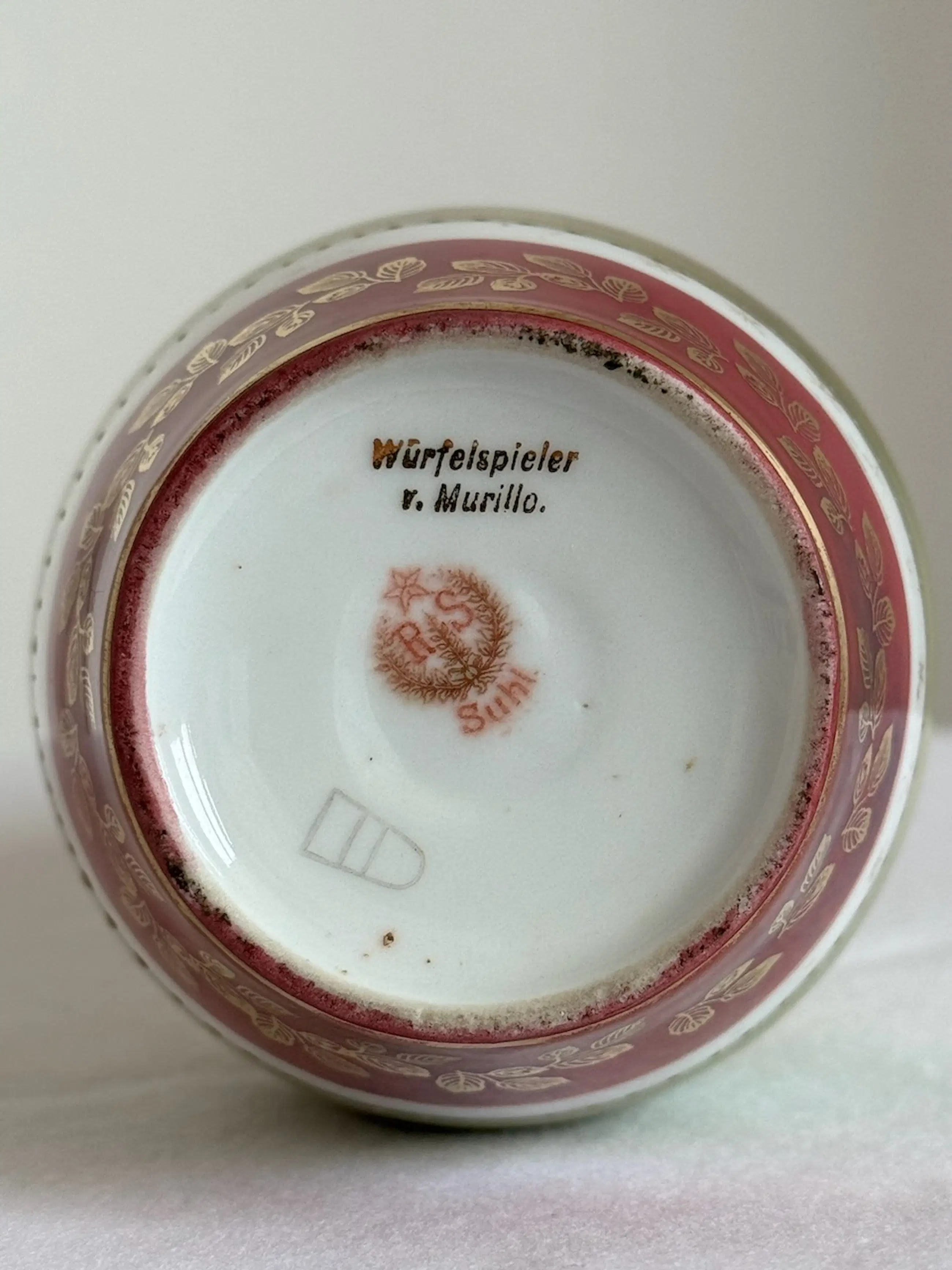 Beroemde porseleinfabriek Reinhold Schlegelmilch uit Suhl. Onderop gemerkt. Delicate vaasjes uit een serie van vier. Deze vaasjes zijn getiteld Melonenesser en Würfelspieler.