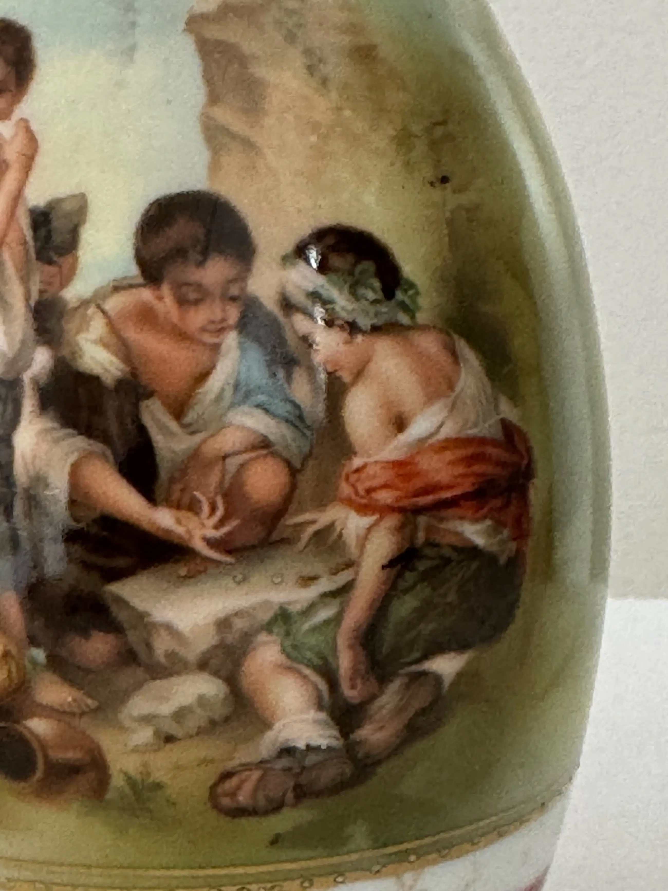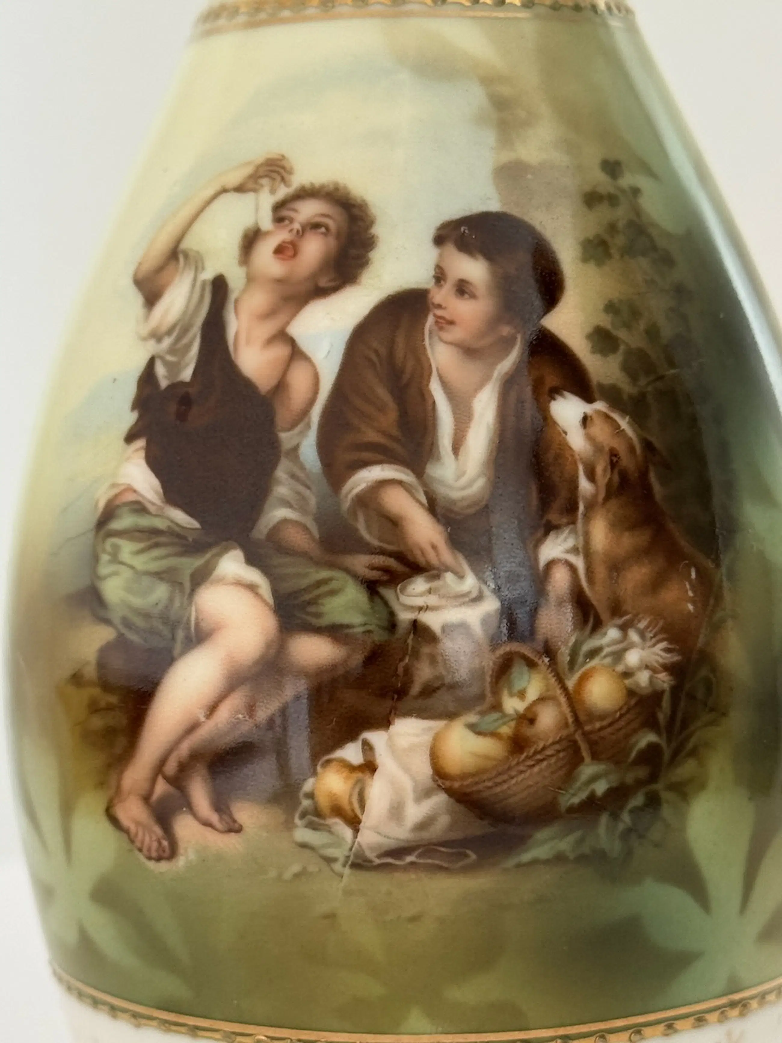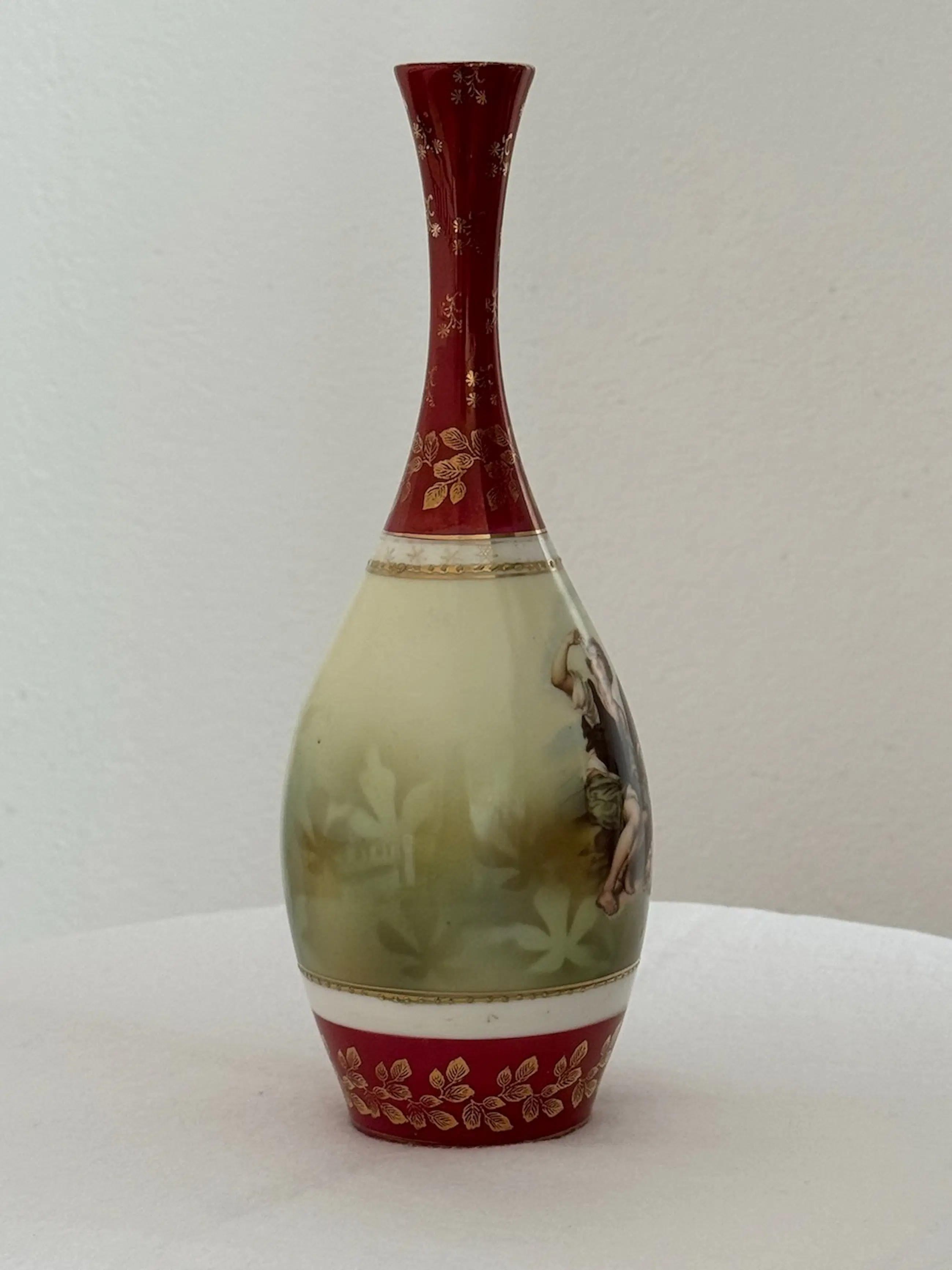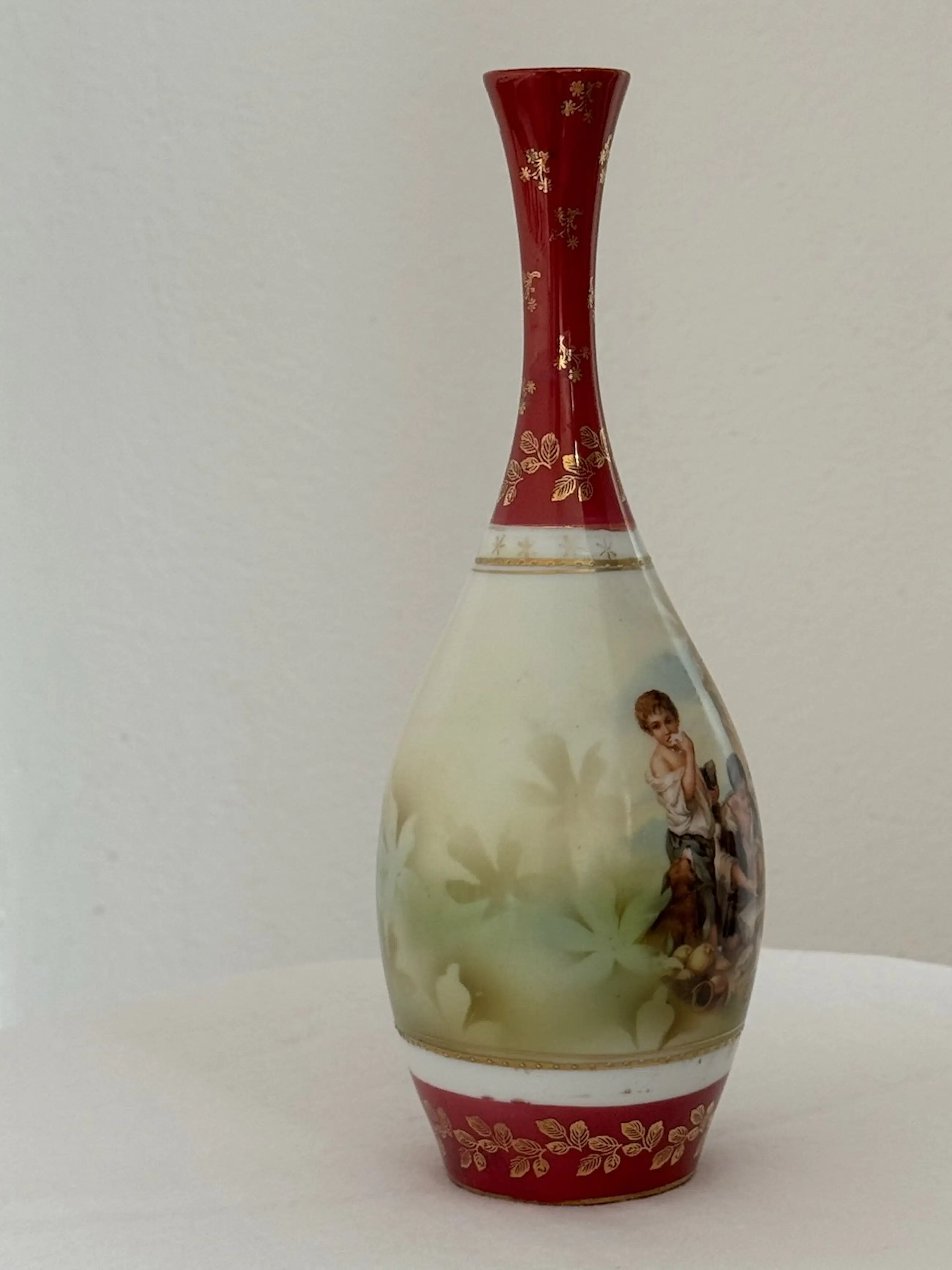 Beroemde porseleinfabriek Reinhold Schlegelmilch uit Suhl. Onderop gemerkt. Delicate vaasjes uit een serie van vier. Deze vaasjes zijn getiteld Melonenesser en Würfelspieler.