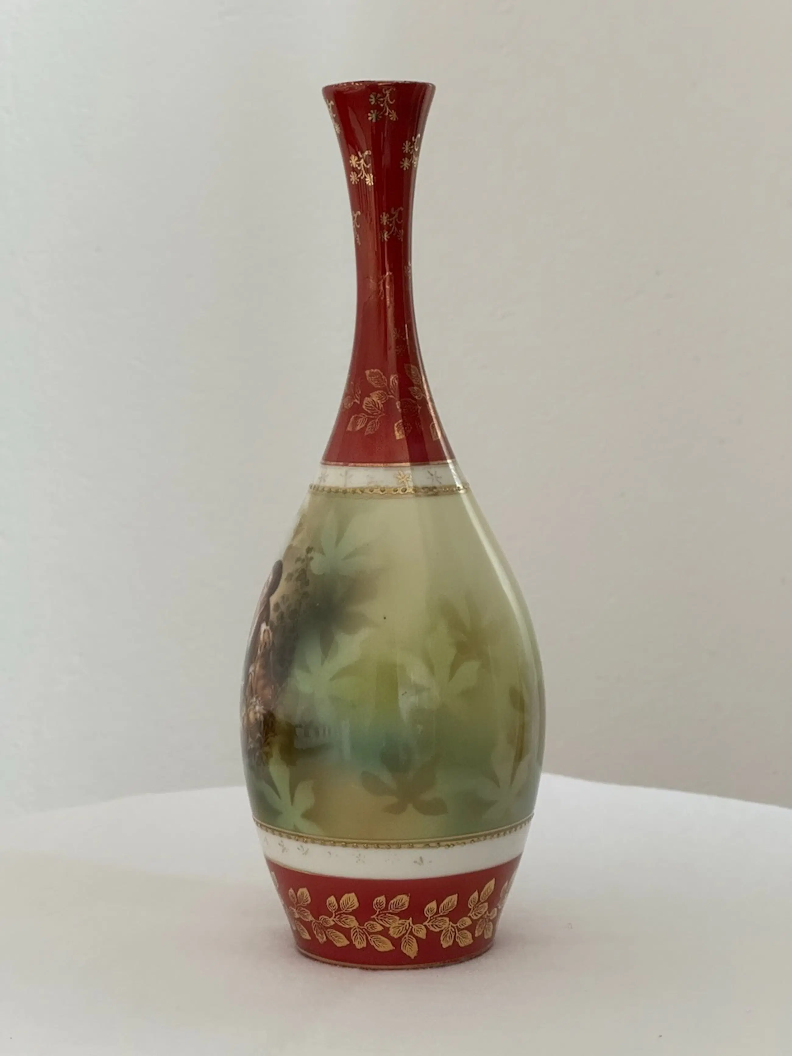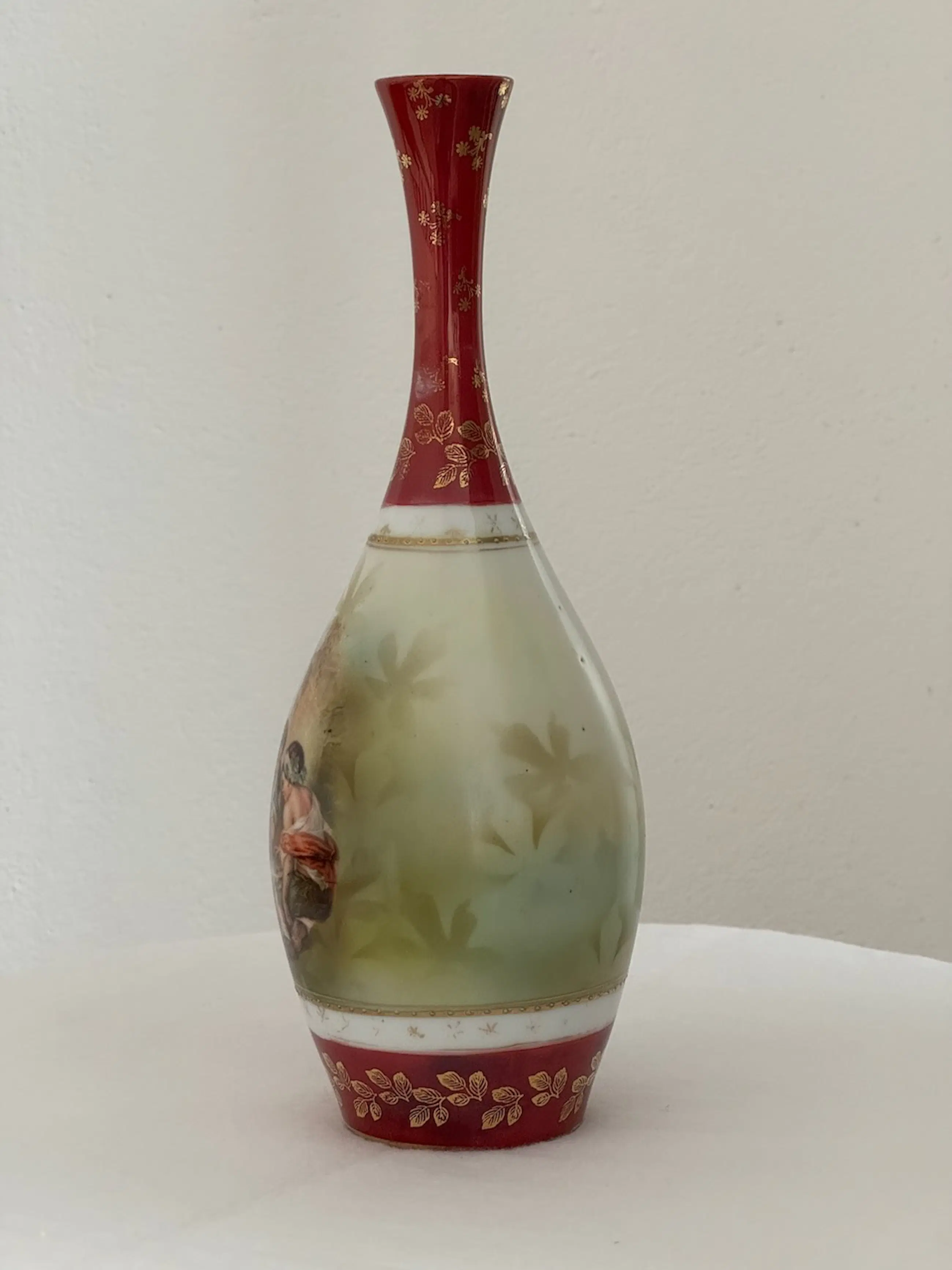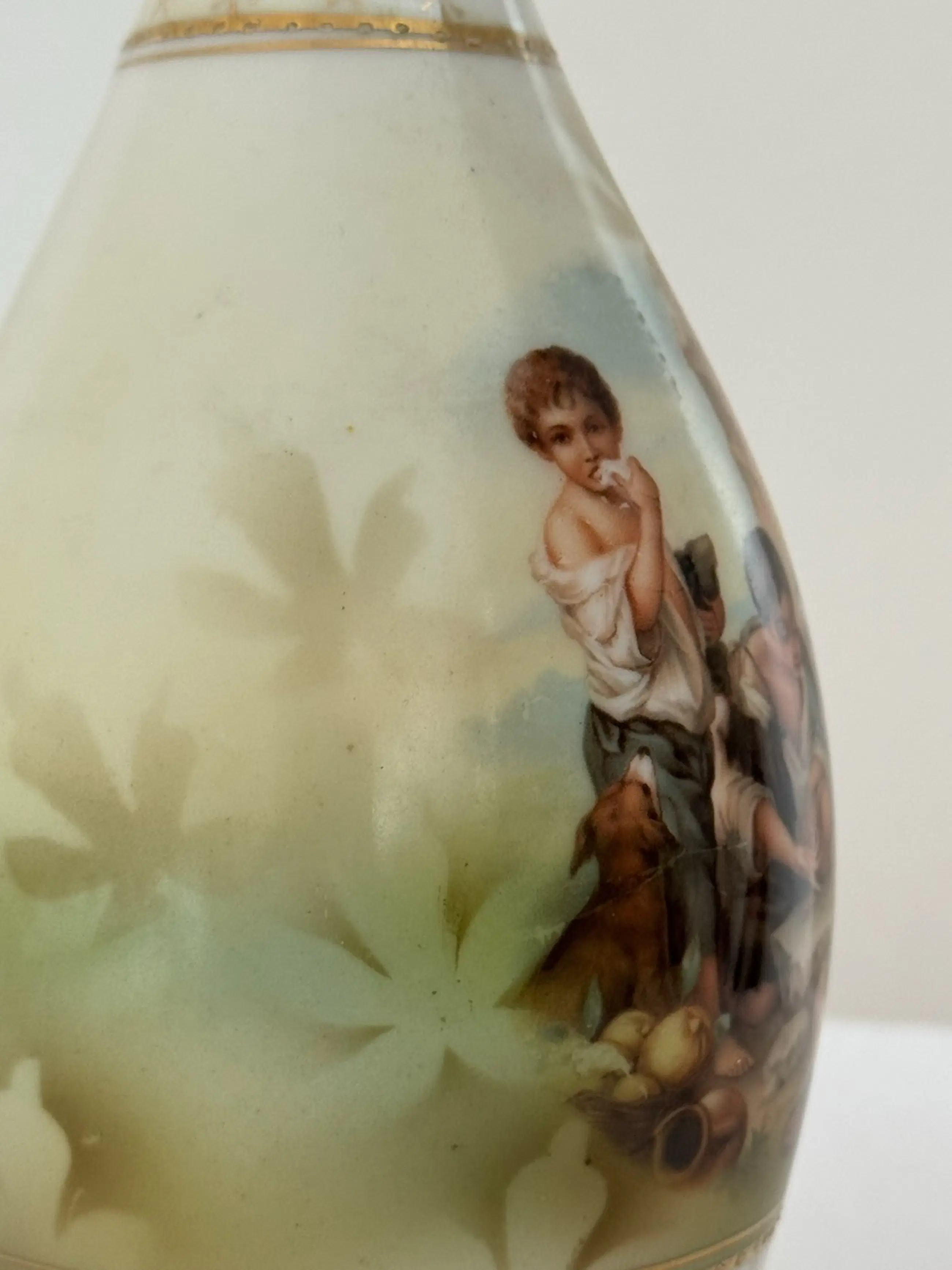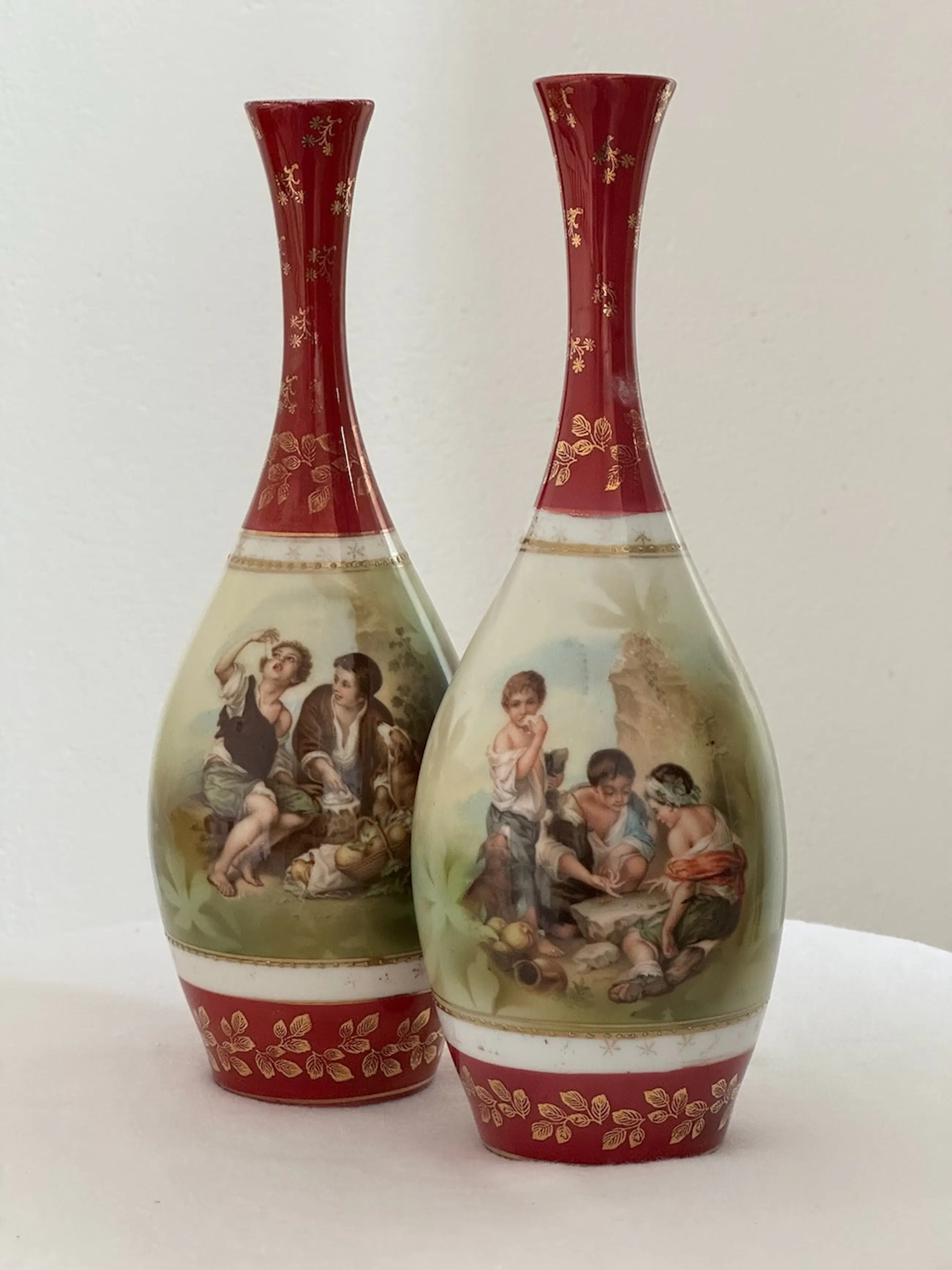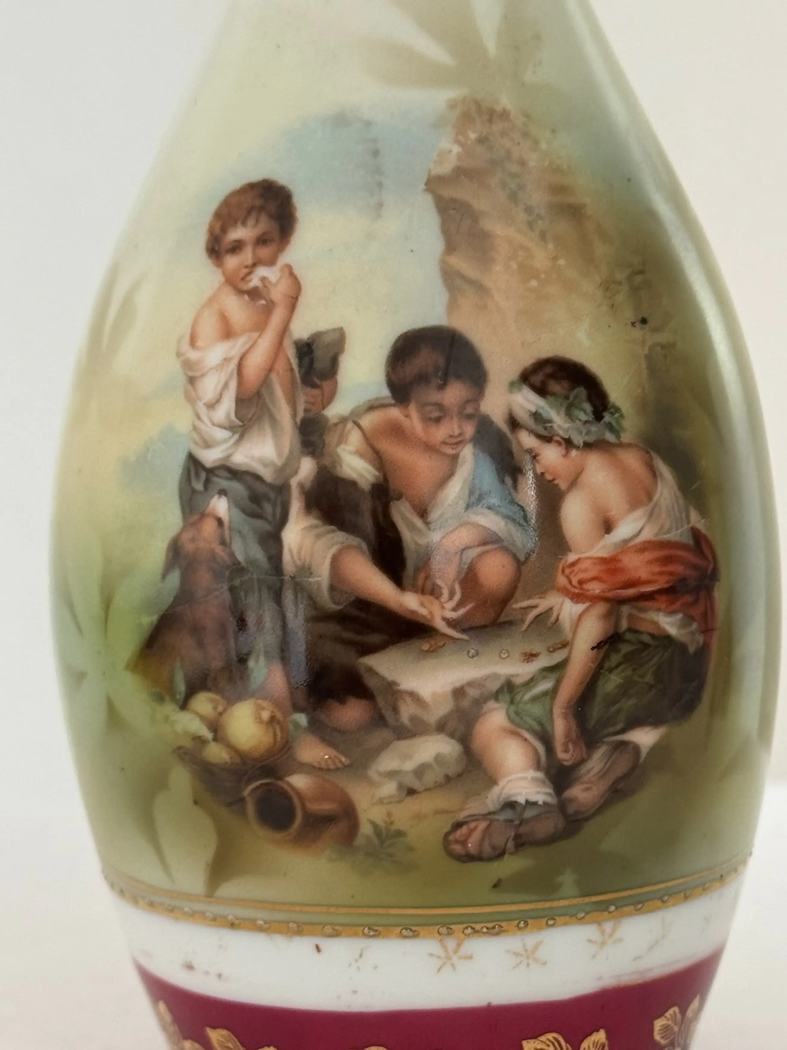 Beroemde porseleinfabriek Reinhold Schlegelmilch uit Suhl. Onderop gemerkt. Delicate vaasjes uit een serie van vier. Deze vaasjes zijn getiteld Melonenesser en Würfelspieler.