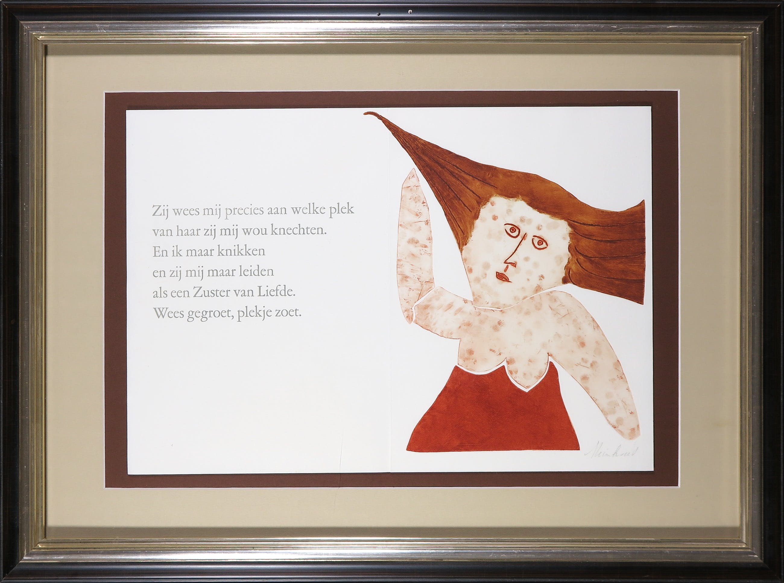 Ingelijste aquatint van Reinhoud D'Haese, afkomstig uit de portfolio IMPROMPTU, een samenwerking van twee beroemde Belgische kunstenaars Reinhoud en Hugo Claus. Hugo Claus schreef de gedichten en Reinhoud maakte de passende aquatint.