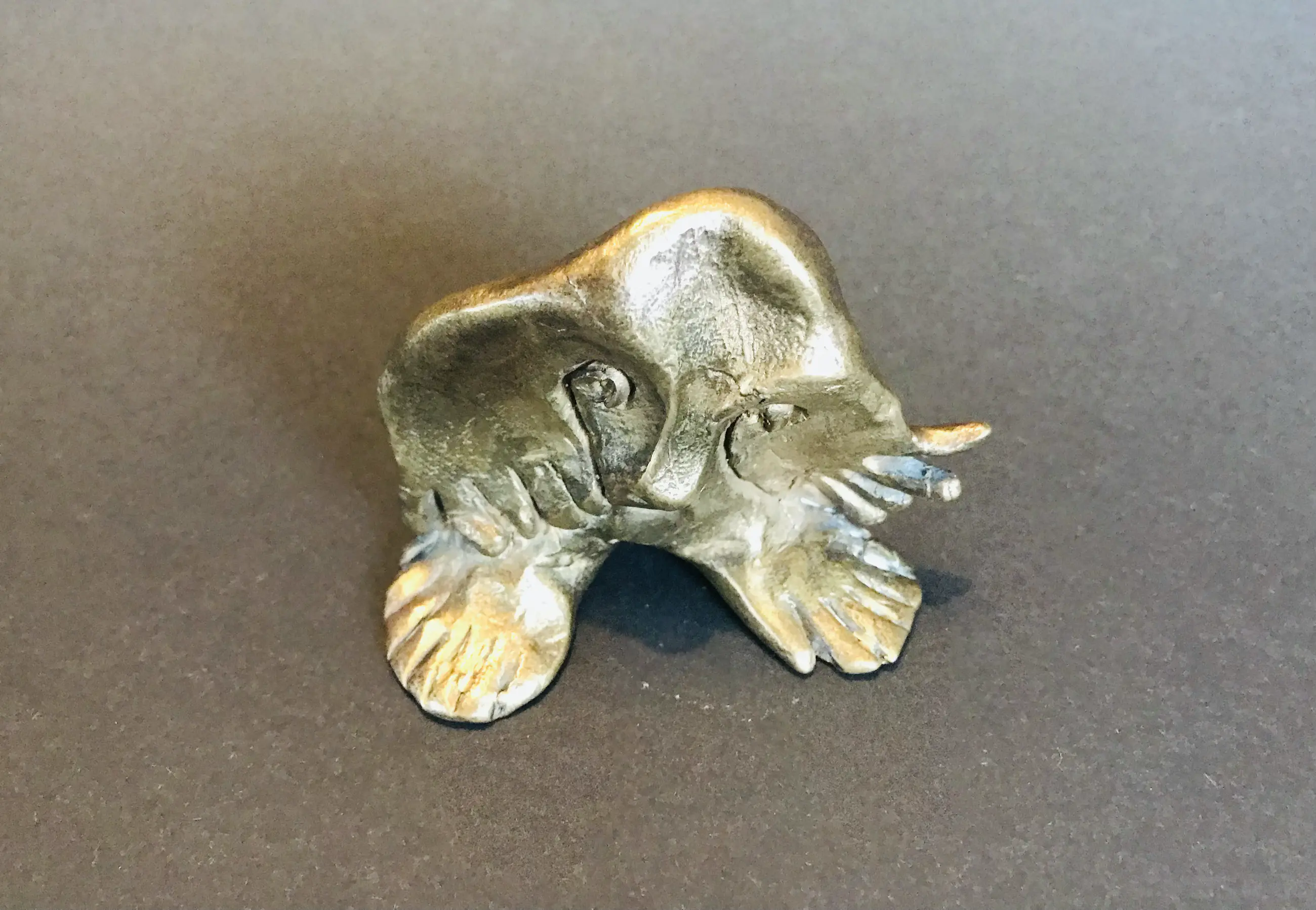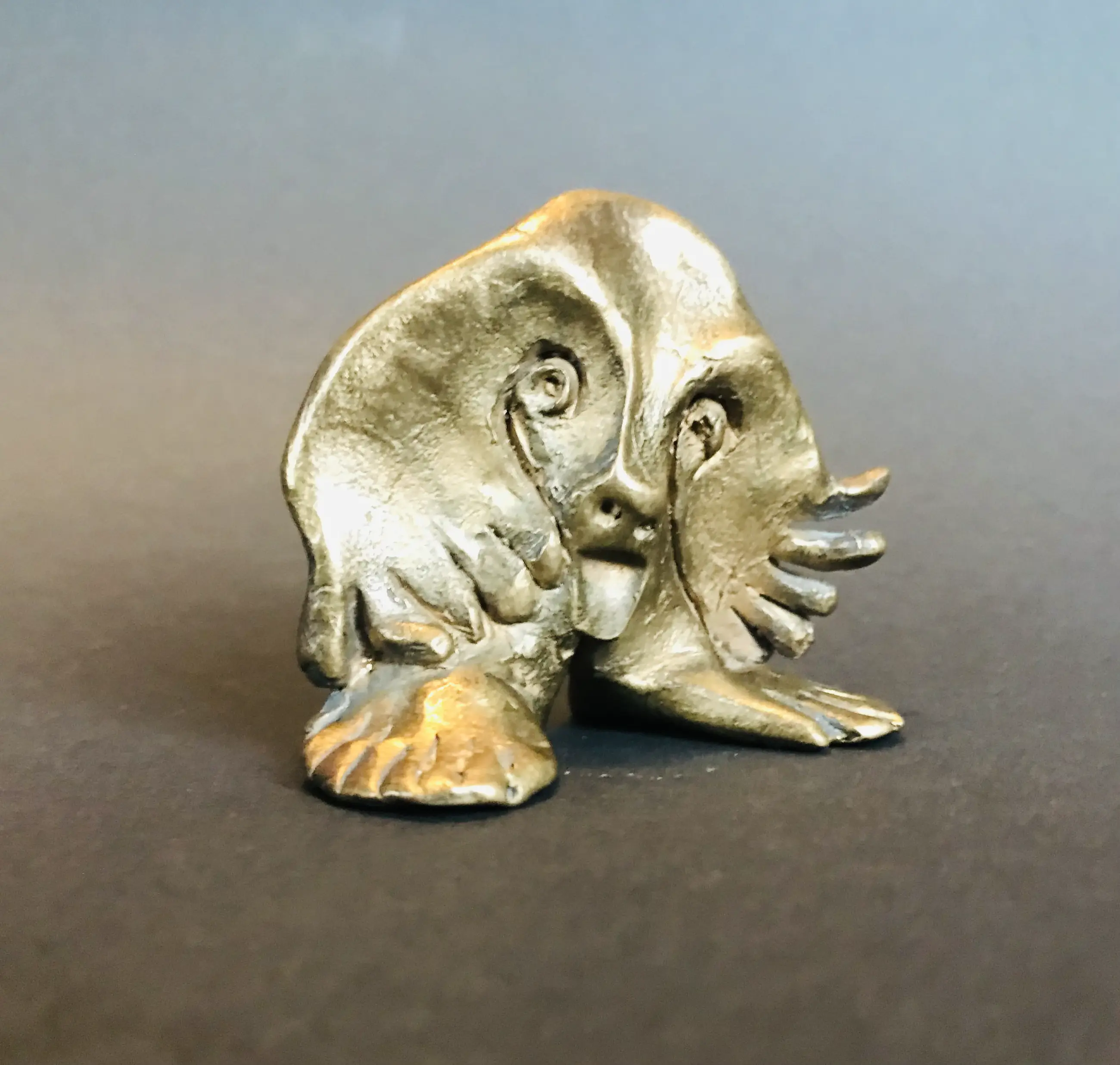 Kenmerkend beeldje van Reinhoud. Hij maakte deze sculpturen in eerste instantie van deegbrood, om er vervolgens een mal van te maken. Zijn vingerafdrukken zijn nog zichtbaar in het brons.