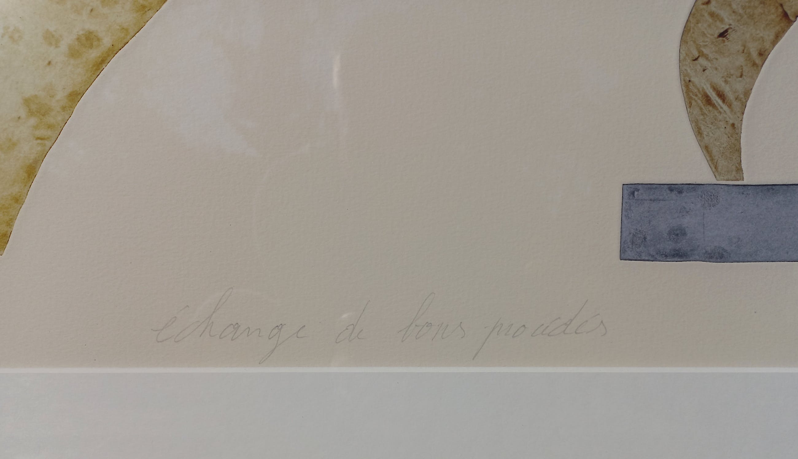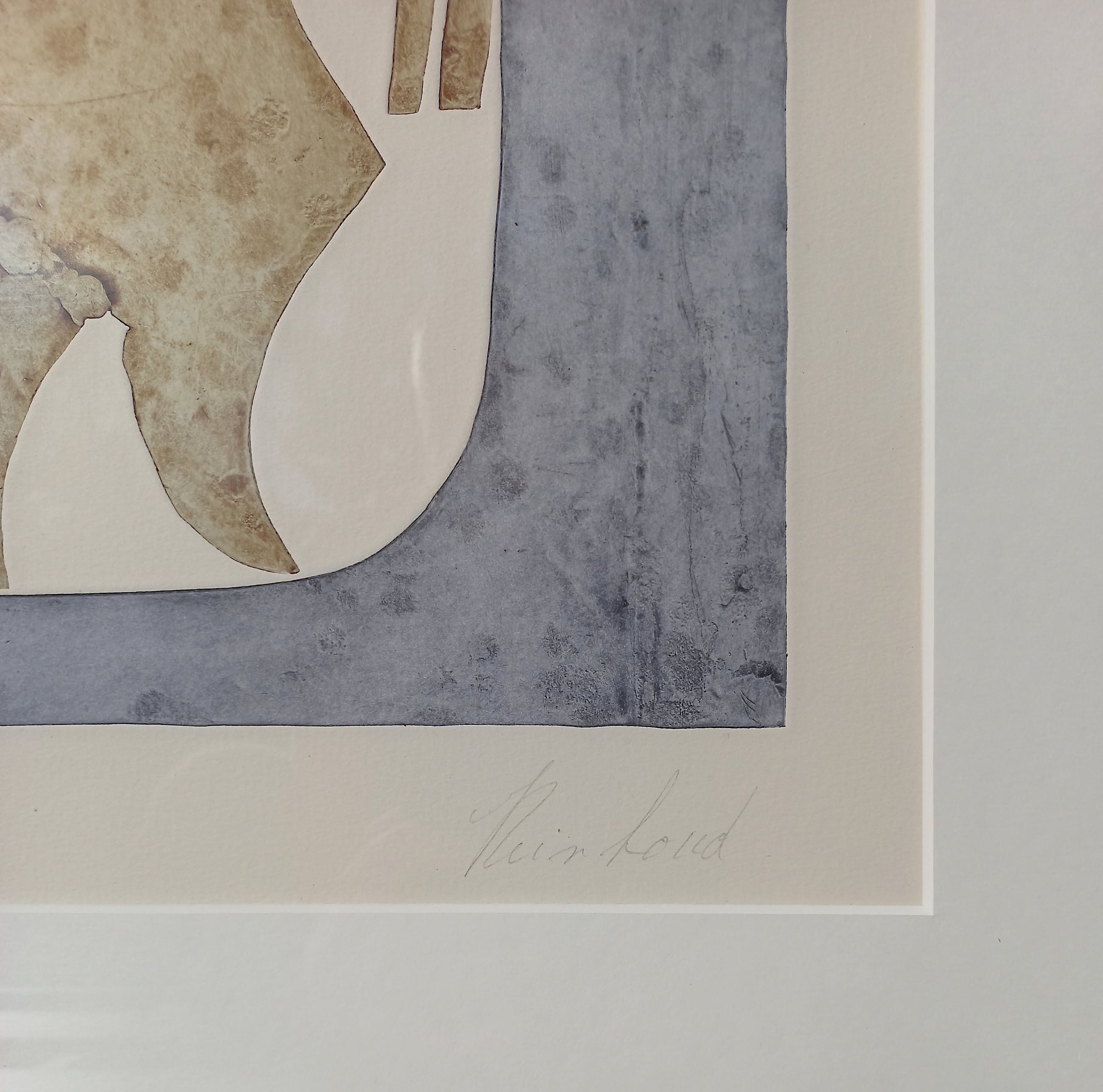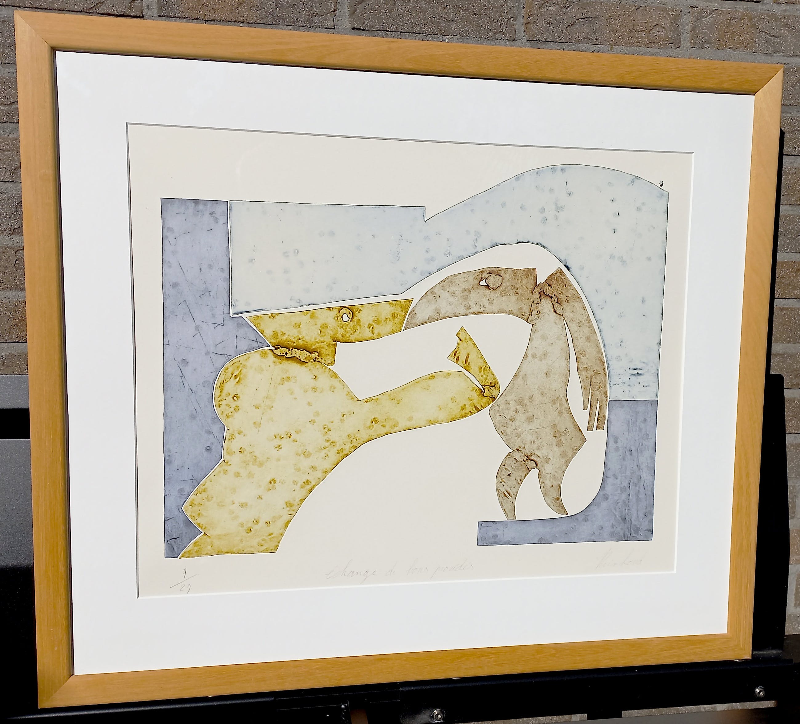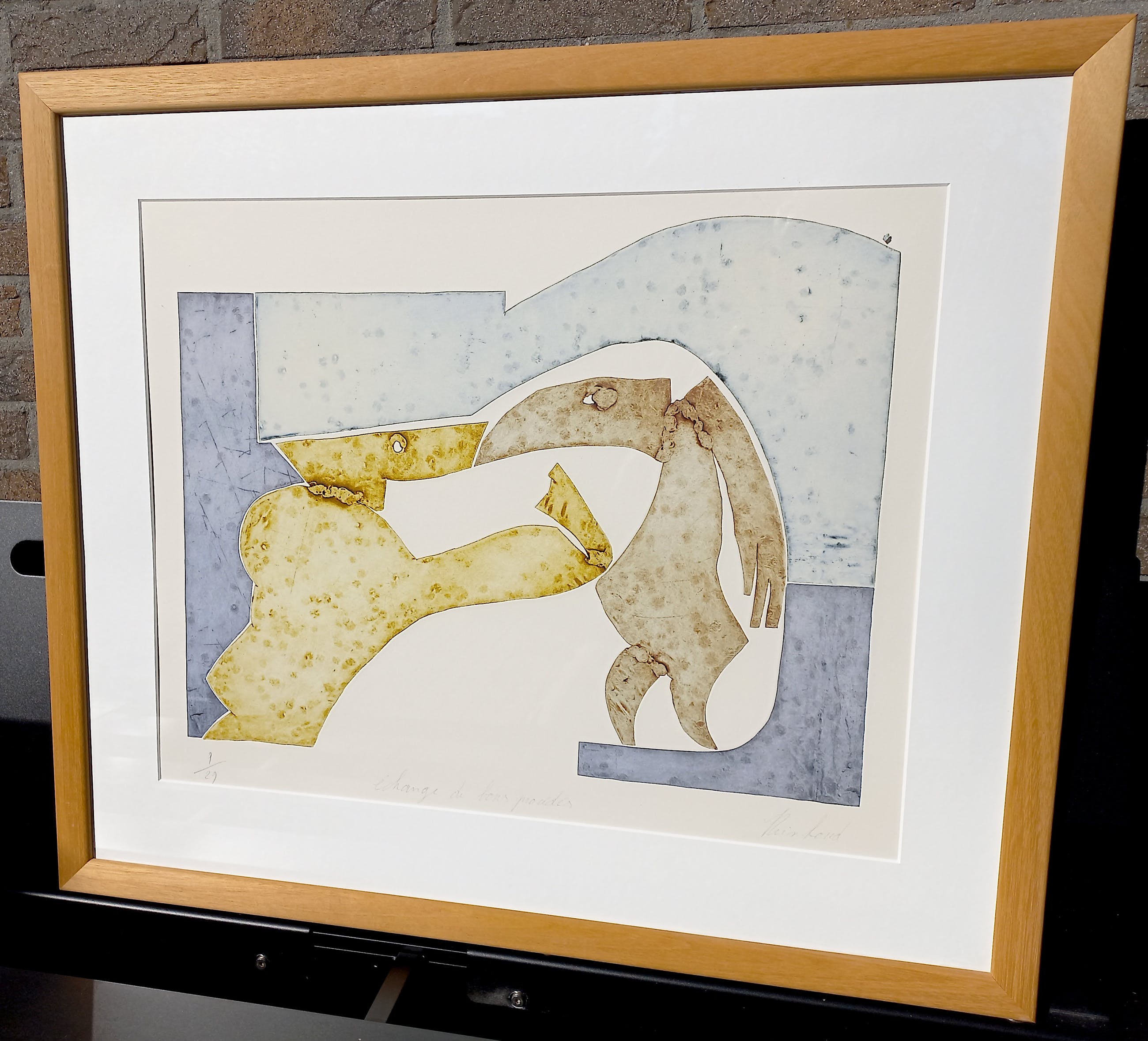Mooi, karakteristiek werk van Reinhoud d’Haese. Metaaldruk op Rives papier, met potlood gesigneerd, getiteld en genummerd (9/29). In strakke, houten lijst, achter glas en met smetteloos, zuurvrij passe-partout. Alles in zeer goede conditie.