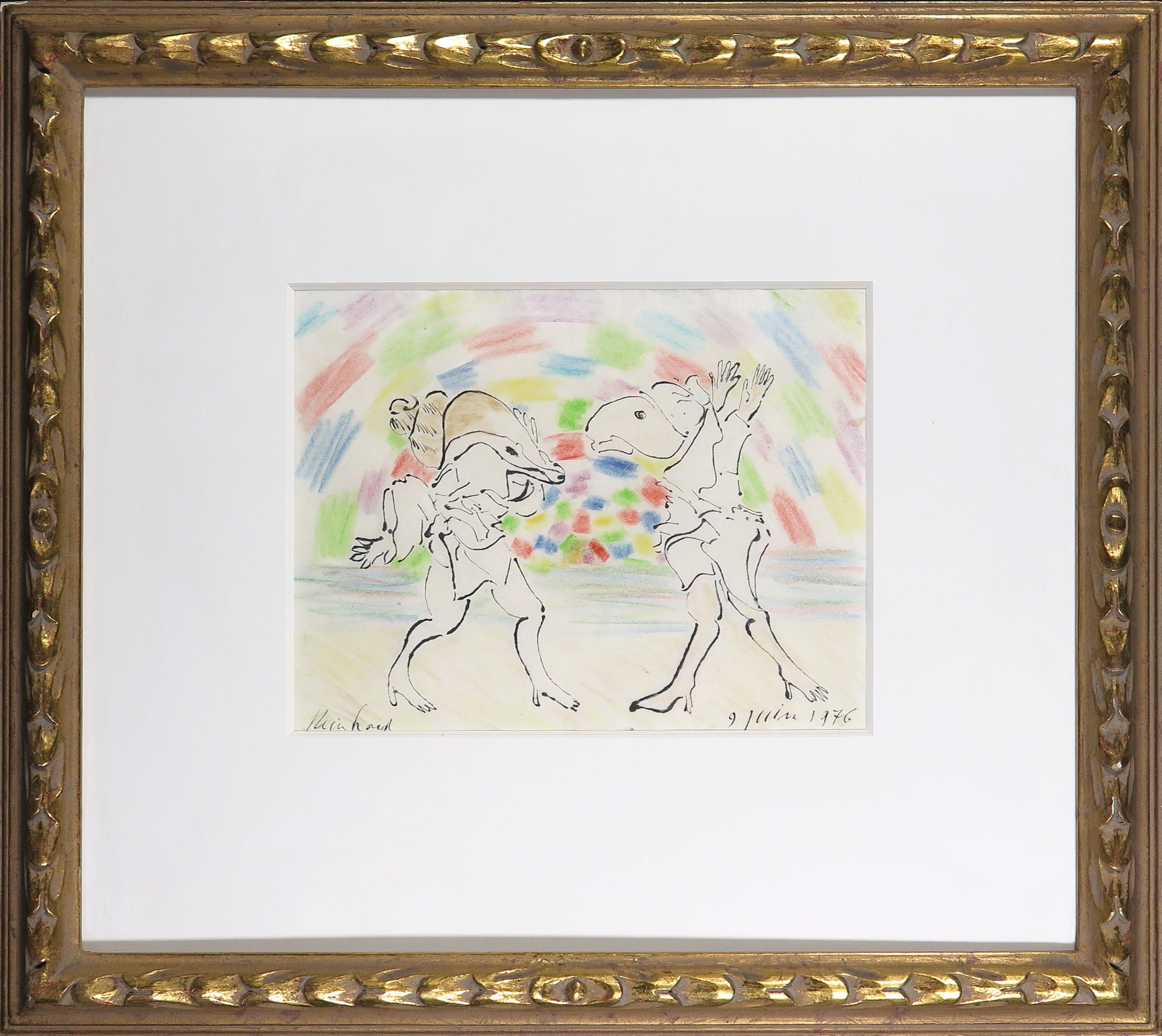 Kleurige tekening in inkt en kleurpotlood op papier. Linksonder met de hand gesigneerd, rechtsonder gedateerd (9 juni 1976). Kwalitatief hoogwaardig ingelijst (met een paar kleine beschadigingen aan de hoekjes).