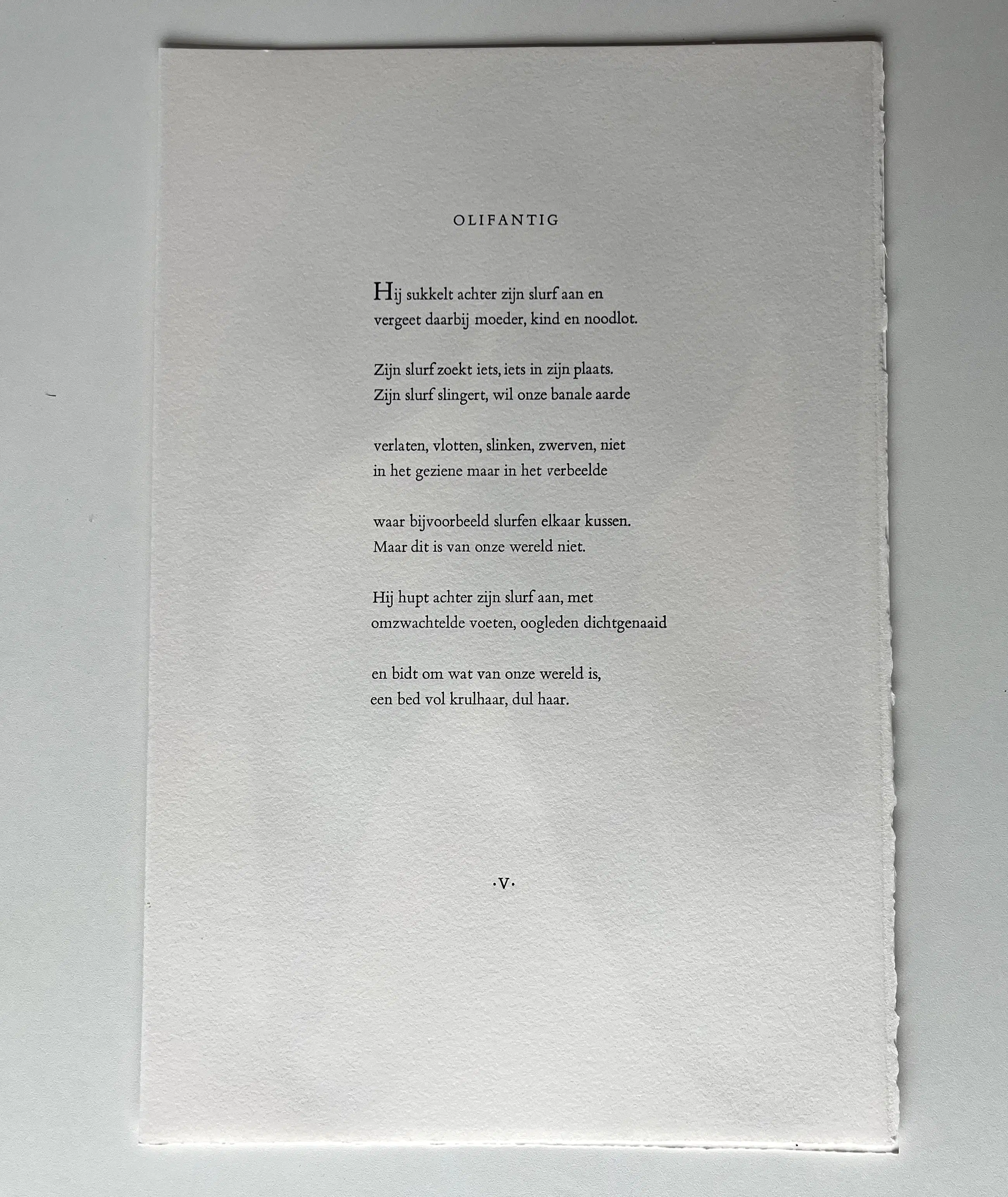 Uit vers: "Zijn slurf zoekt iets, iets in zijn plaats."
