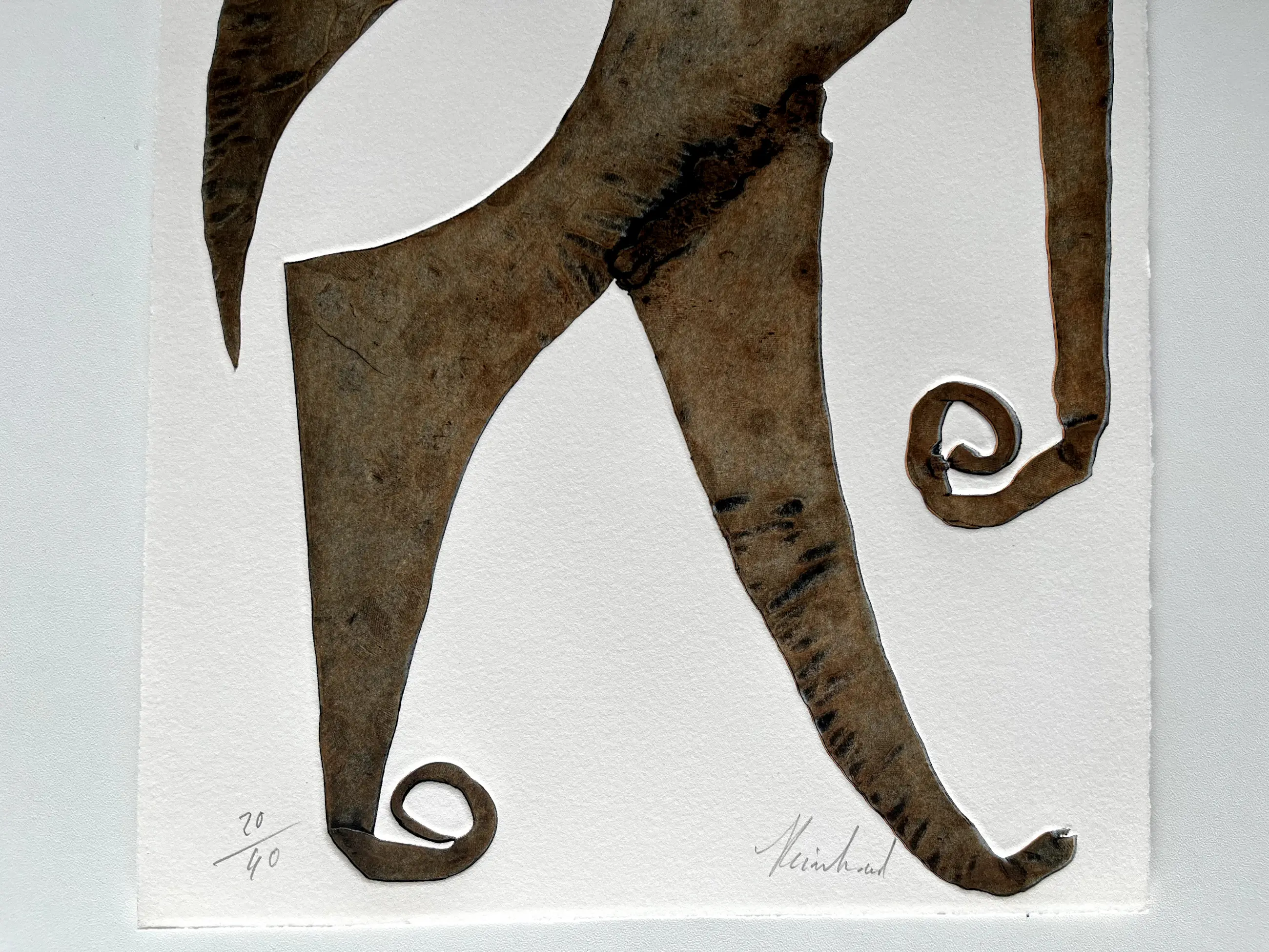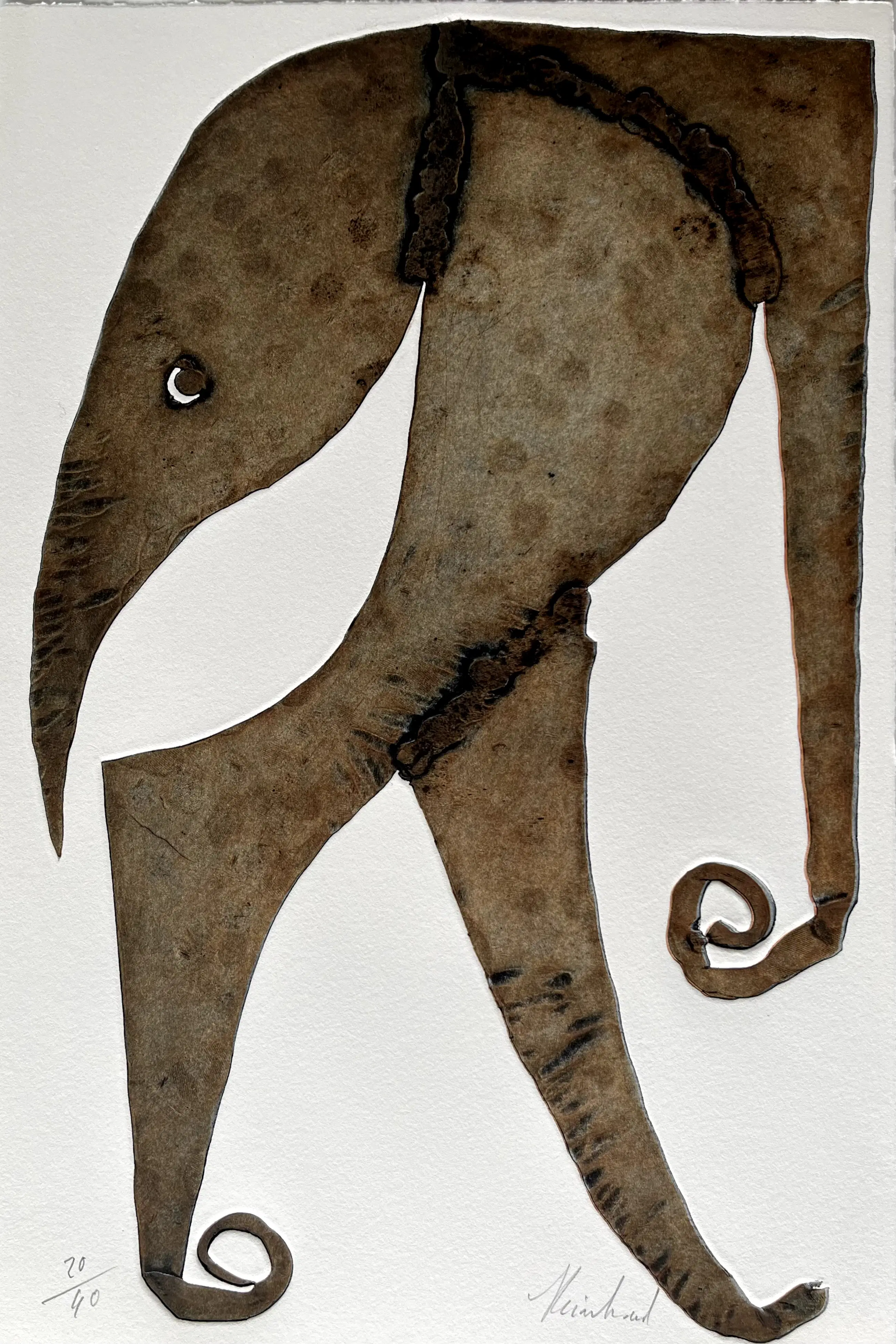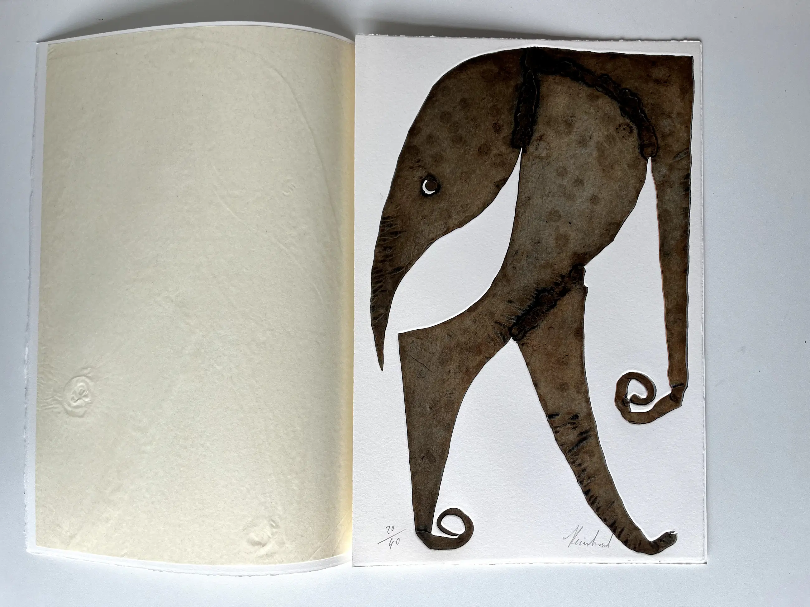 Kenmerkende ets van Reinhoud d'Haese met een bijpassend vers van Hugo Claus getiteld "Olifantig". Mooi reliëf in ets (zie detailfoto).