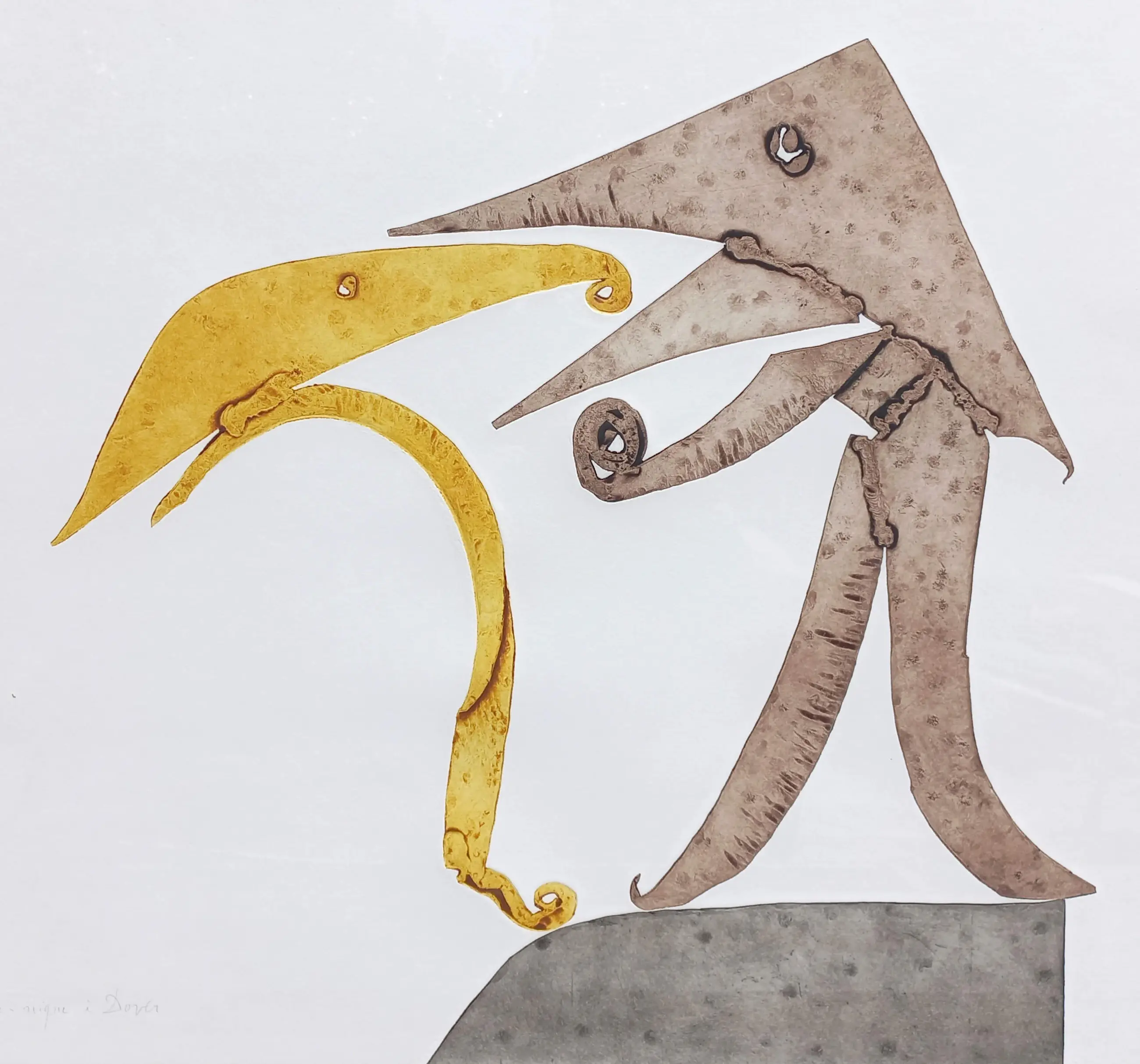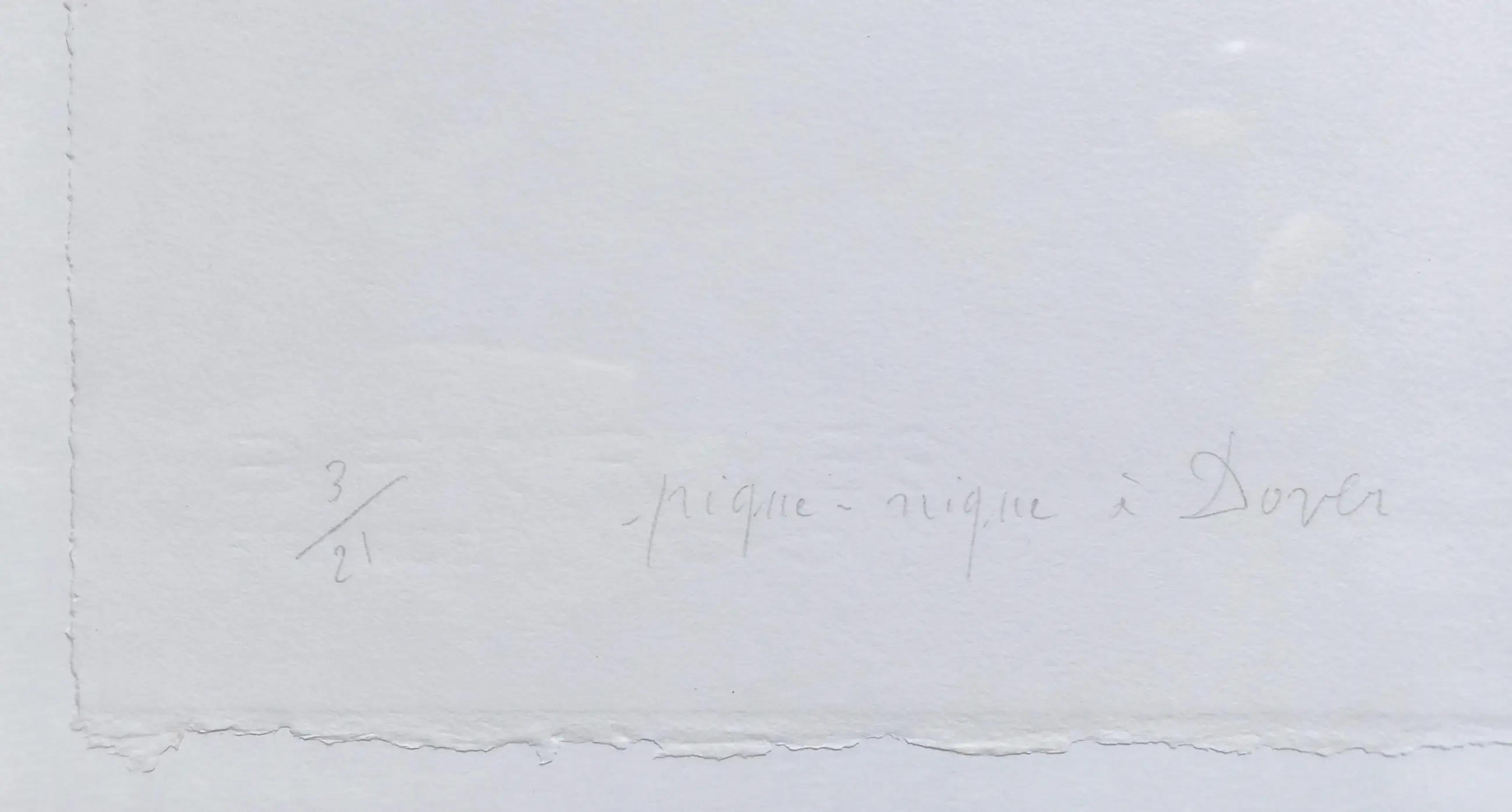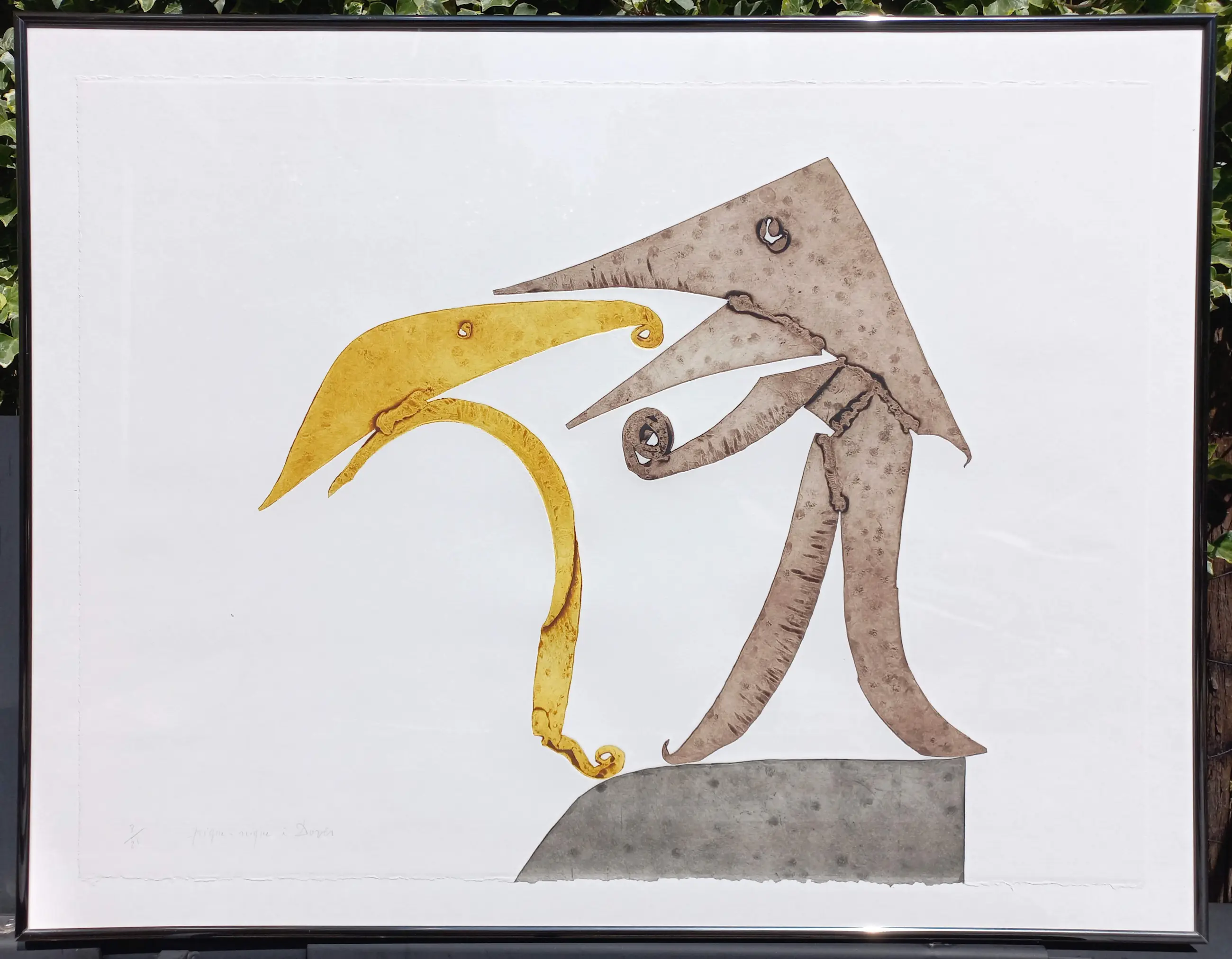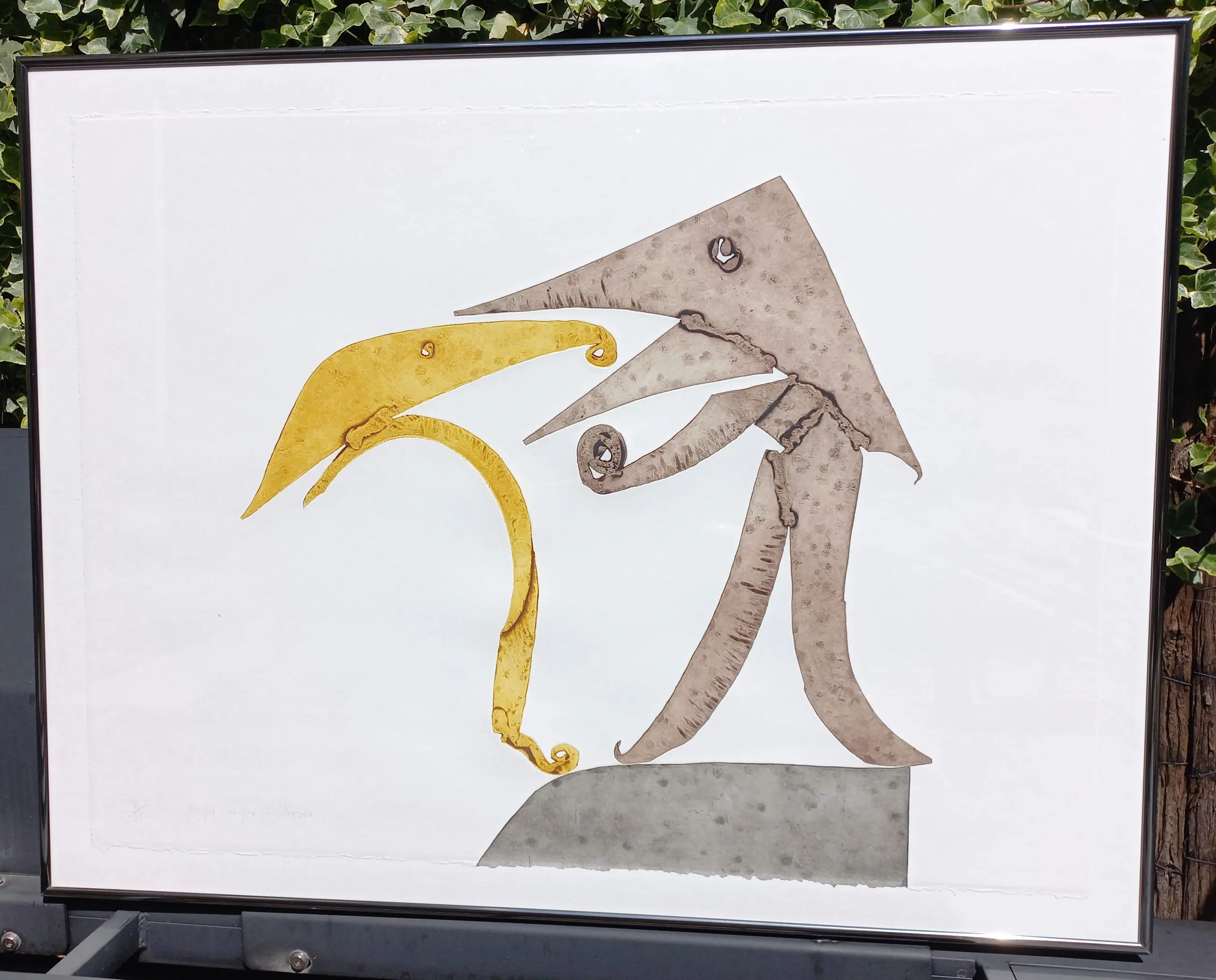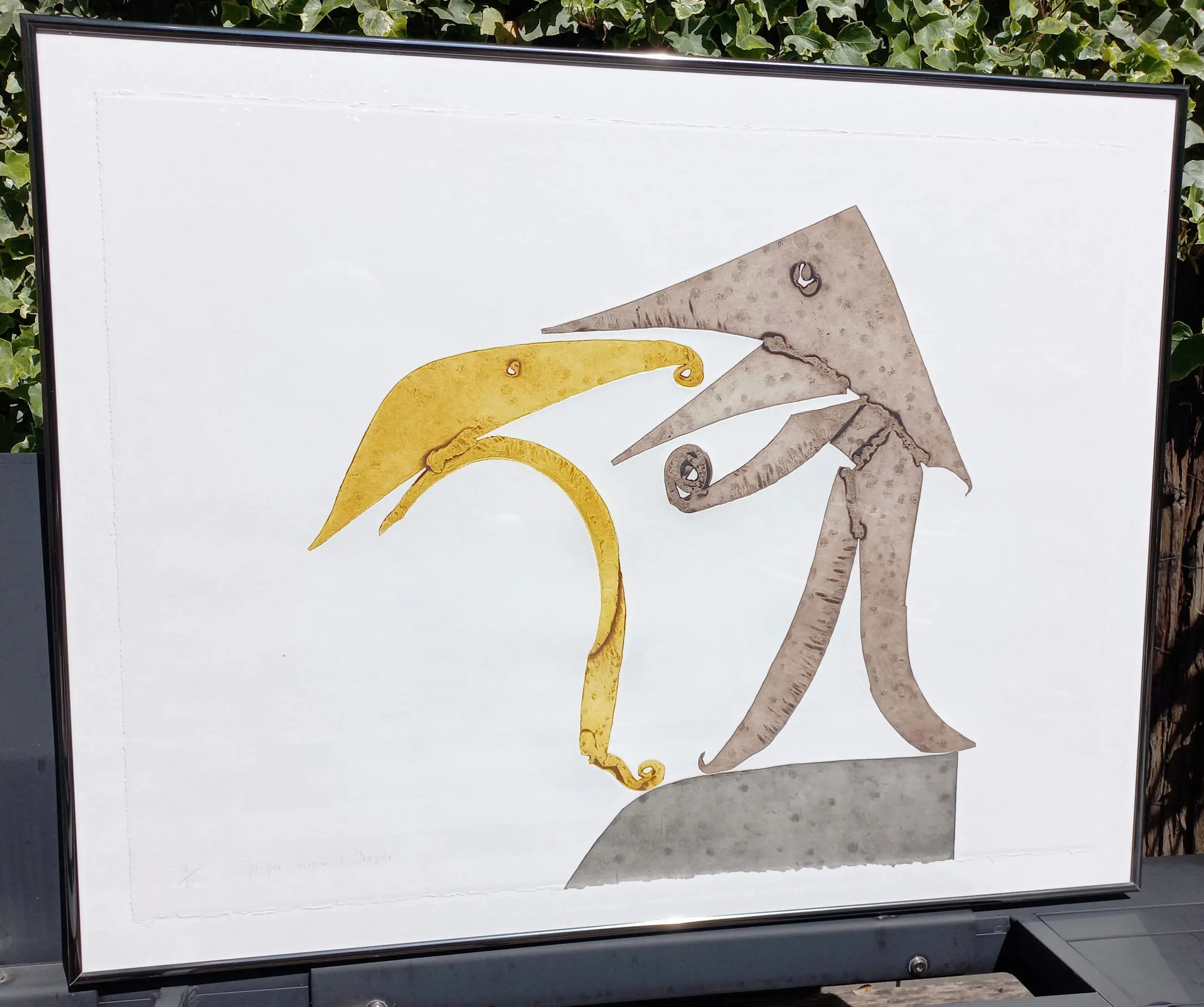 Groot, karakteristiek werk van Reinhoud d’Haese. Metaaldruk op papier (Rives), met potlood getiteld en genummerd (3/21). In strakke aluminium lijst en achter glas. Alles in uitstekende conditie.