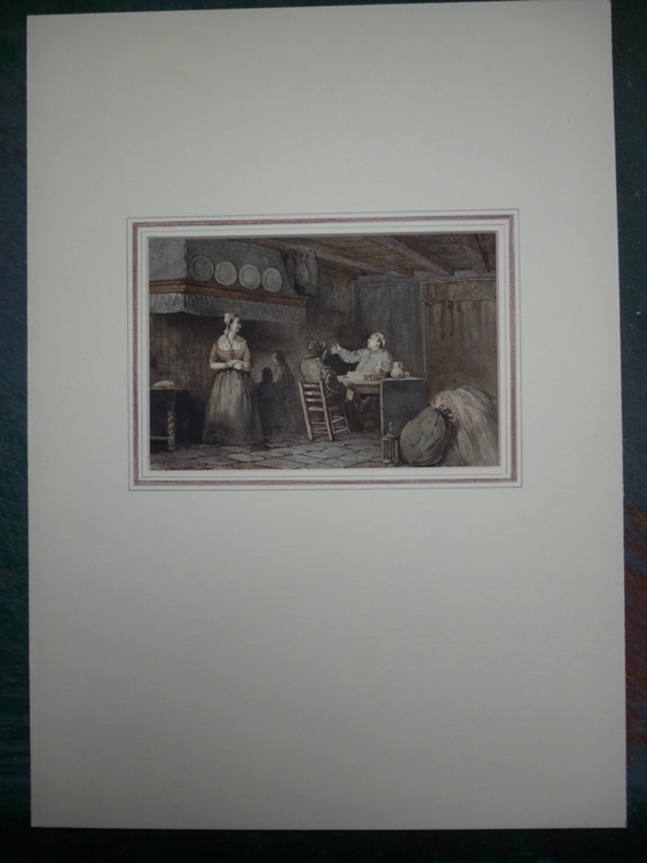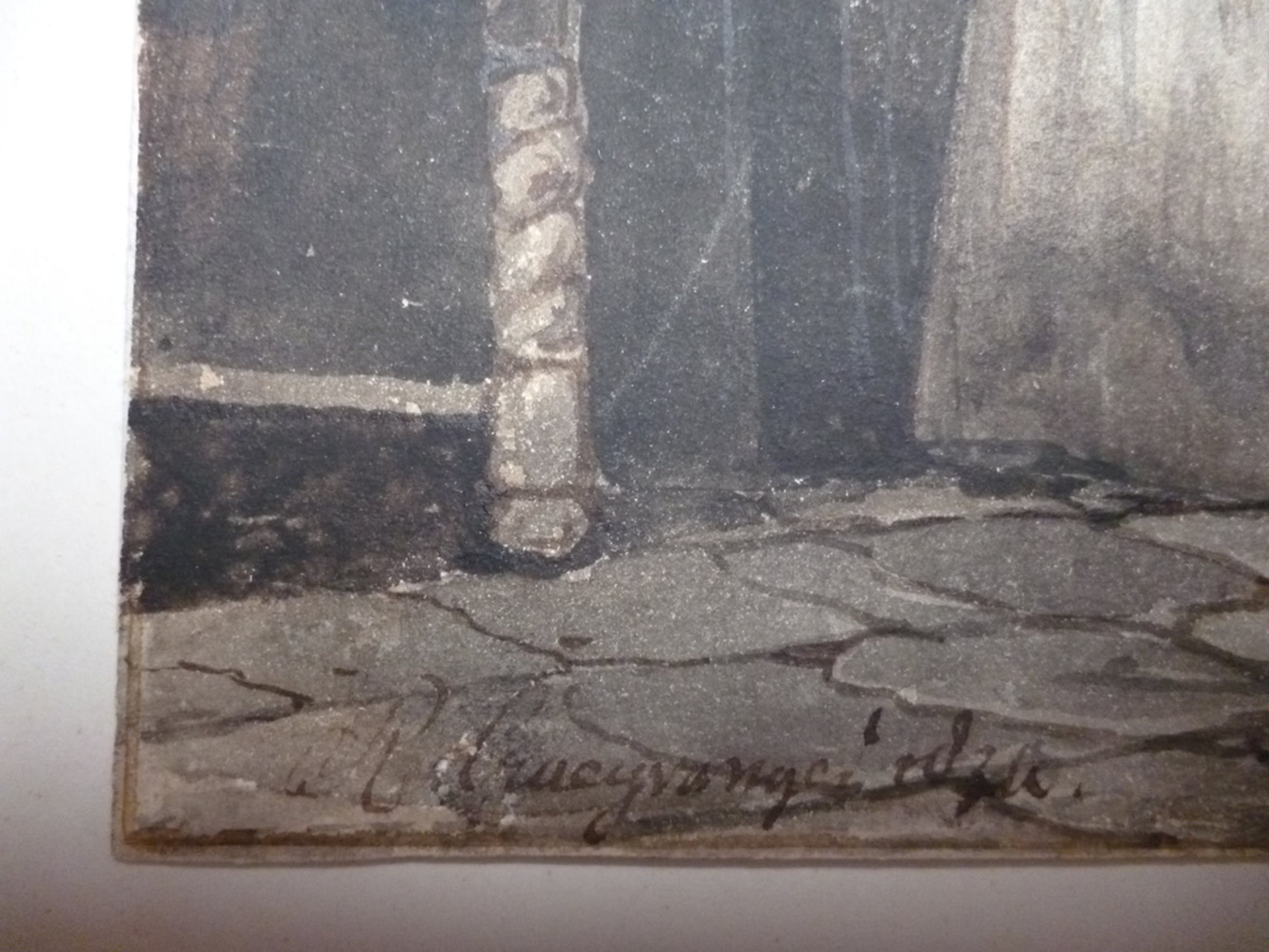 Sepia tekening met bruin en grijs. Gesigneerd en gedateerd 1834 linksonder.Onder passepartout.