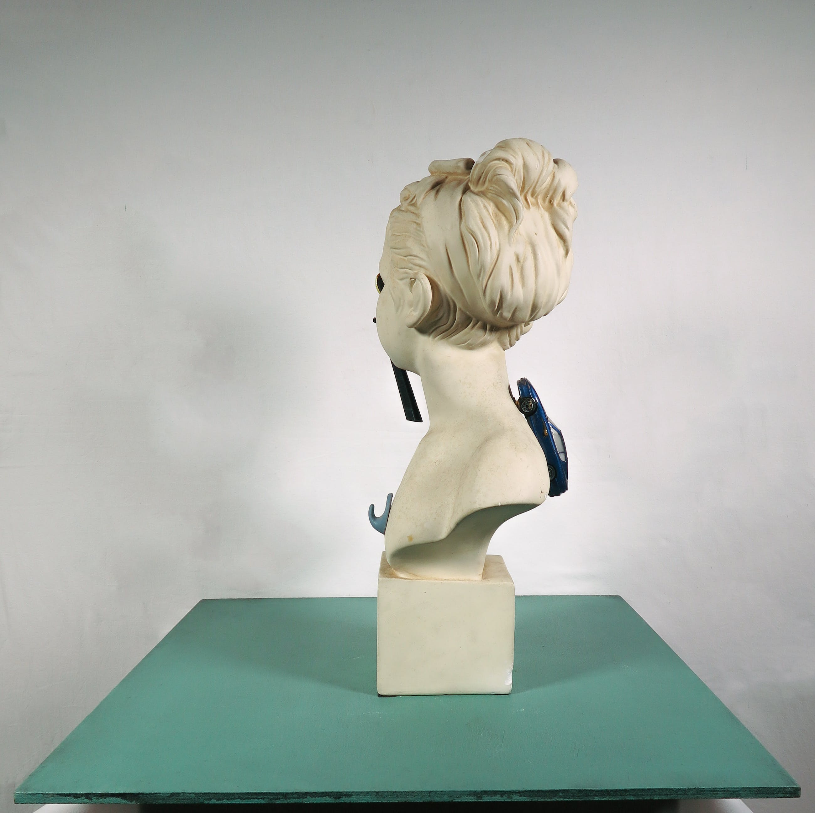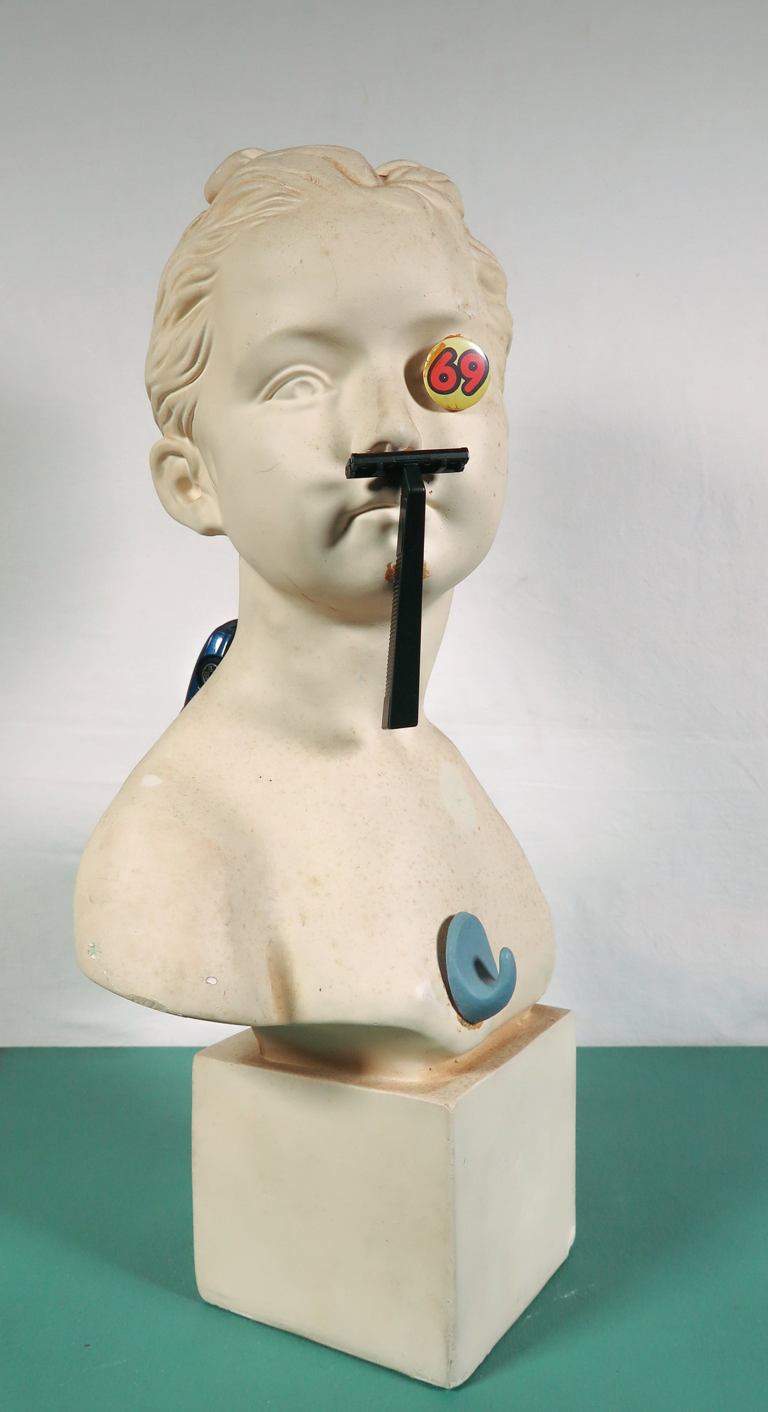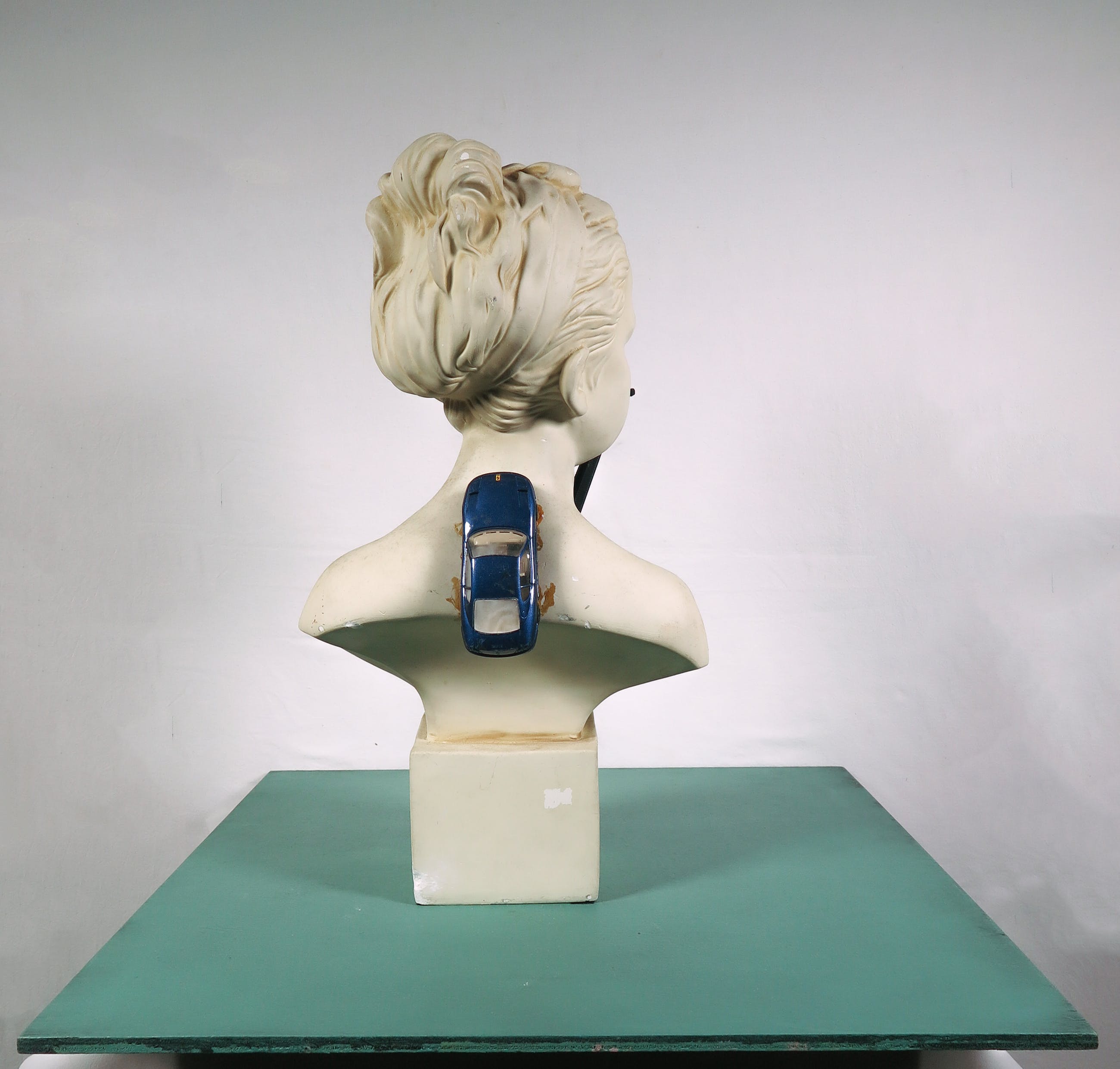 Bijzonder samengesteld beeld van Reinier Lucassen. Het werk bestaat uit een klassiek vormgegeven gipsen buste van een jonge vrouw, met applicaties van o.a. een speelgoedauto en scheermes. Het beeld staat los op een groene houten plaat.