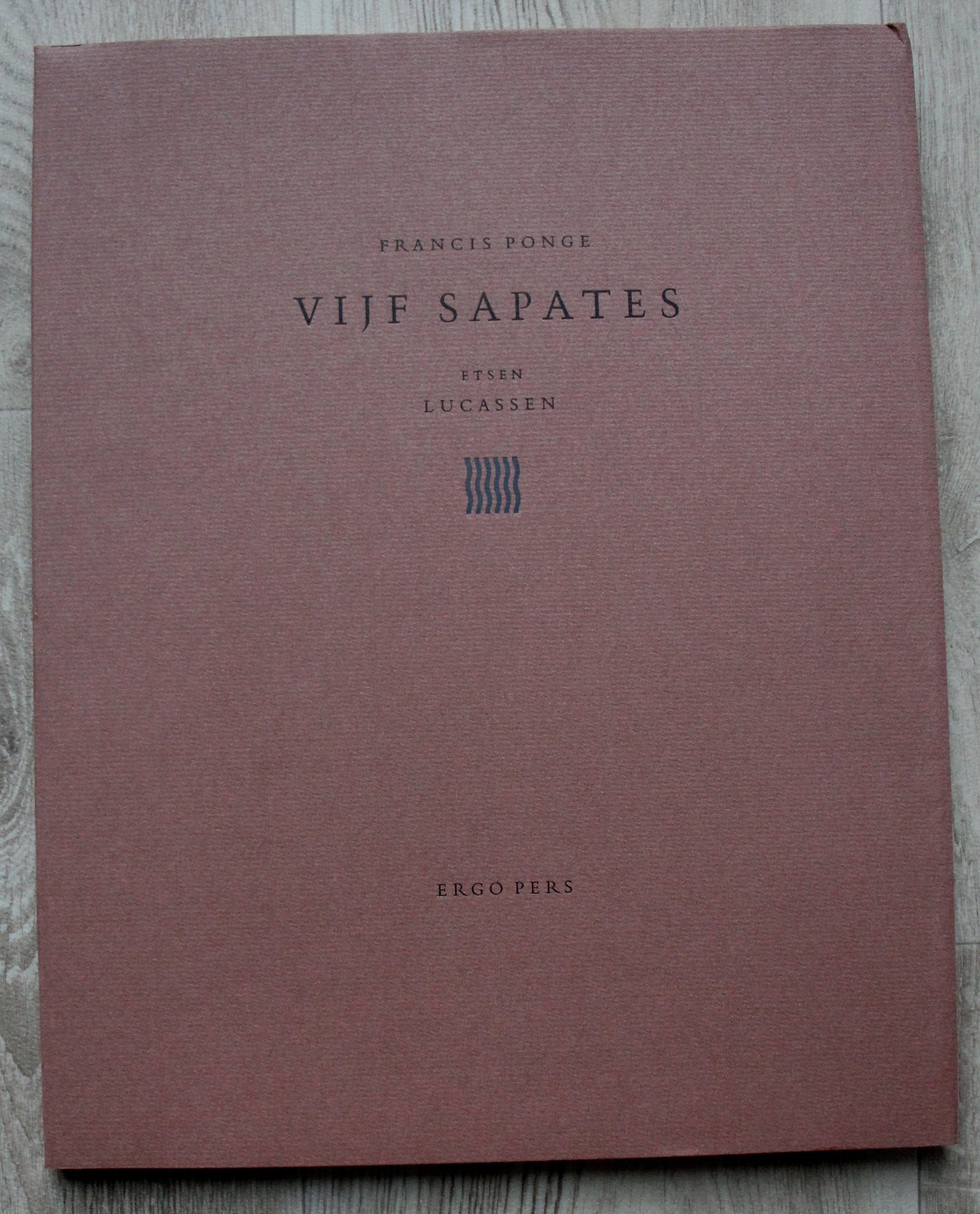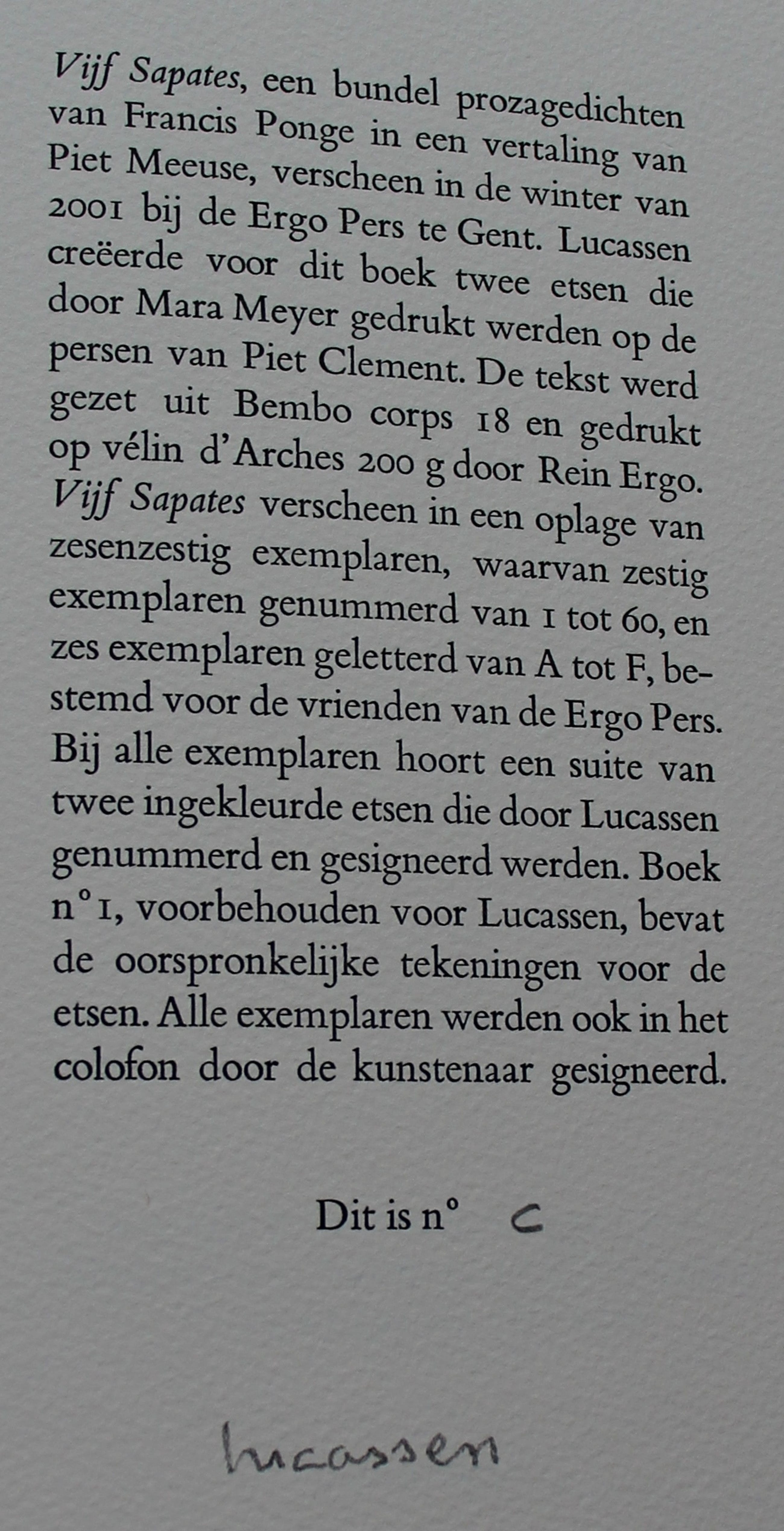 Vijf Sapates is een bundel met prozagedichten van Francis Ponge, met 4 etsen van Reinier Lucassen. Jaar: 2001. Nummer: C. Afmetingen map/werk: H35.5 x b27 cm. Afmetingen voorstellingen: H18.5 x b12.5cm. Vijf Sapates verscheen in een oplage van zesenzestig exemplaren, waarvan zestig exemplaren genummerd van 1 t/m 60 en 6 genummerd van van A tot F, De laatste waren bestemd voor vrienden van de Ergo Pers. Bij alle exemplaren hoort een suite van twee ingekleurde etsen die door Lucassen genummerd en gesigneerd werden en 2 etsen die niet genummerd of gesigneerd zijn. Het boek met gedichten en etsen is ook gesigneerd door Reinier Lucassen. Het boek zit in een hardboard cover. De authenticiteit van dit werk wordt volledig gegarandeerd. Een certificaat van echtheid kan, op aanvraag, worden gemaild.