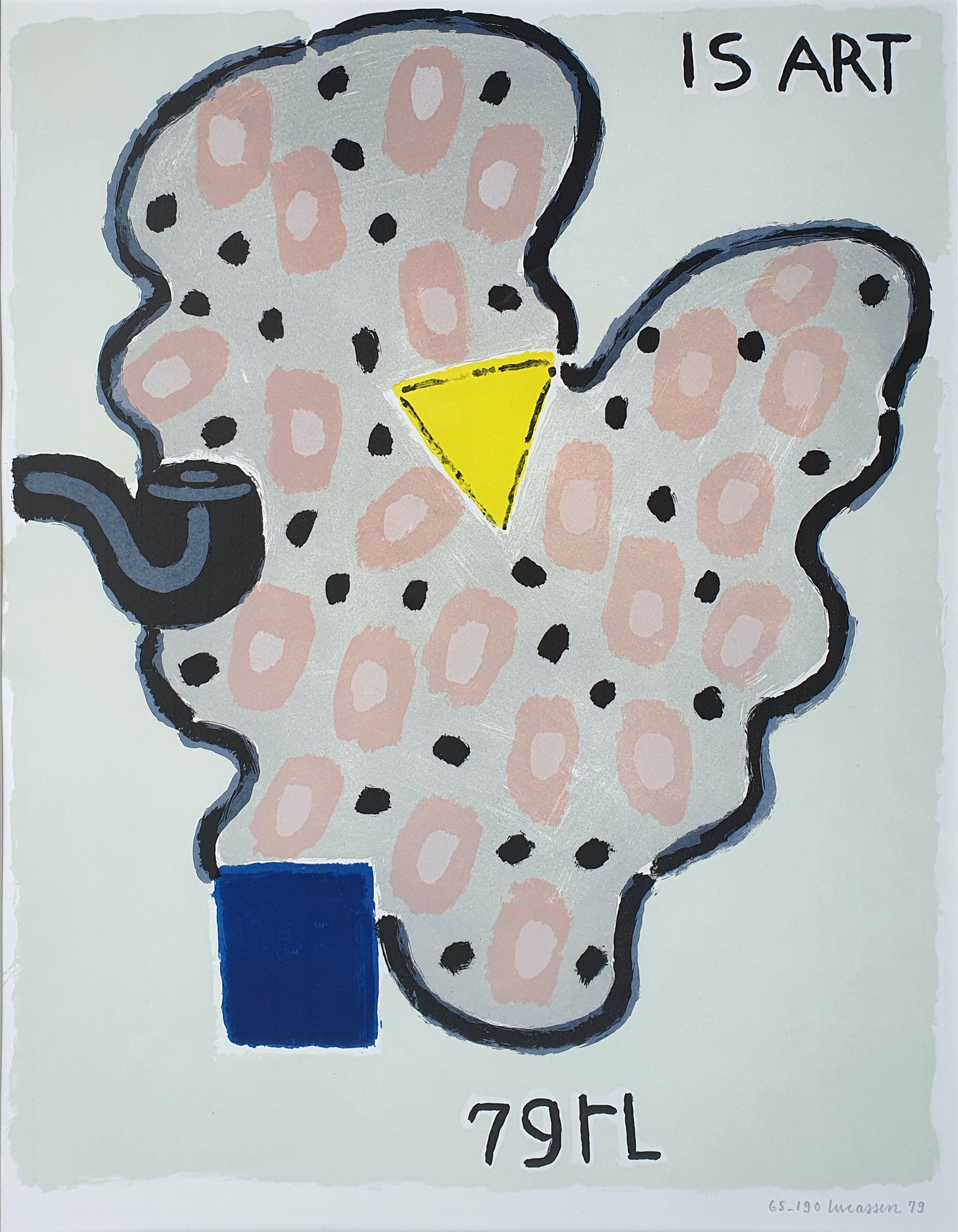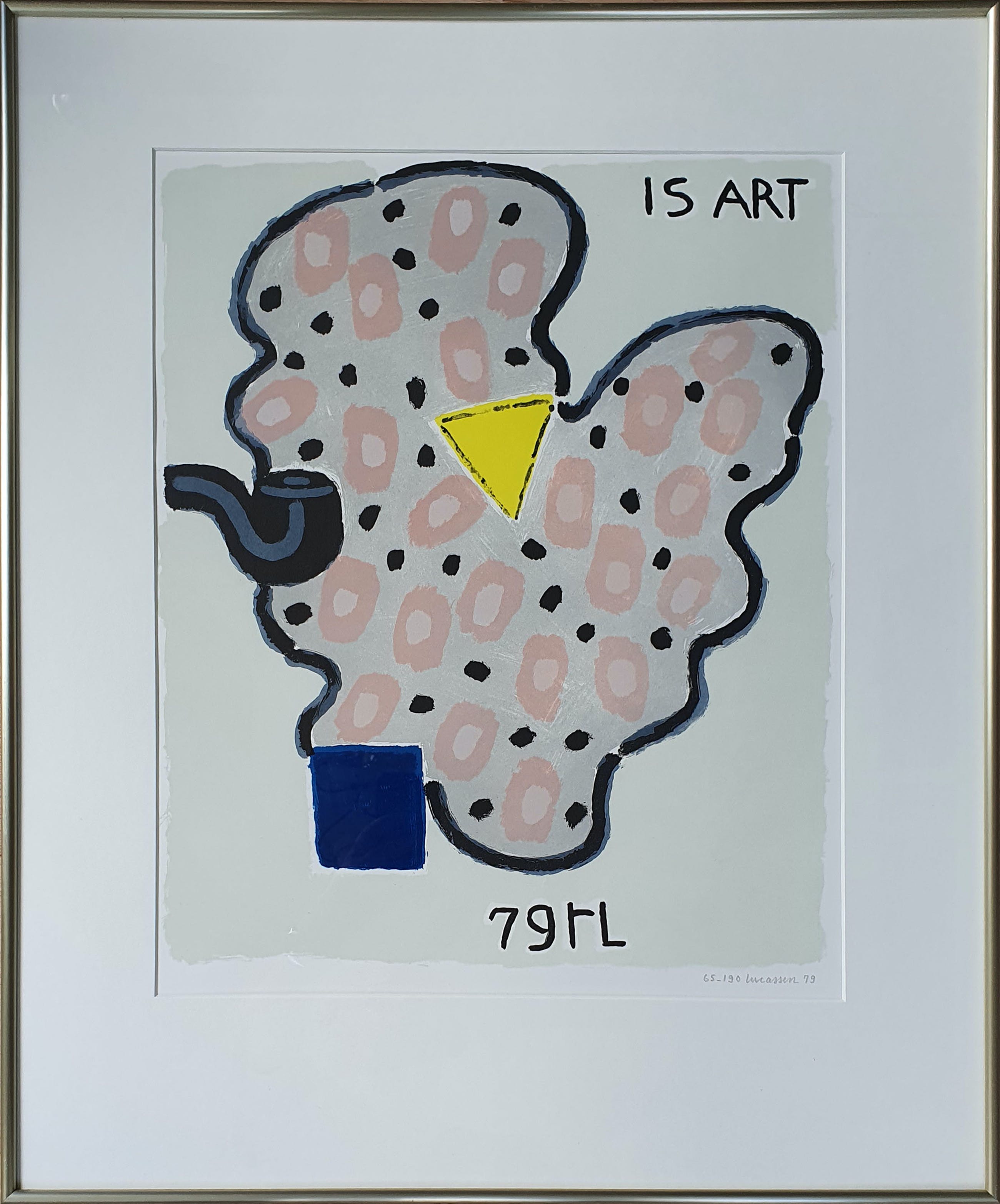 Litho van Reinier Lucassen met de titel: 'Is art' uit 1979. Het werk is rechtsonder met de hand gesigneerd door de kunstenaar. Het werk is ingelijst in een nette champagne kleurige aluminium lijst.