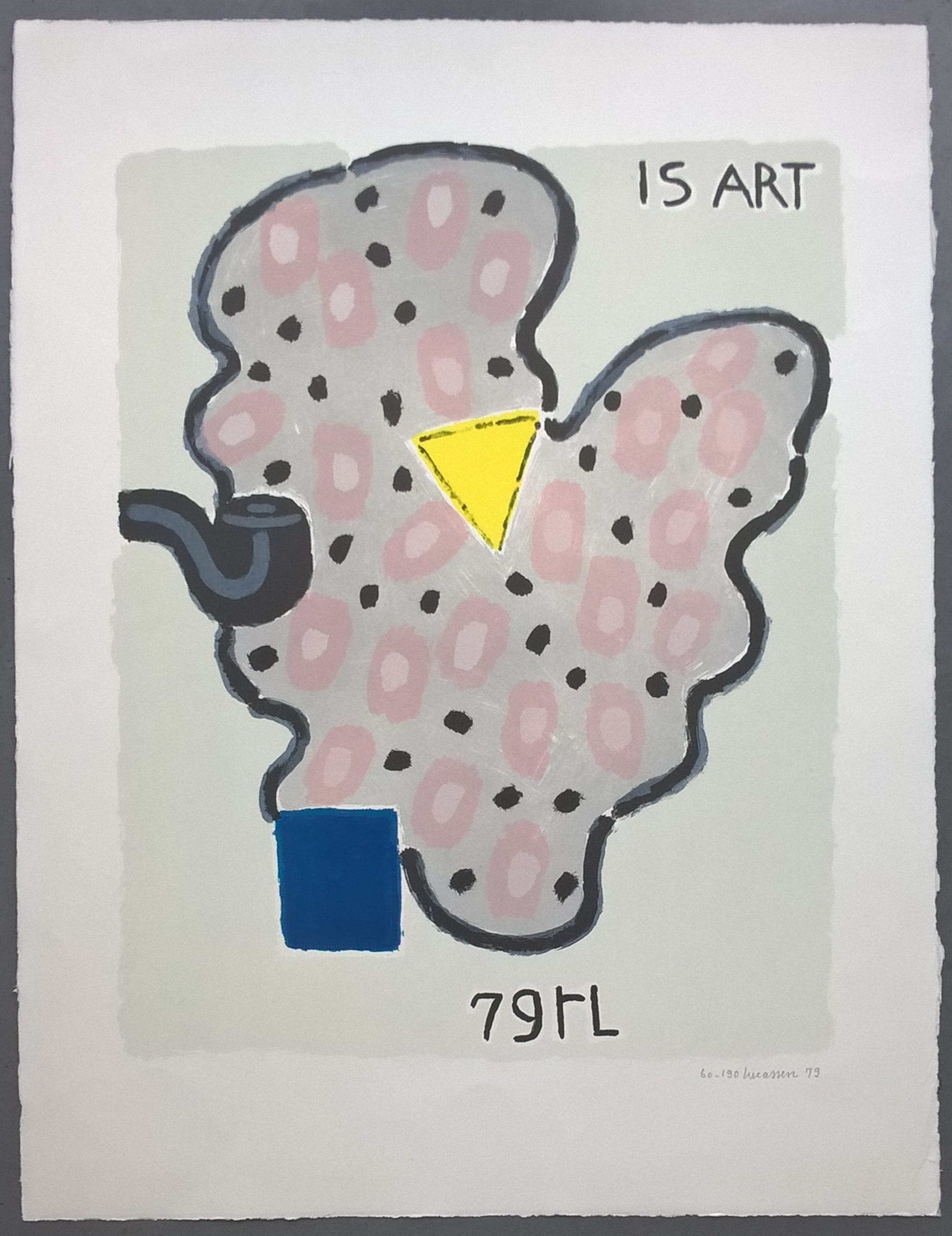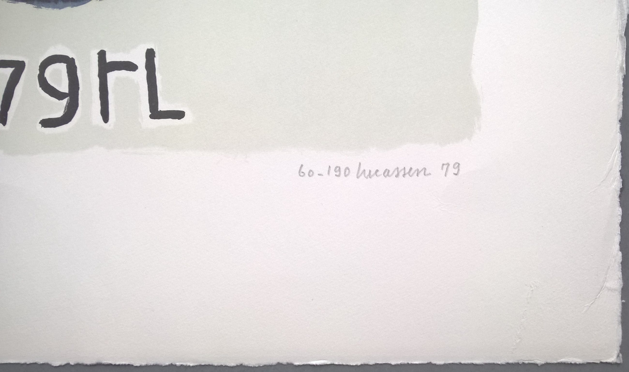 Gesigneerde zeefdruk van de Reinier Lucassen (1939-) Gedrukt in een oplage van 190 stuks. Rechtsonder is het werk gesigneerd in potlood en 79 en 60/190. Papiermaat 66 x 50.5 cm. (hxb) Rechts, onder de handtekening is het papier licht beschadigd. Verder goed.