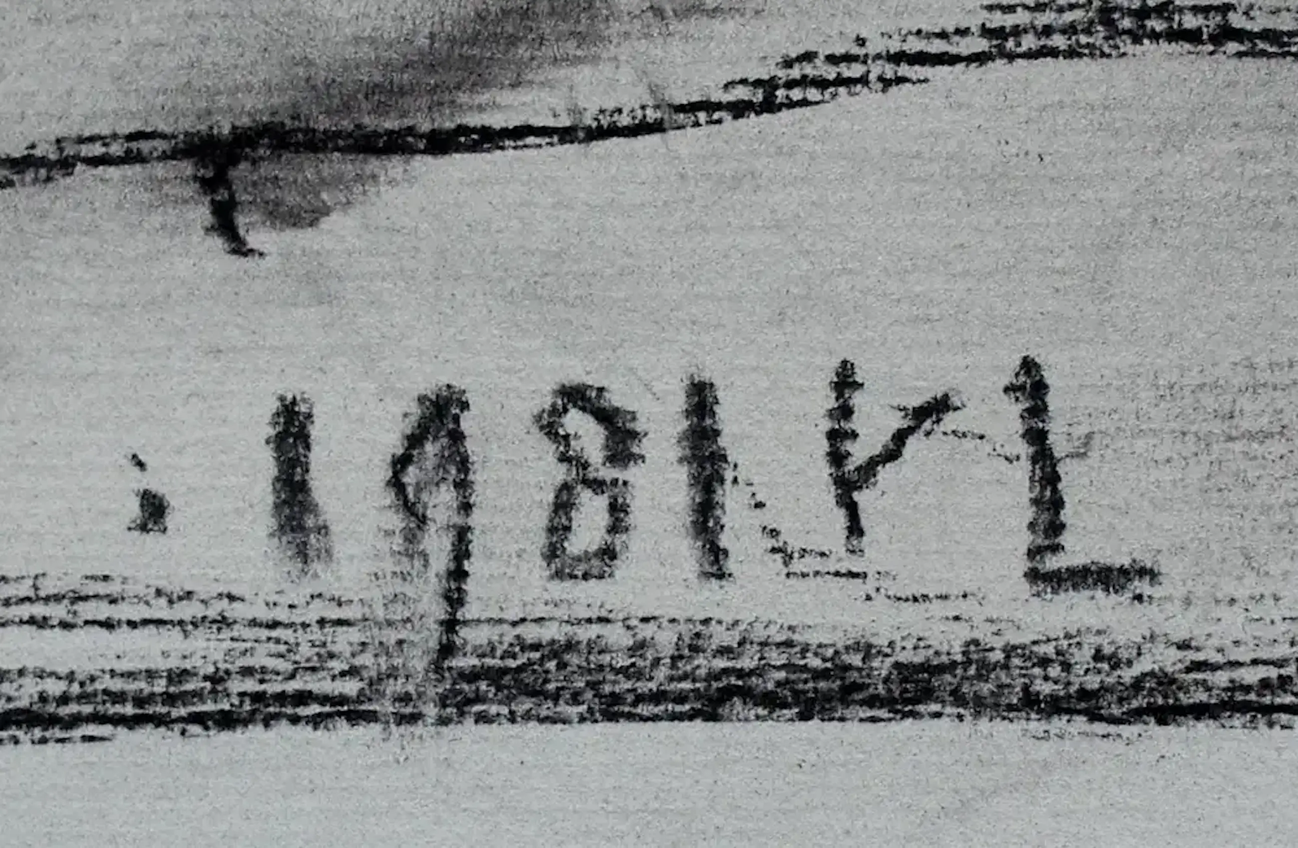 Zwarte krijttekening van de pas overleden kunstenaar Reinier Lucassen. Afmetingen blad: H55.5 x b43cm. Het werk is midden onderaan, gemonogrammeerd en gedateerd in potlood. De authenticiteit van het aangeboden werk wordt volledig gegarandeerd. Een certificaat van echtheid kan, op aanvraag, worden gemaild.