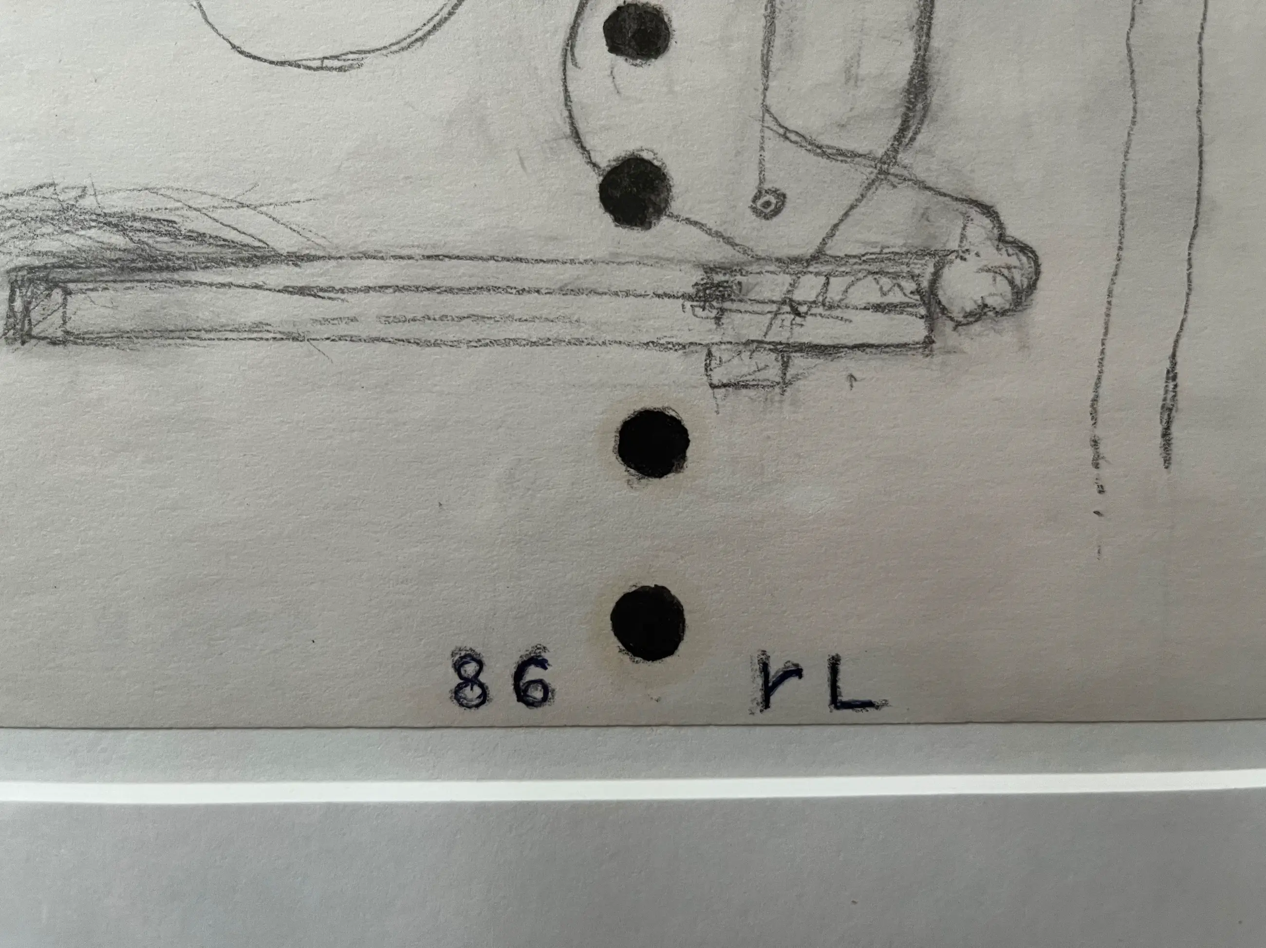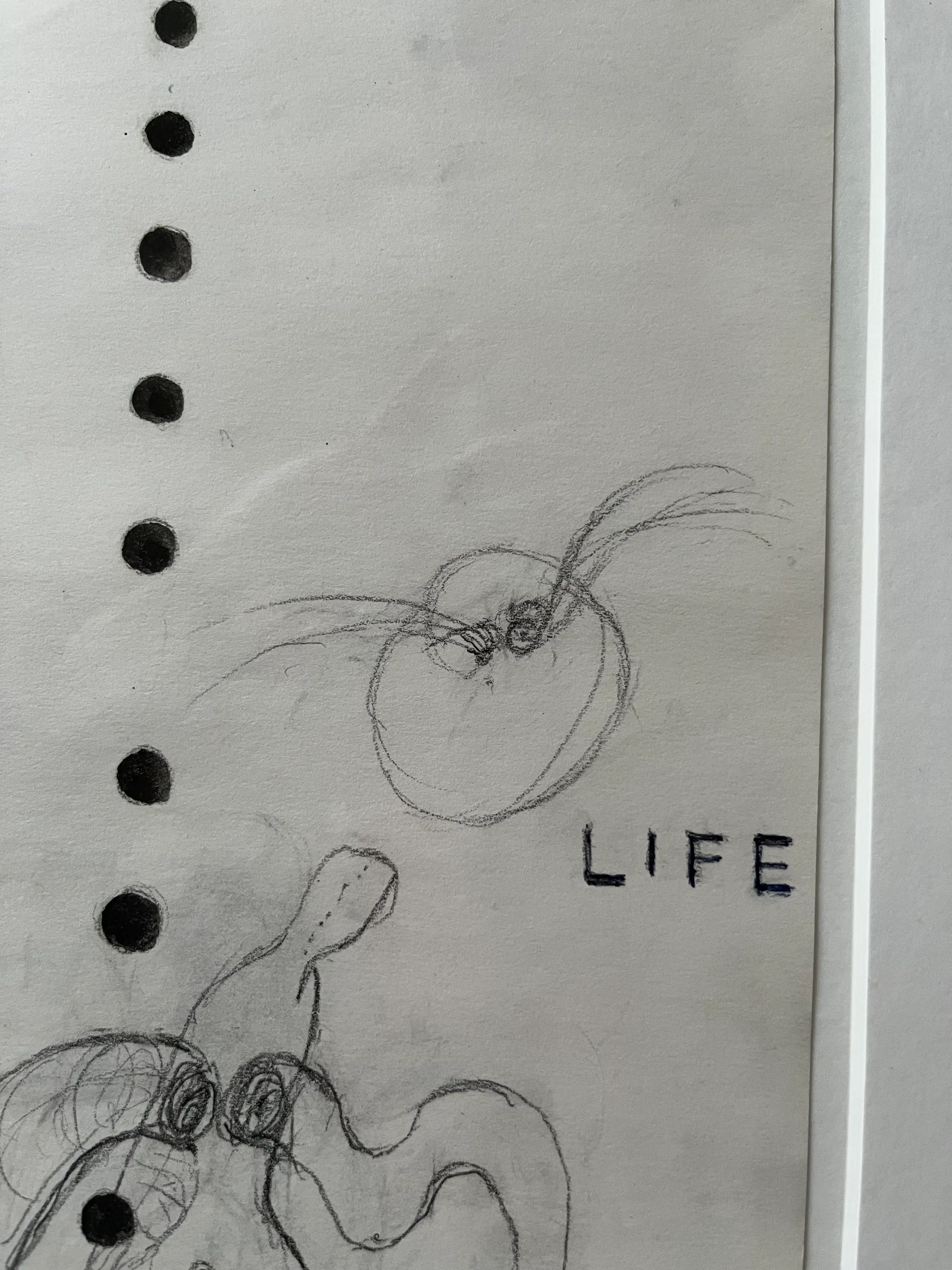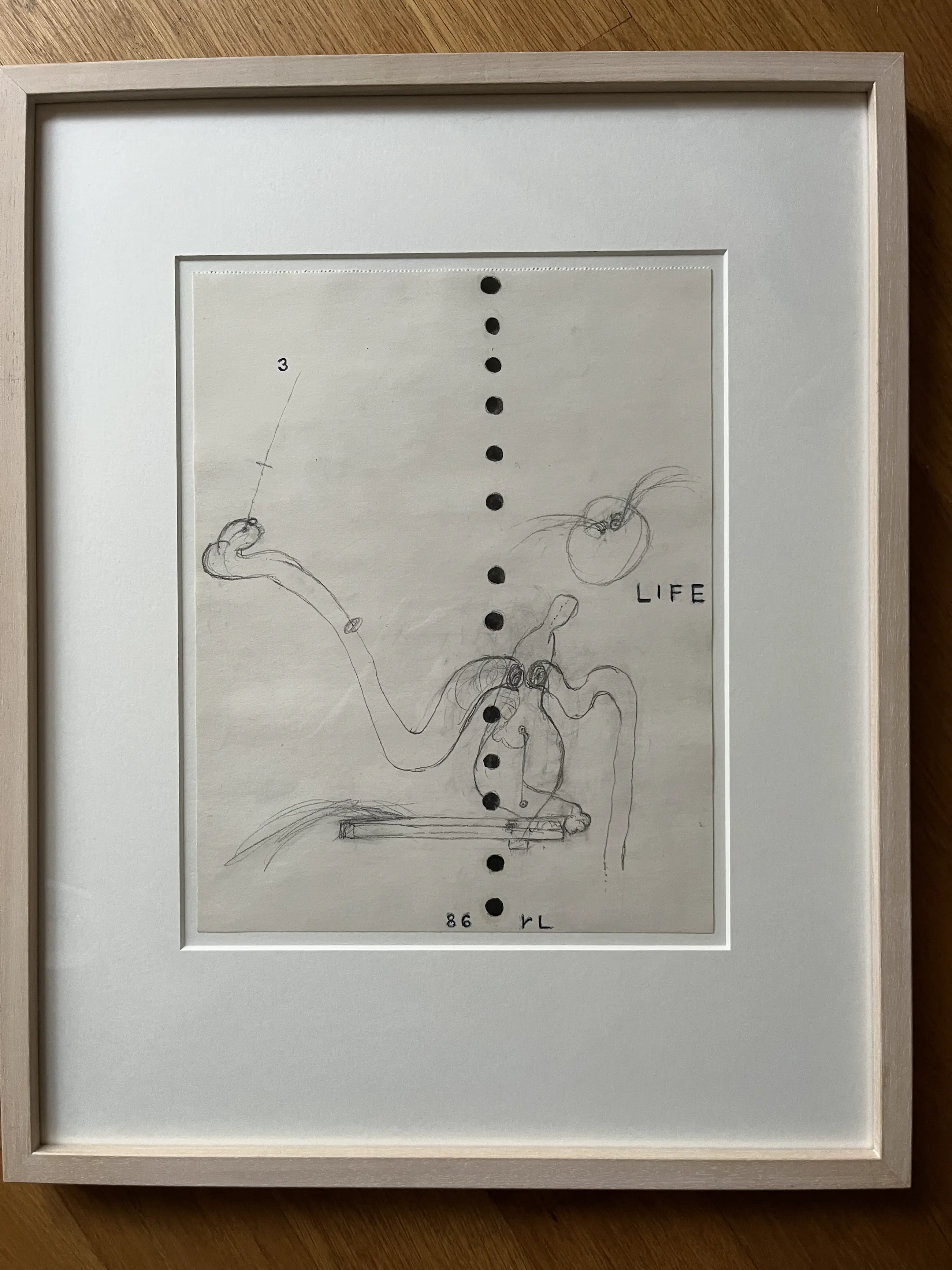 Tekening uit 1986 gesigneerd met initialen. Komt uit goede collectie. Werk is gelijst in witgewassen houten lijst. Afmeting tekening 30,5 x 24 cm. Inclusief lijst 51,5 x 41,5 cm.