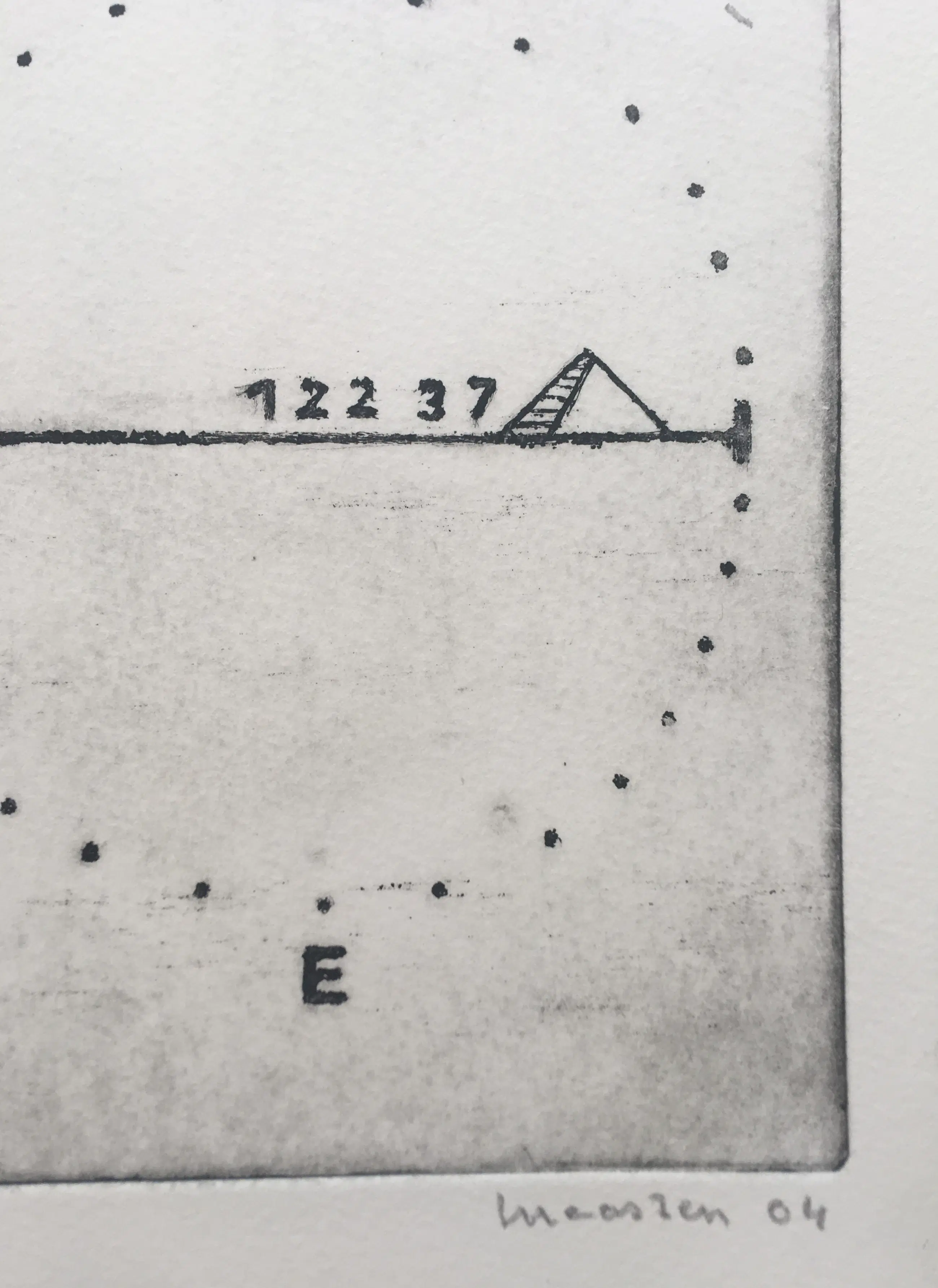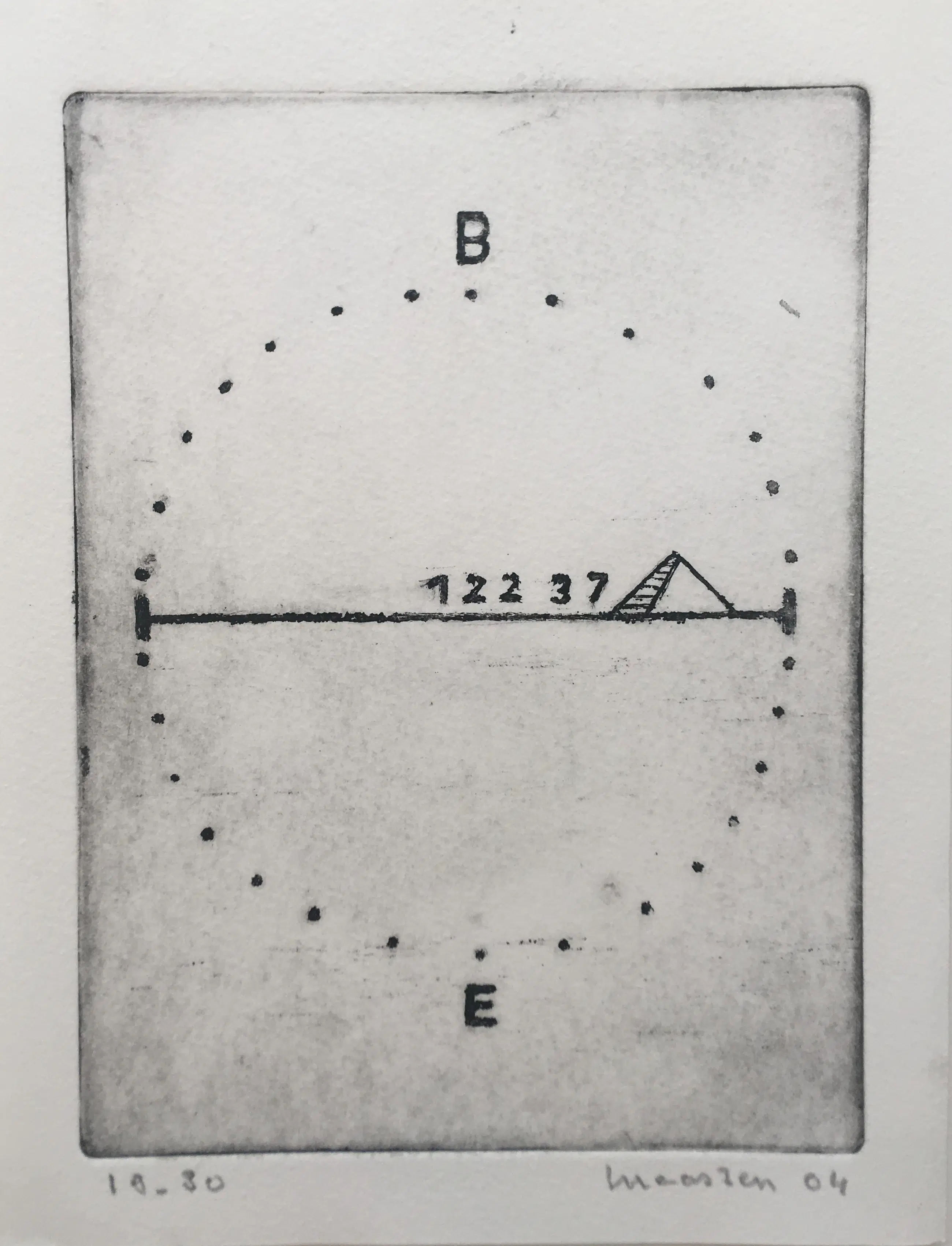 Een fraaie, karakteristieke compositie van Reinier Lucassen. Ets op geschept papier, met potlood gesigneerd, gedateerd (’04) en genummerd 30 ex. Afmetingen: 24cm x 18cm (blad)