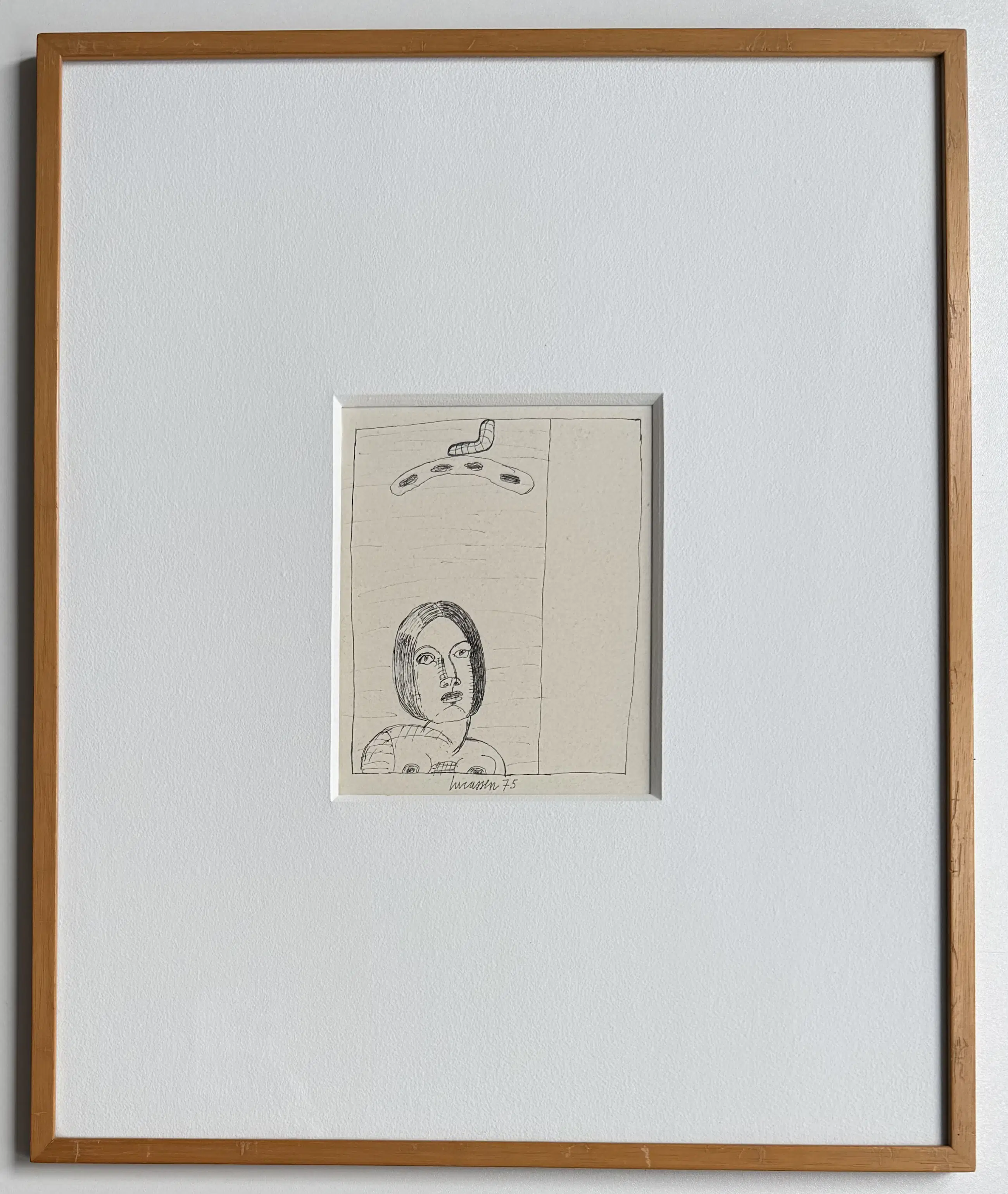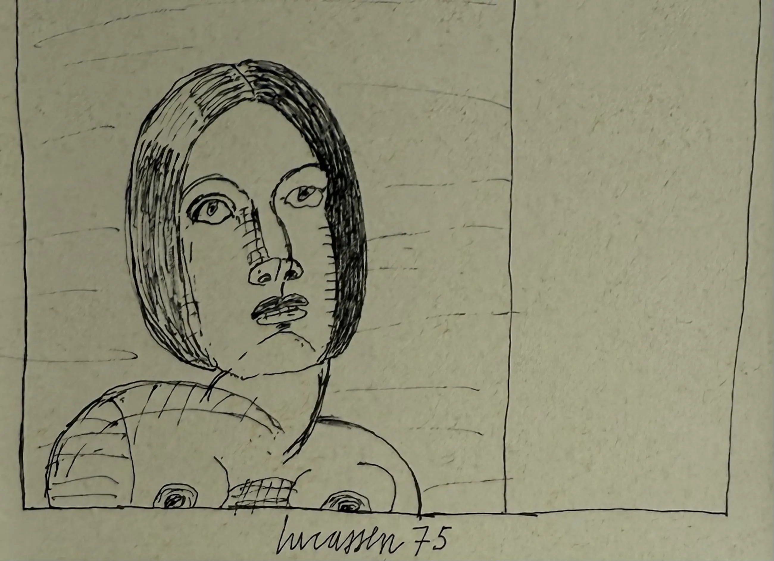 Fraaie pentekening in zwarte inkt, in de kenmerkende stijl van Reinier Lucassen, getiteld Jolanda. Langs de onderste rand gesigneerd en gedateerd (1975).