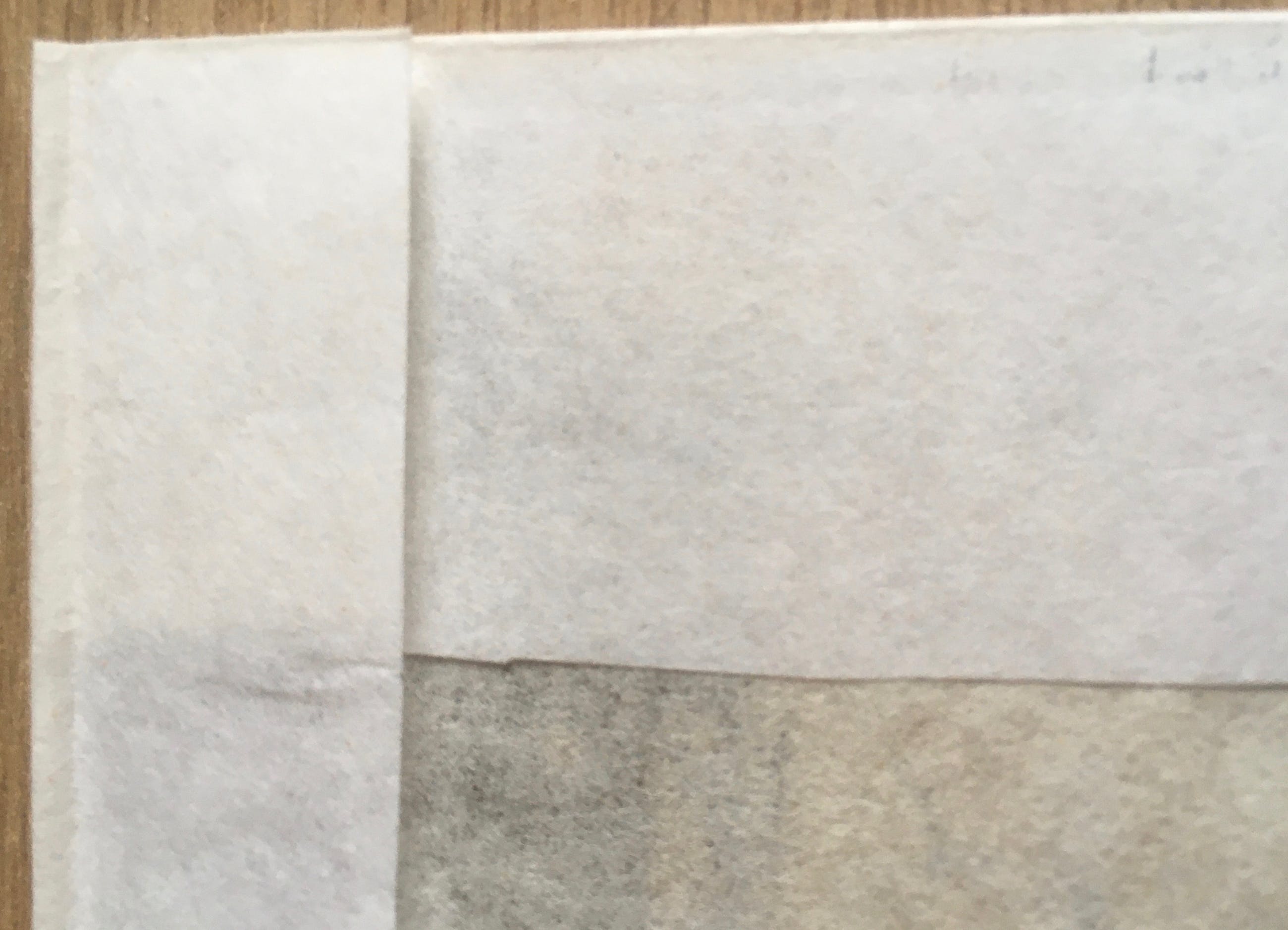 | Het werk was eerder ingelijst in een standaardlijst (50x40 cm), zonder passepartout. Daarvoor zijn de marges van het papier naar achteren gevouwen.Op de vouw onderaan bevindt zich een klein scheurtje dat gemakkelijk door een lijst of passe-partout aan het zicht kan worden onttrokken. | |||||