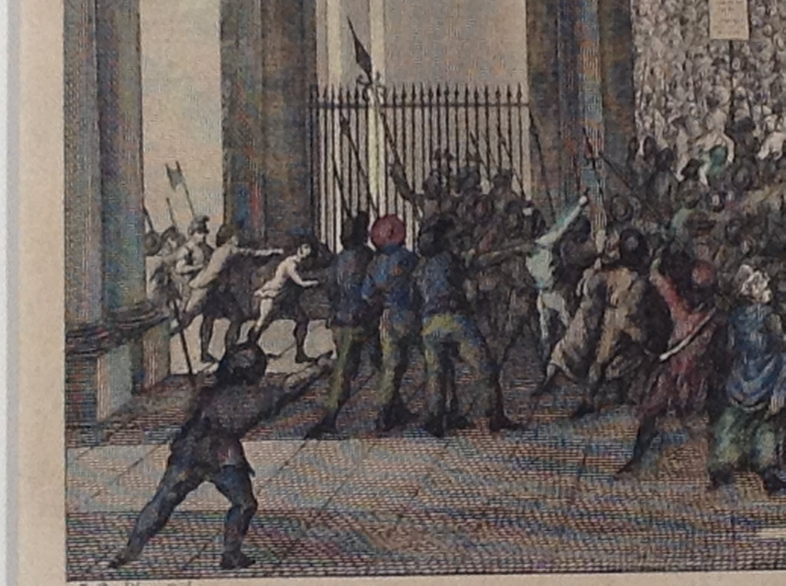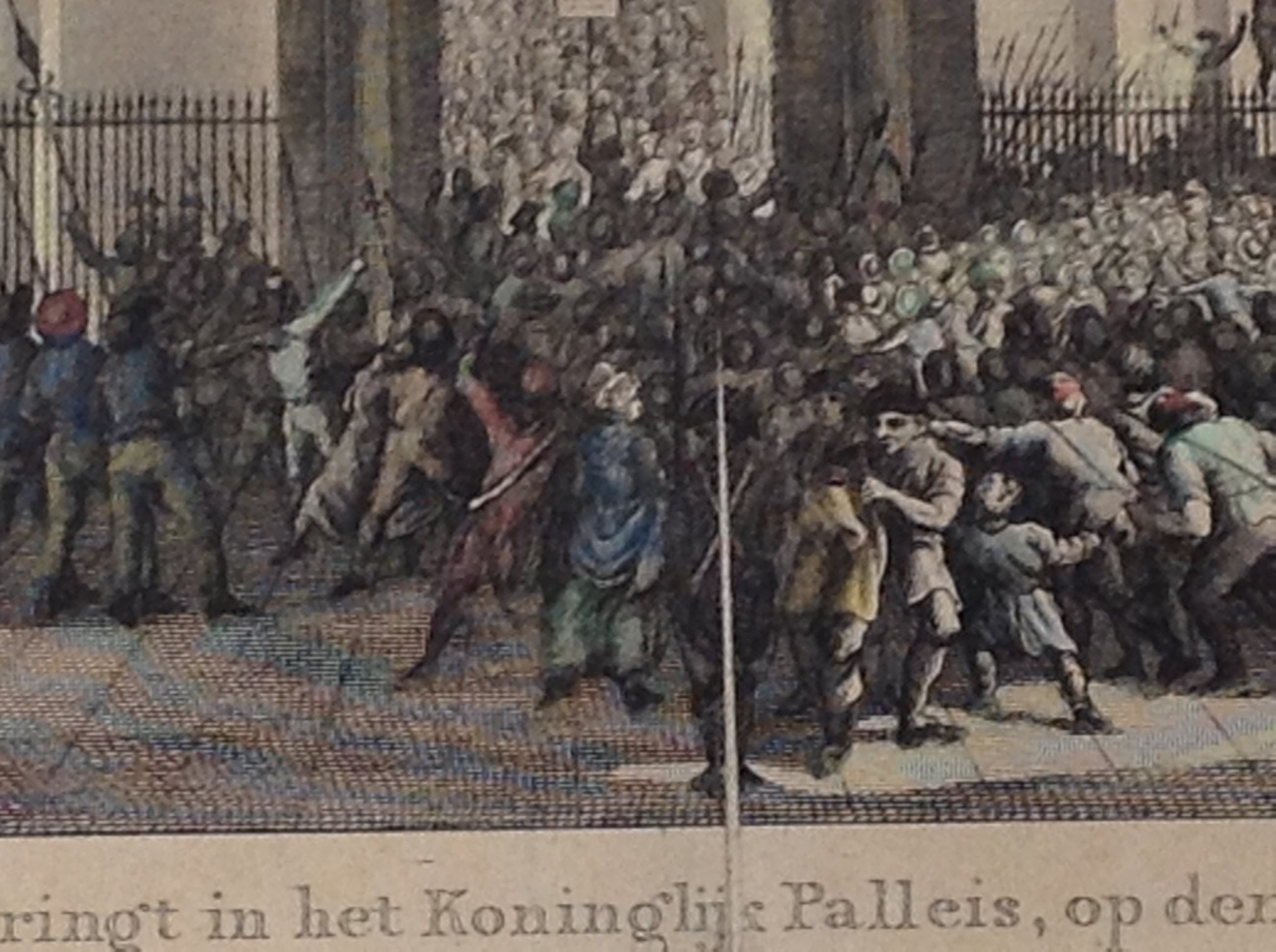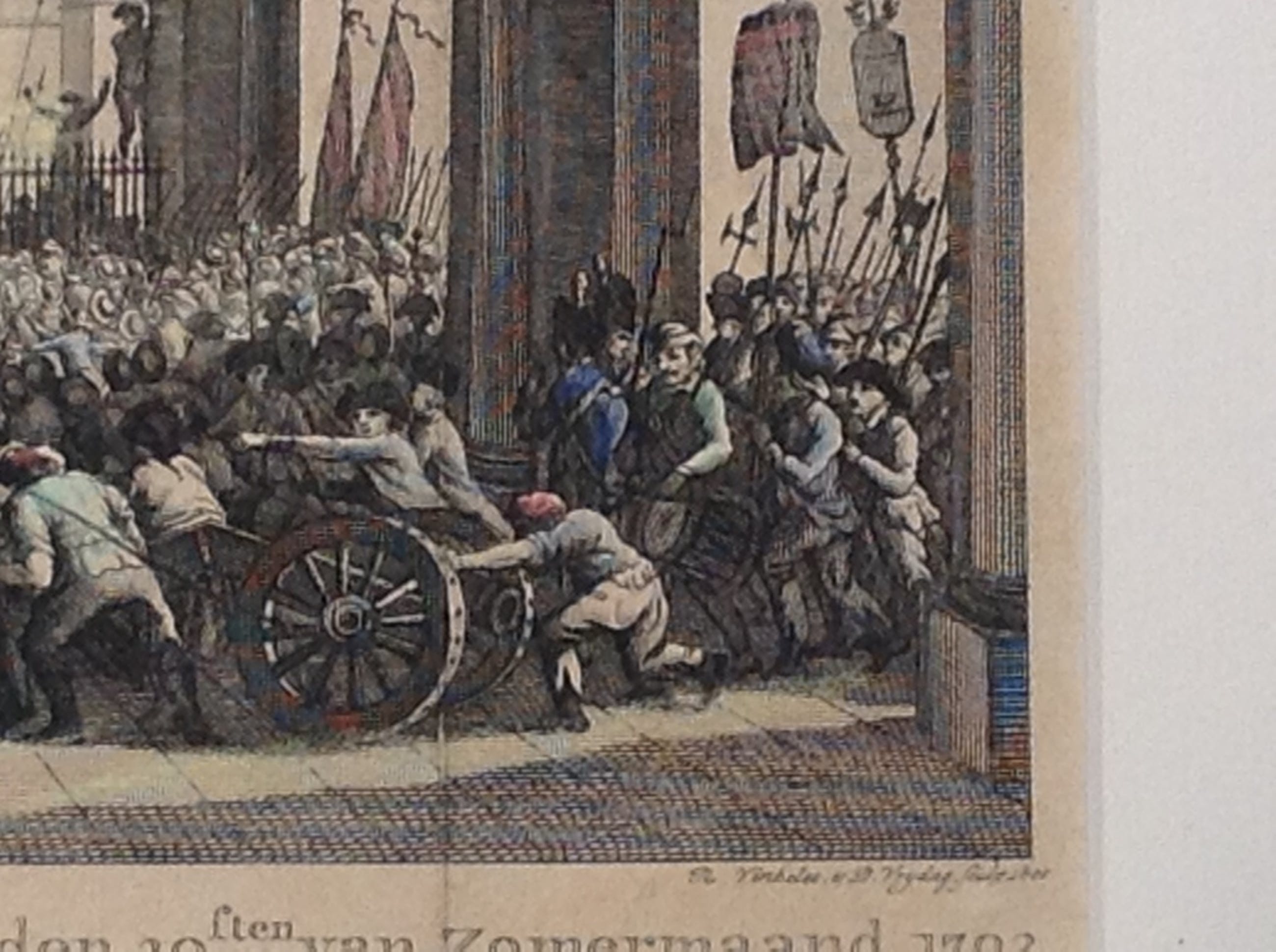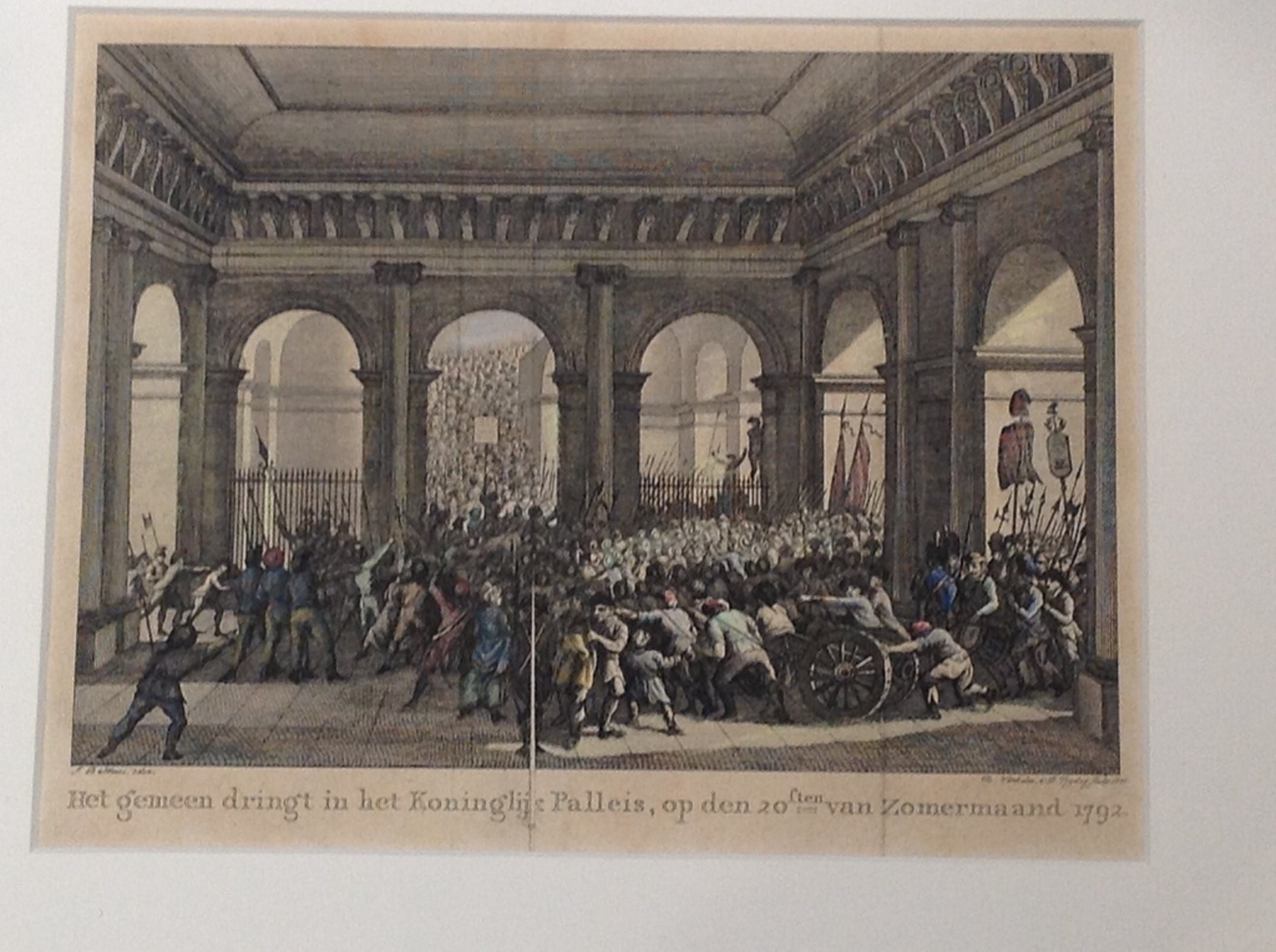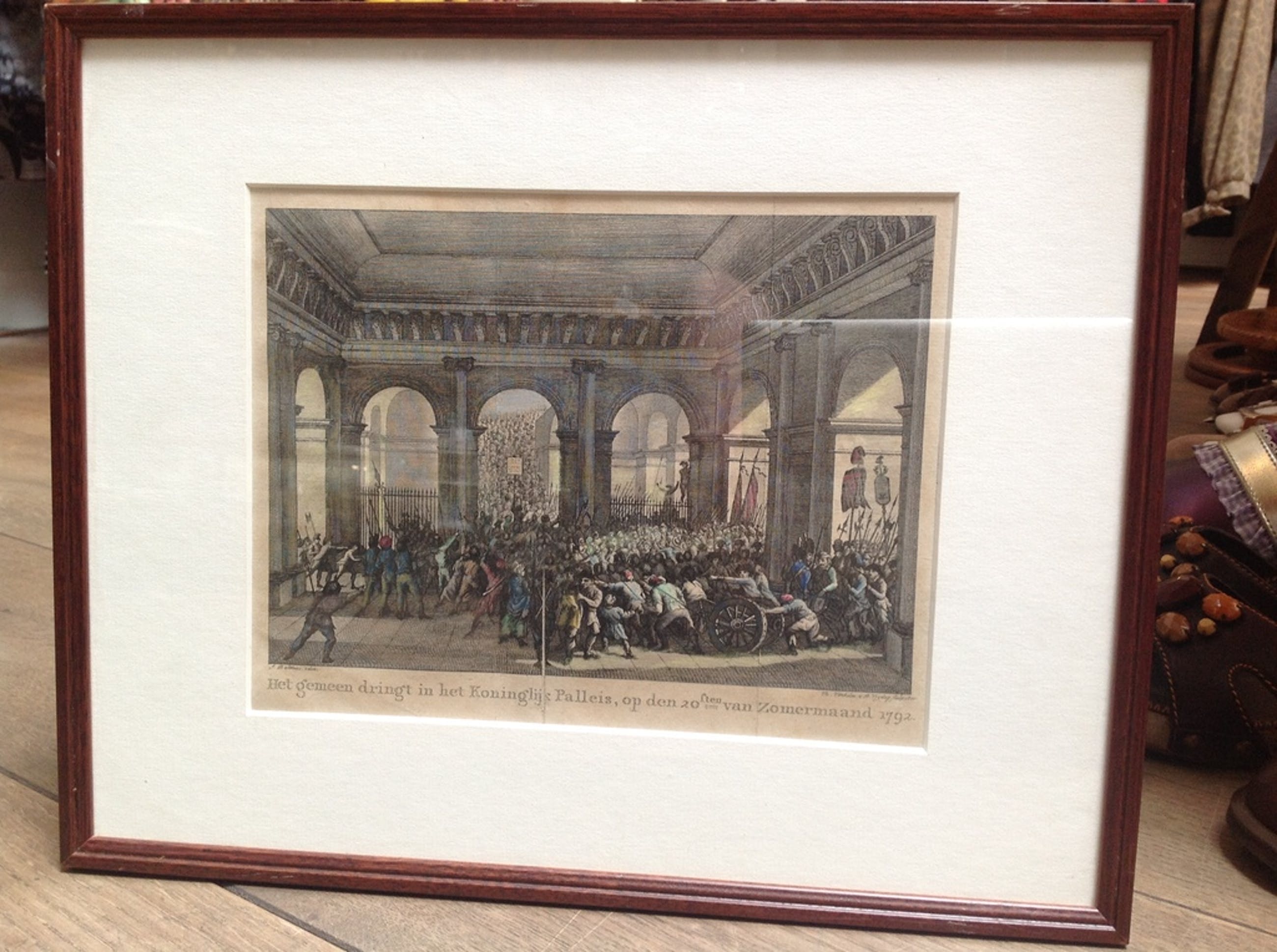 De volledige titel van dit werk luidt: 'Het gemeen dringt in het Koninglijk Palleis, op den 20sten van Zomermaand 1792'. Gemaakt in 1800 en licht ingekleurd. Afmetingen: prent h 20,3 cm × b 23,3 cm, lijst 29,5 x 36,5 cm. Ingelijst in moderne houten lijst met passe-partout achter glas. in goede conditie.