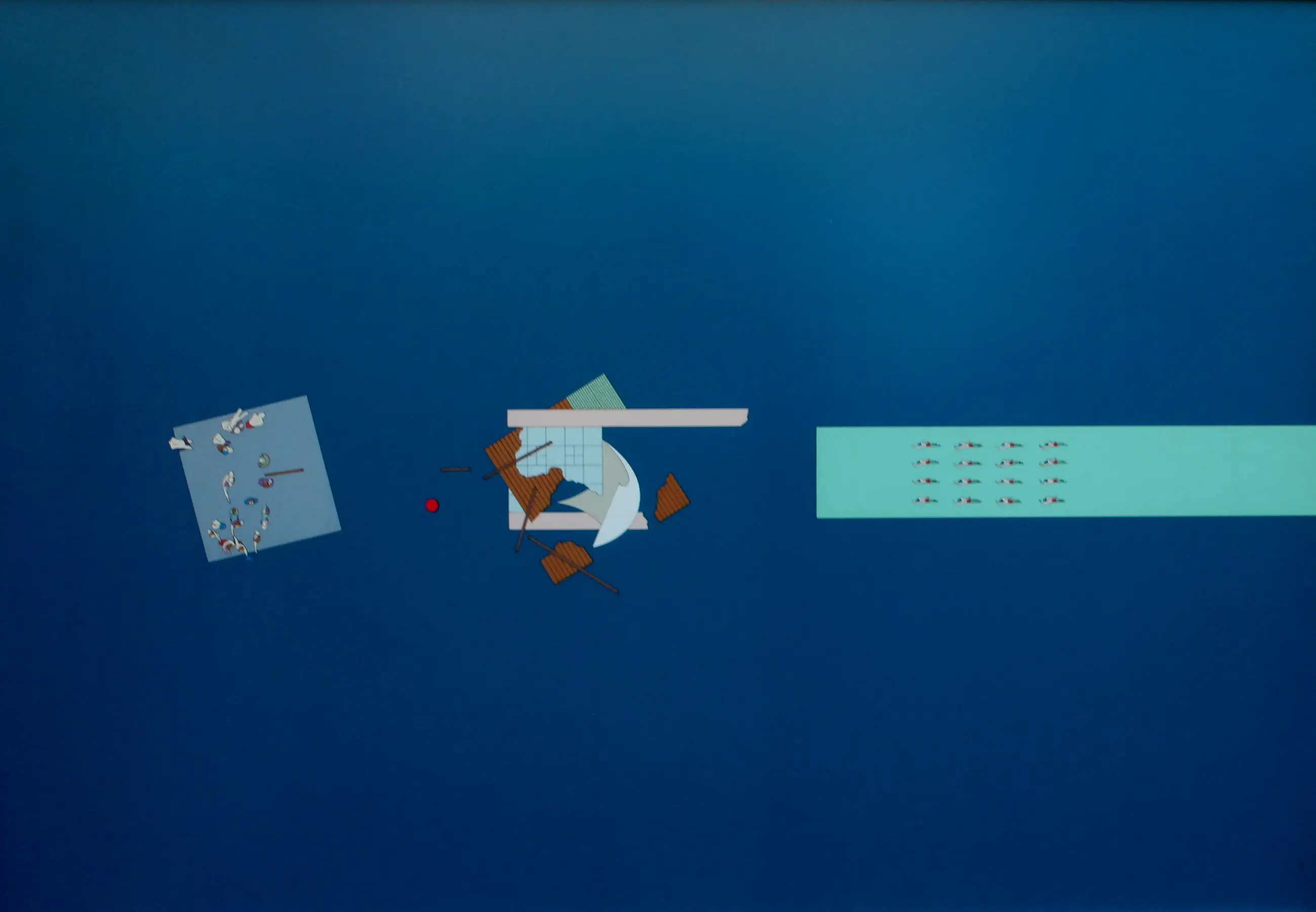 Ingelijste zeefdruk van Rem Koolhaas. Titel: Het drijvende zwembad. Afmetingen incl lijst: H65 x b92cm. Afmetingen voorstelling: H61 x b88cm. Het werk is niet door de kunstenaar gesigneerd.